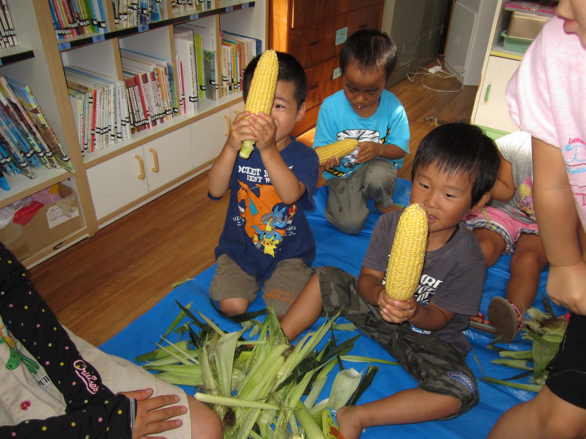 おやつに自分たちが向いたモロコシををほおばりながら、「甘いね!」「おいしいね!」と話している子ども達でした。自分たちの住んでいる信濃町で採れるトウモロコシのおいしさを忘れずにいて欲しいと思います。また、恒例の皮むきでも、自分達で準備や片付けまで行うことでより食べるのを楽しみにして欲しいと思います。