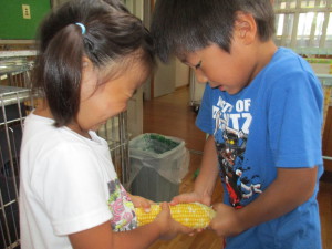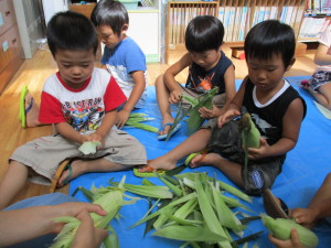 おやつに食べるトウモロコシの皮むきをしました。