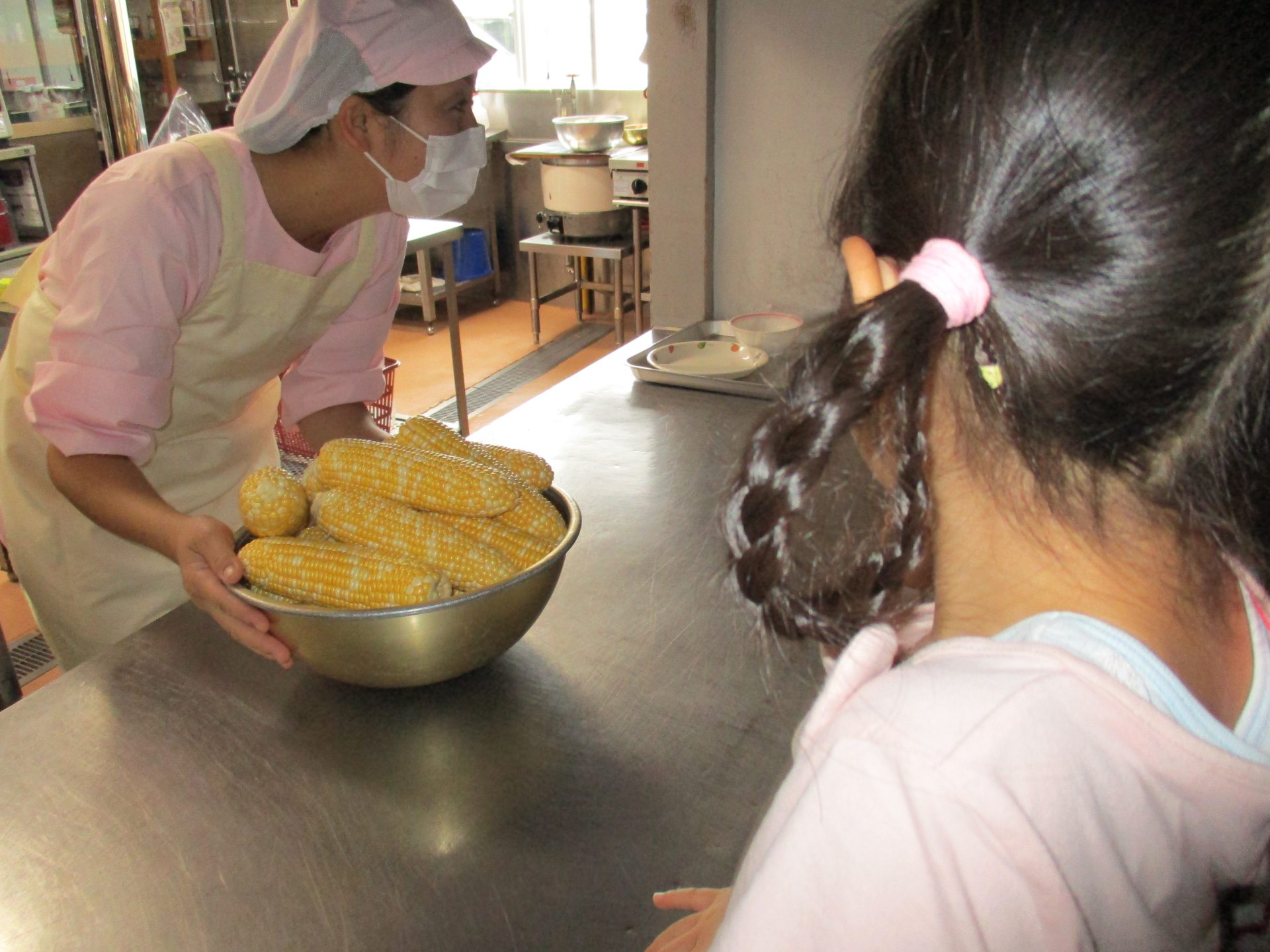 給食の先生と栄養士の先生にモロコシの名前を聞いて、「今日のは【ゆうみ】ちゃんだって!」「甘いのかなぁ?おやつ楽しみだね!」と話す子ども達でした。