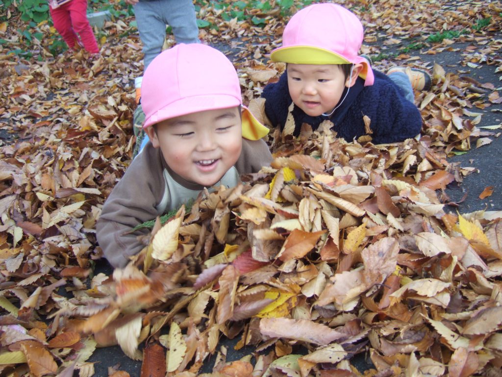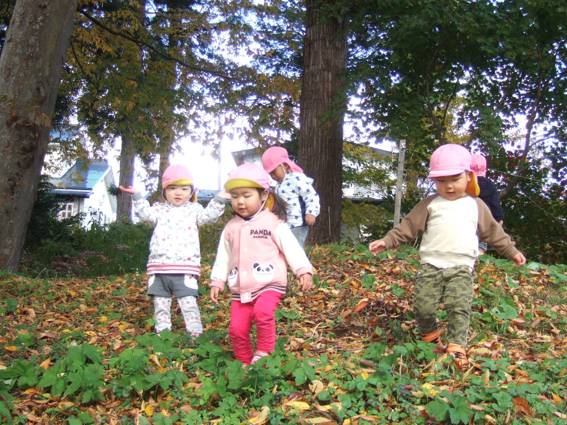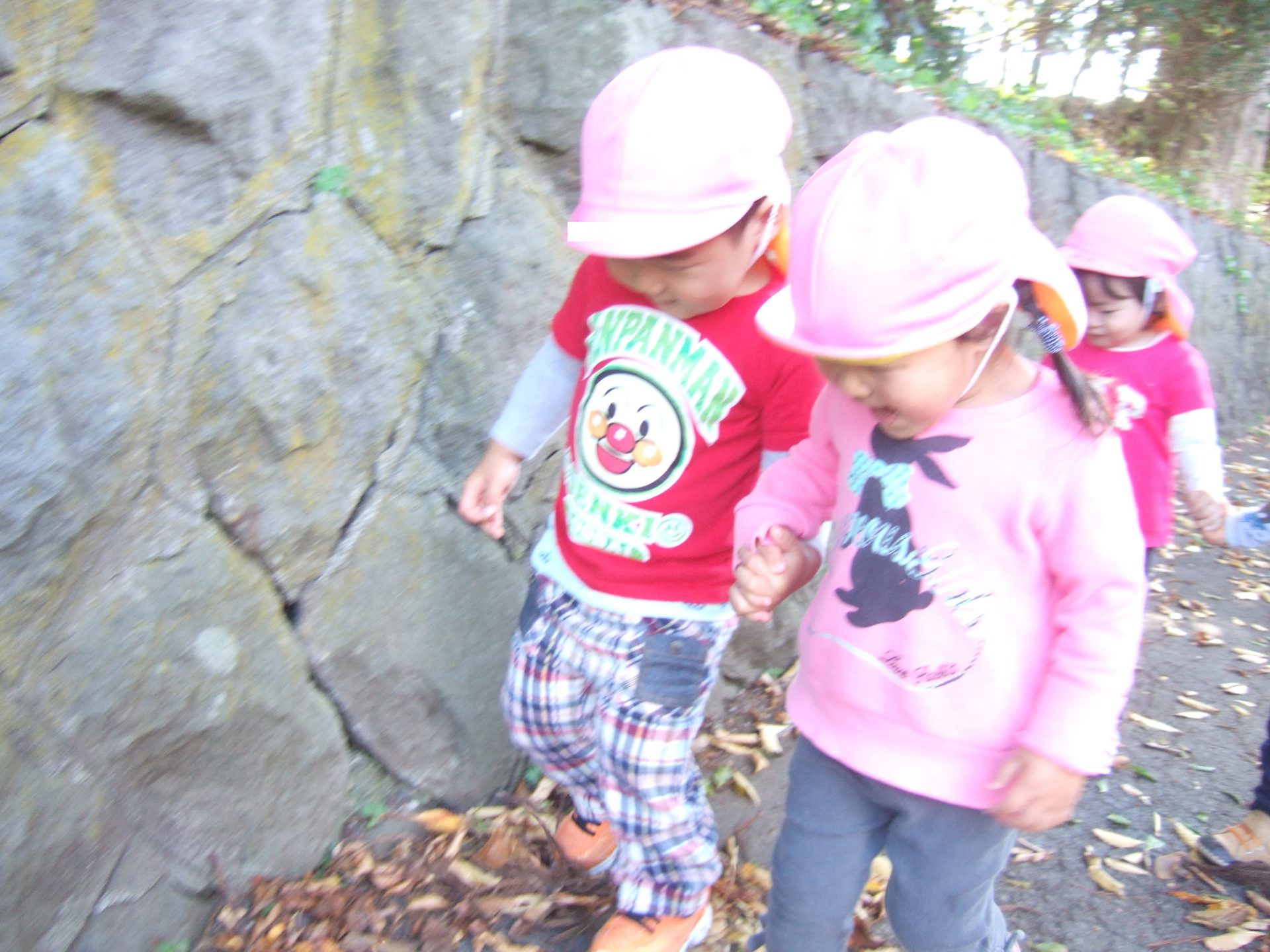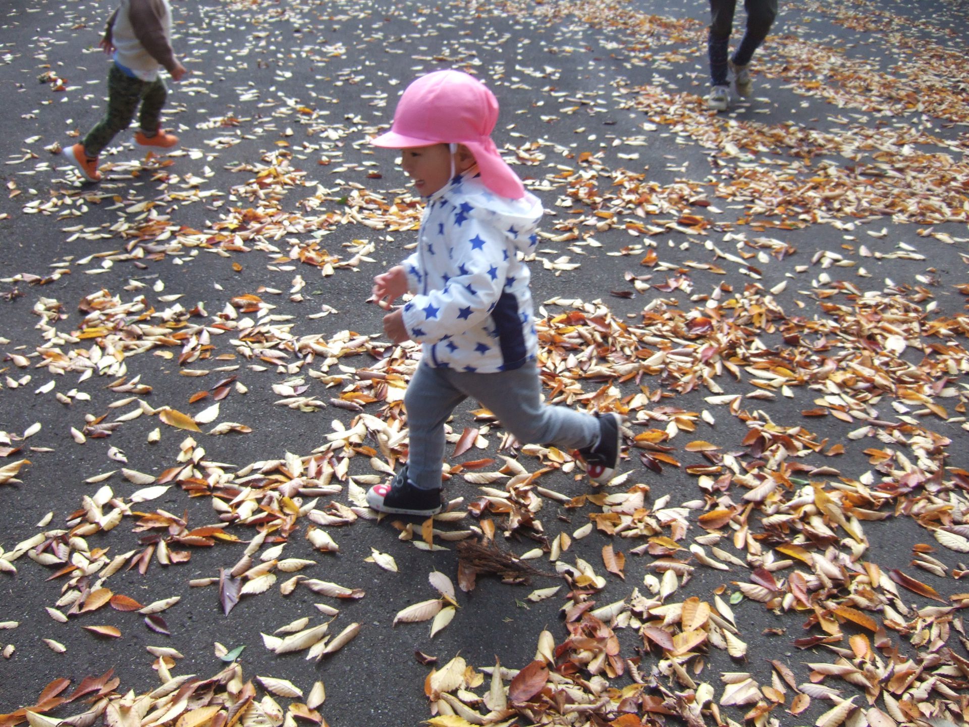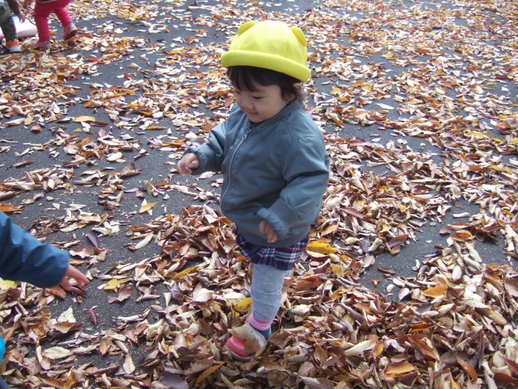 お友達と手をつないで歩いていくと木の葉がたくさん落ちていました。
