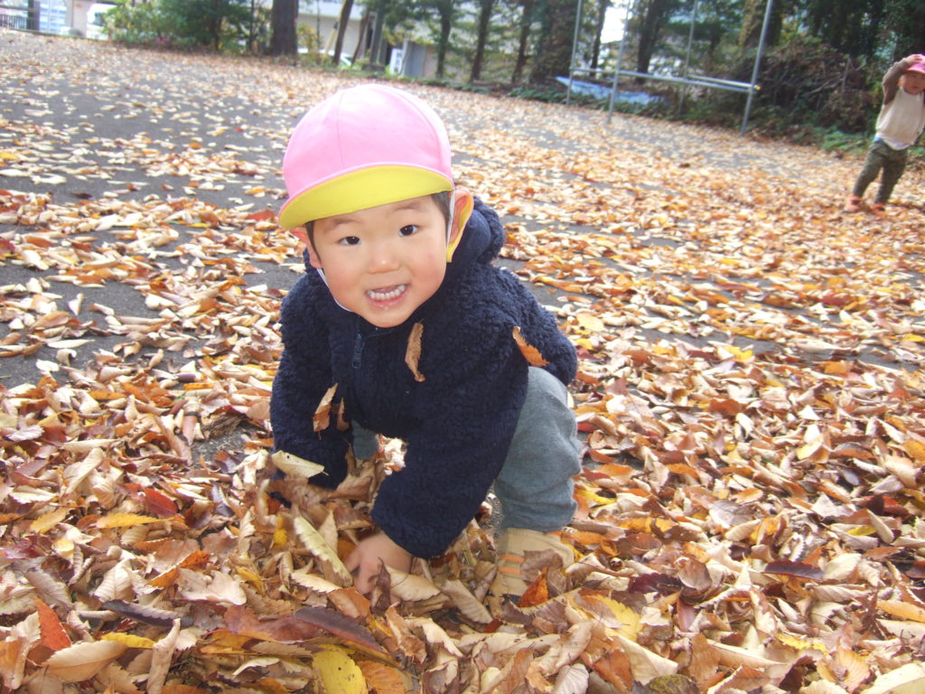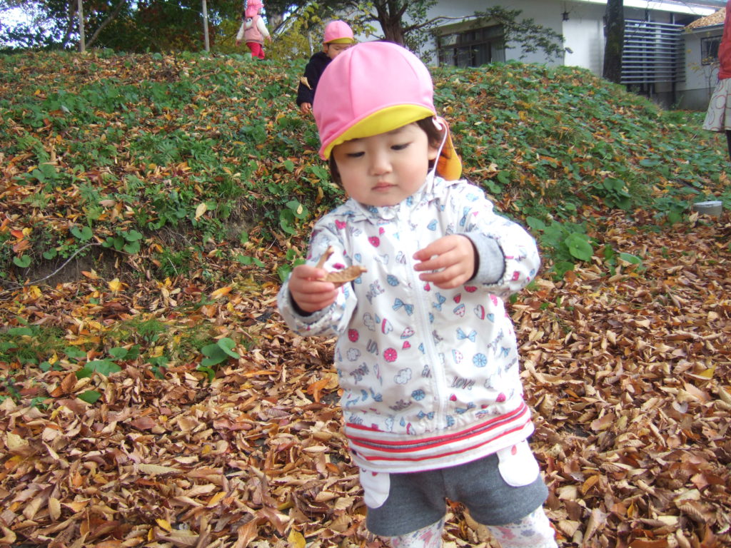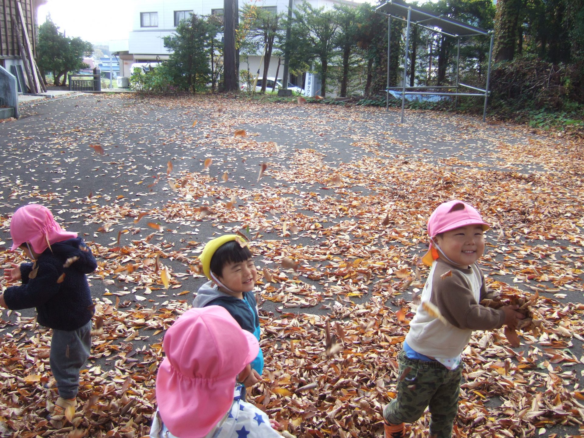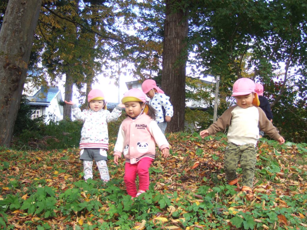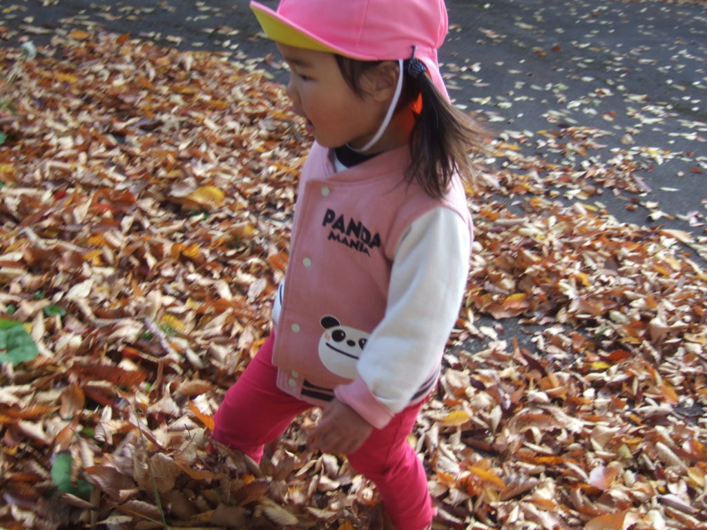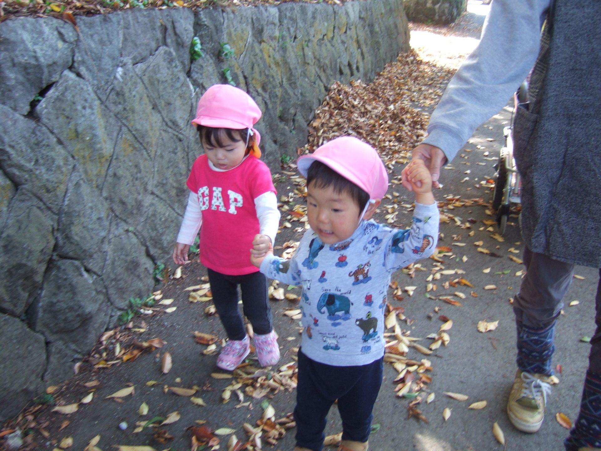 お友達と手をつないで歩いていくと木の葉がたくさん落ちていました。
