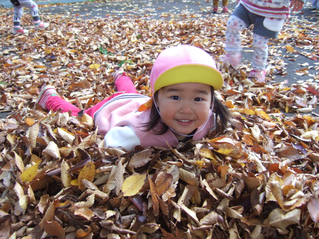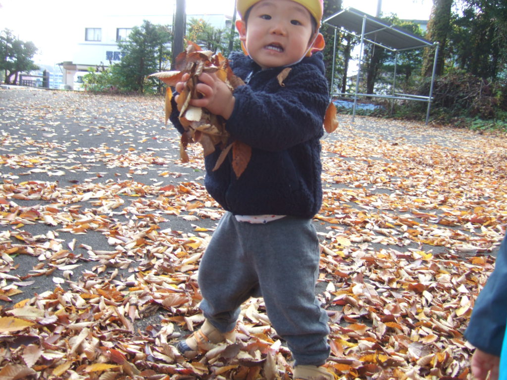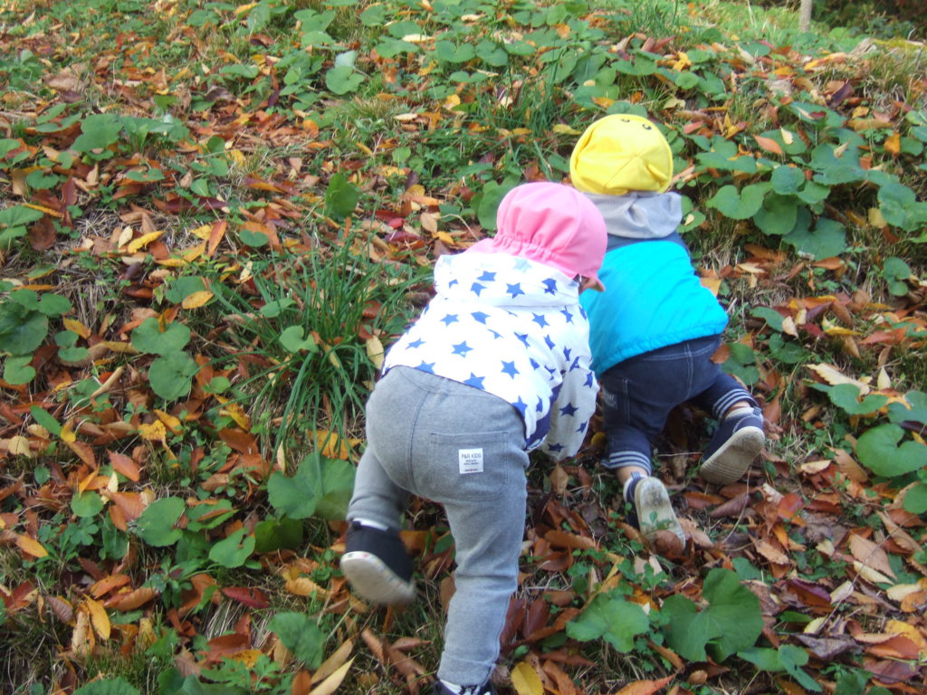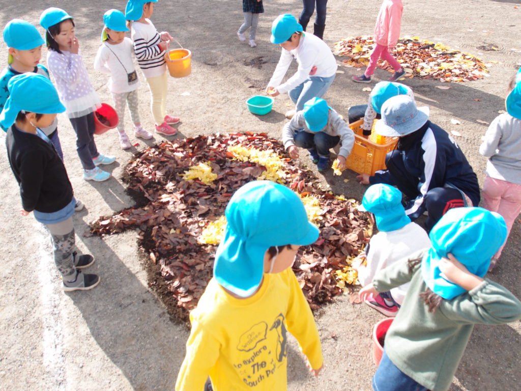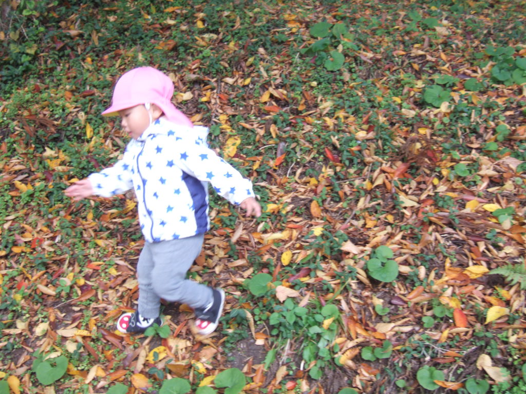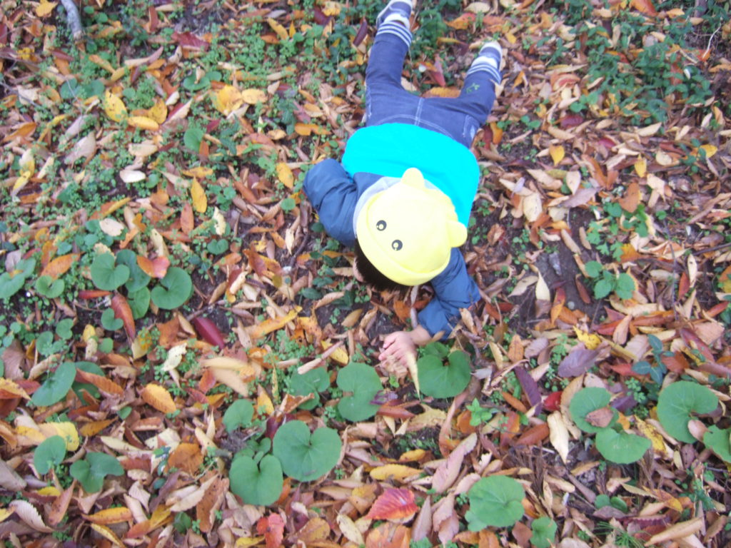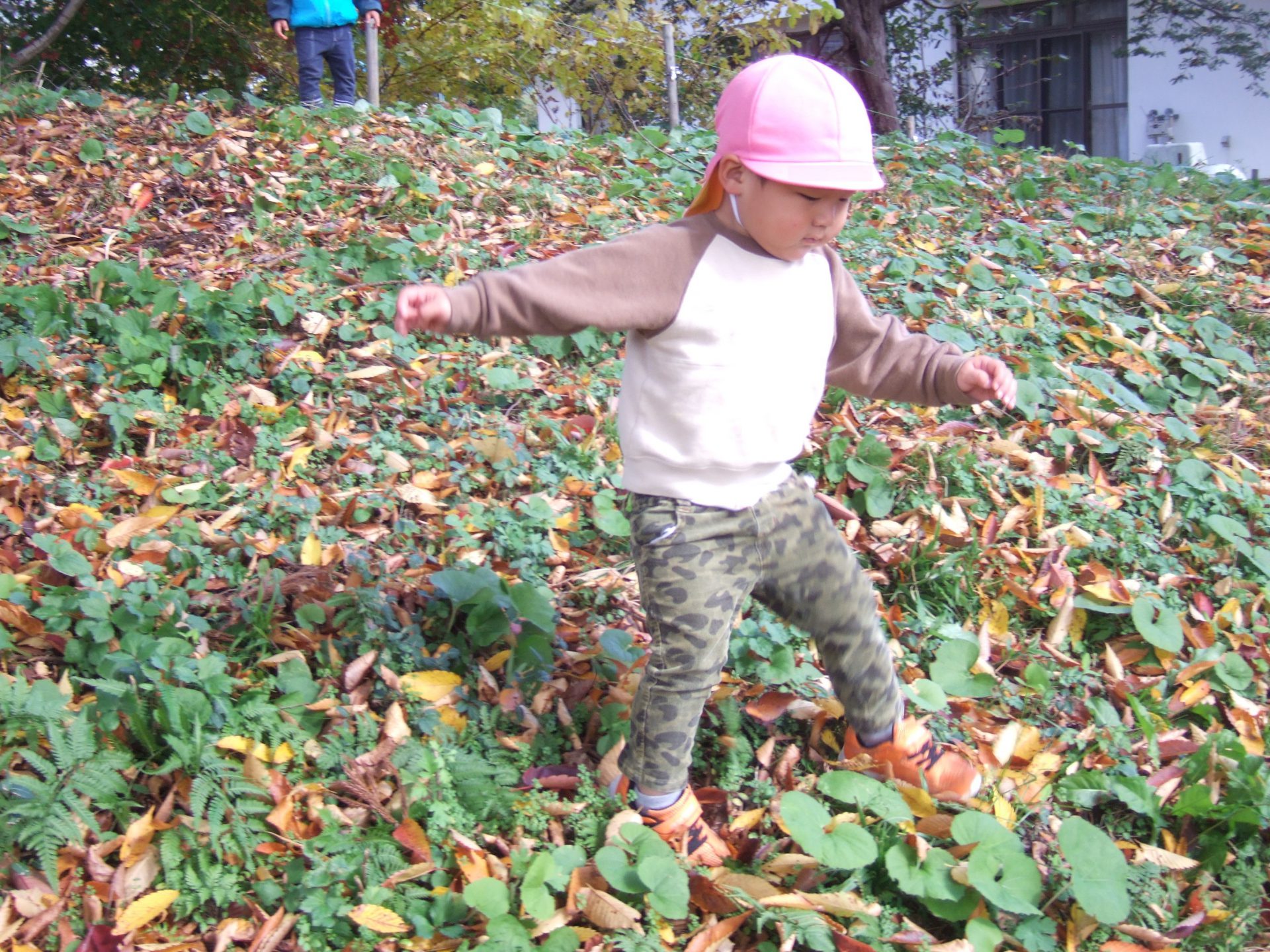 お友達と手をつないで歩いていくと木の葉がたくさん落ちていました。