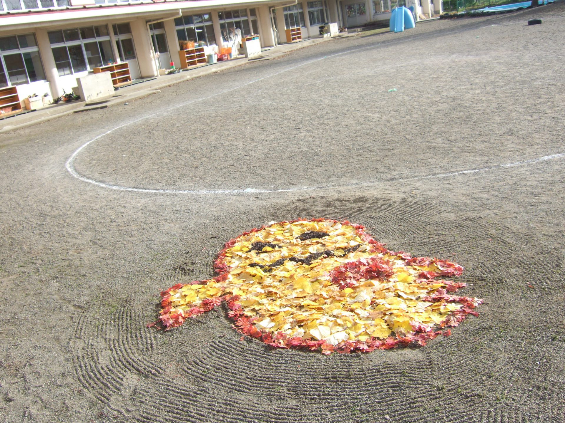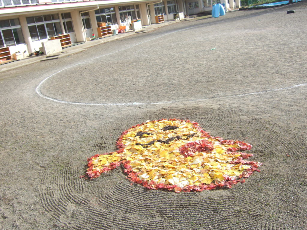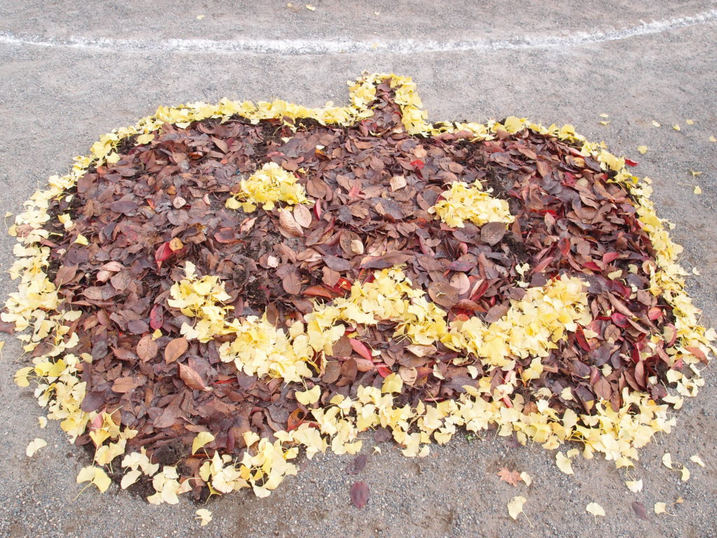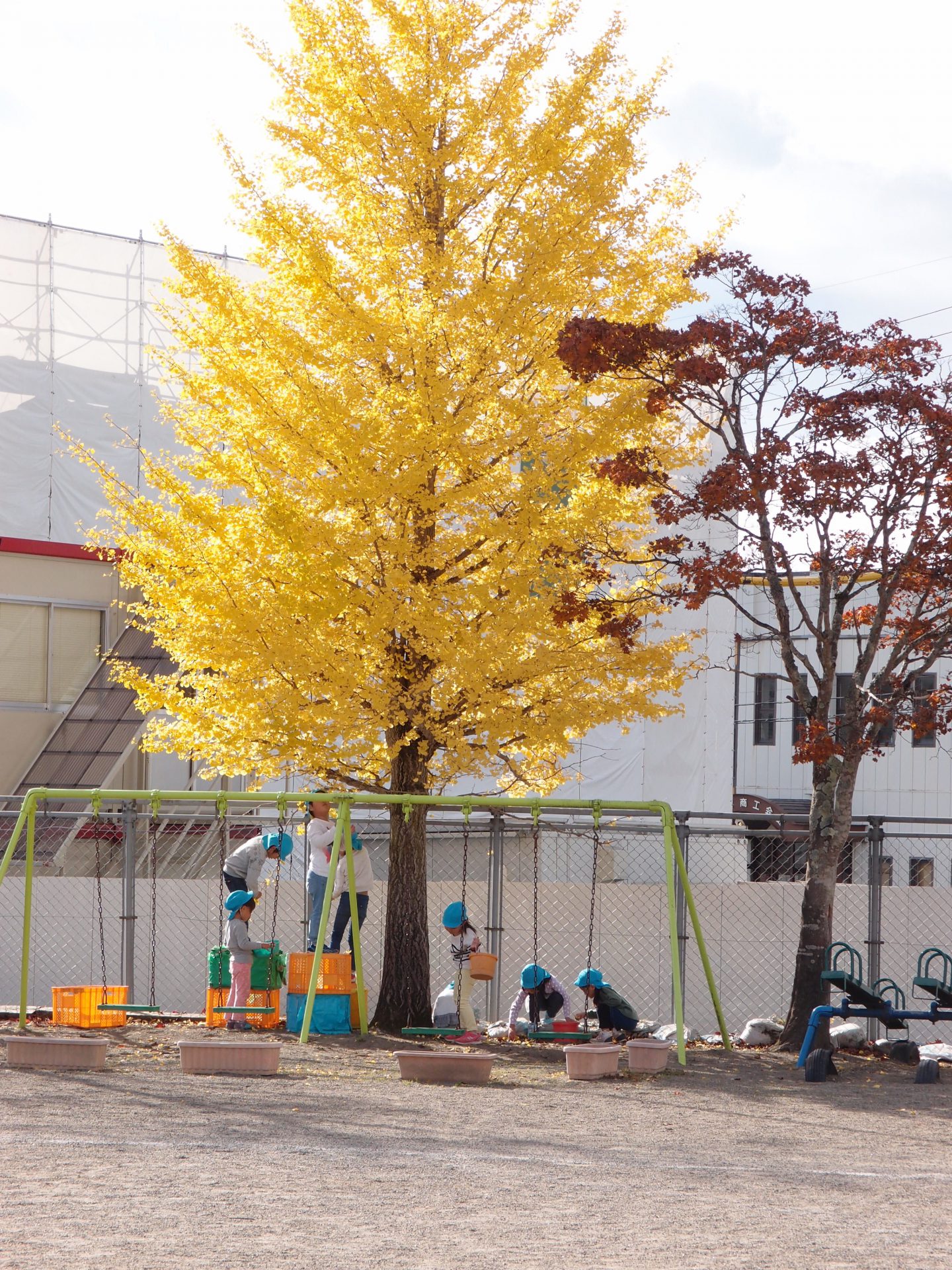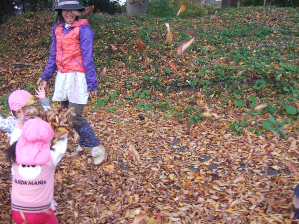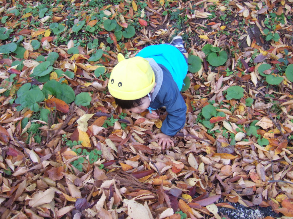 お友達と手をつないで歩いていくと木の葉がたくさん落ちていました。