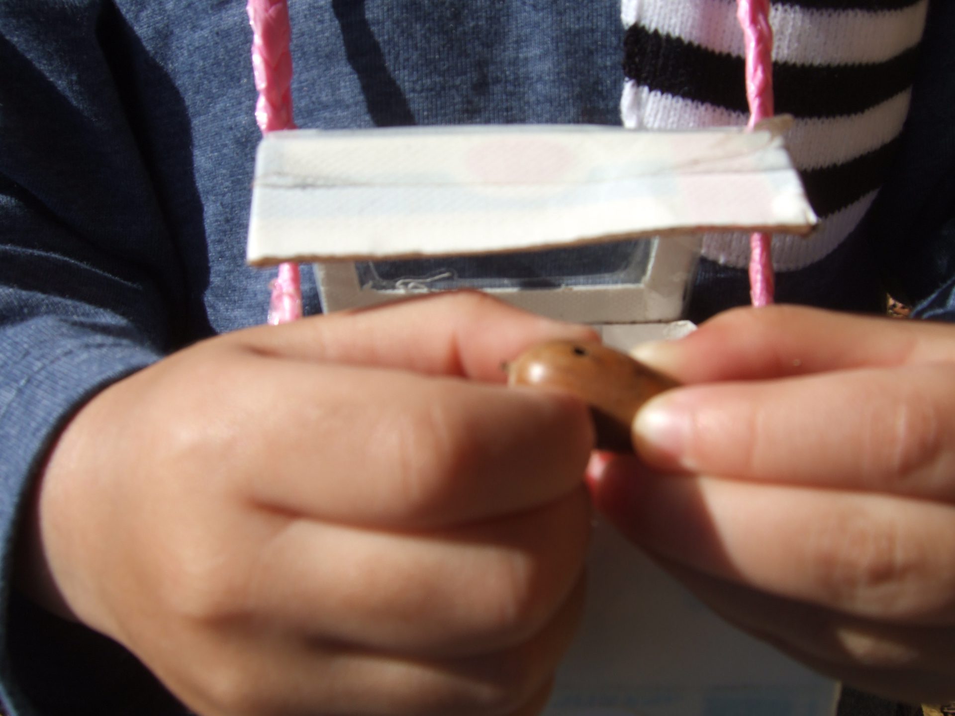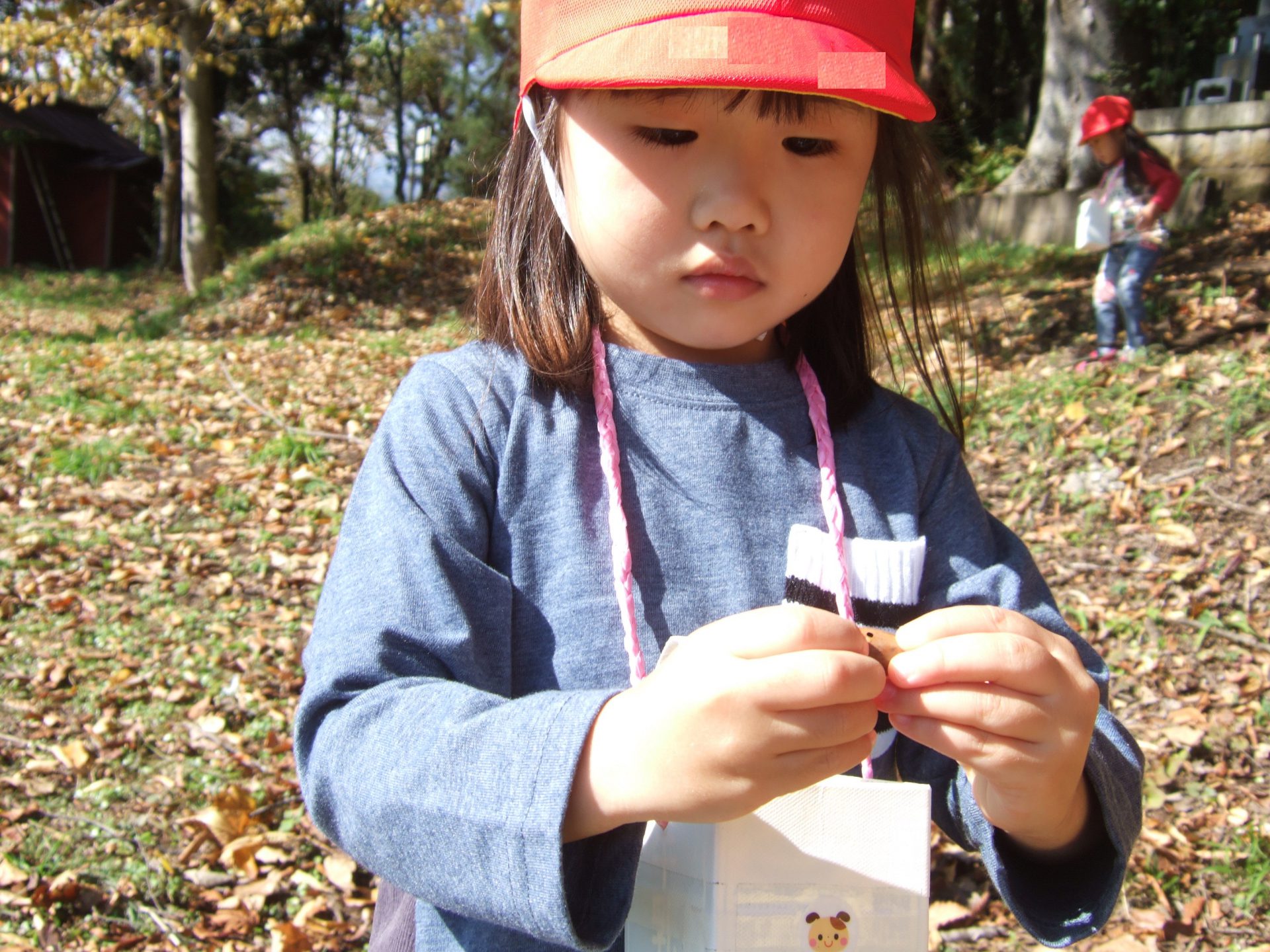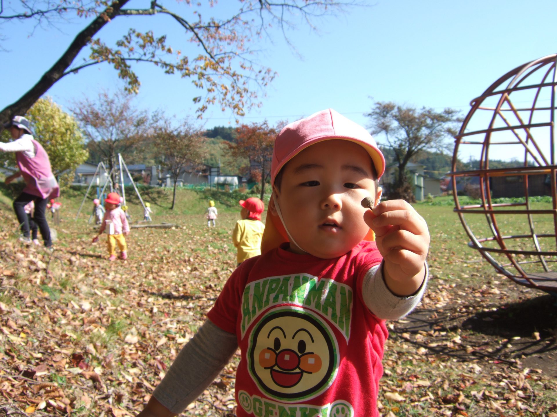 先に遊んでいた2歳児のさくらんぼさんがどんぐりを見せにきてくれましたが普通のどんぐりではありません。