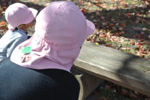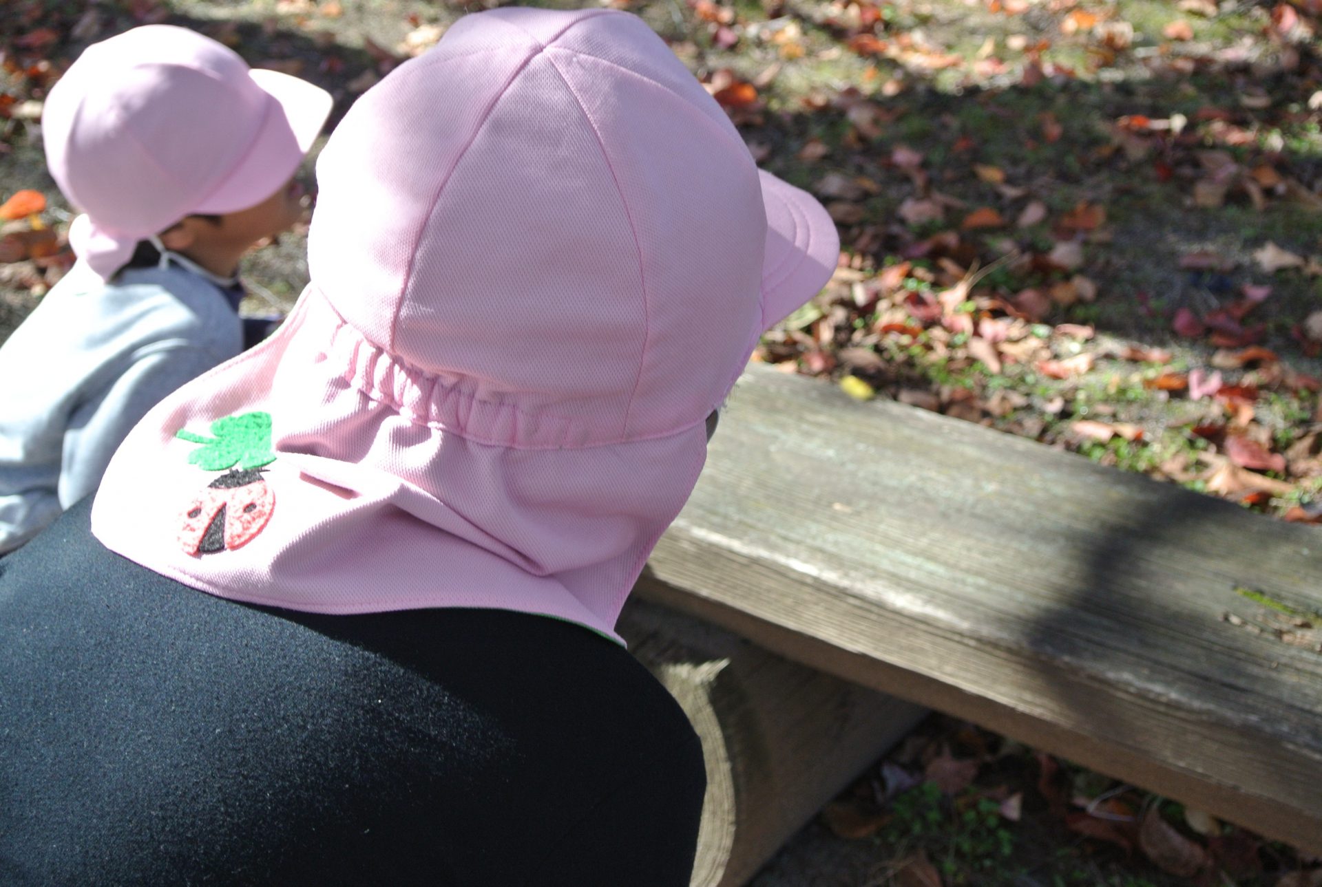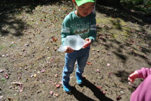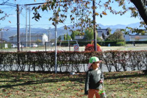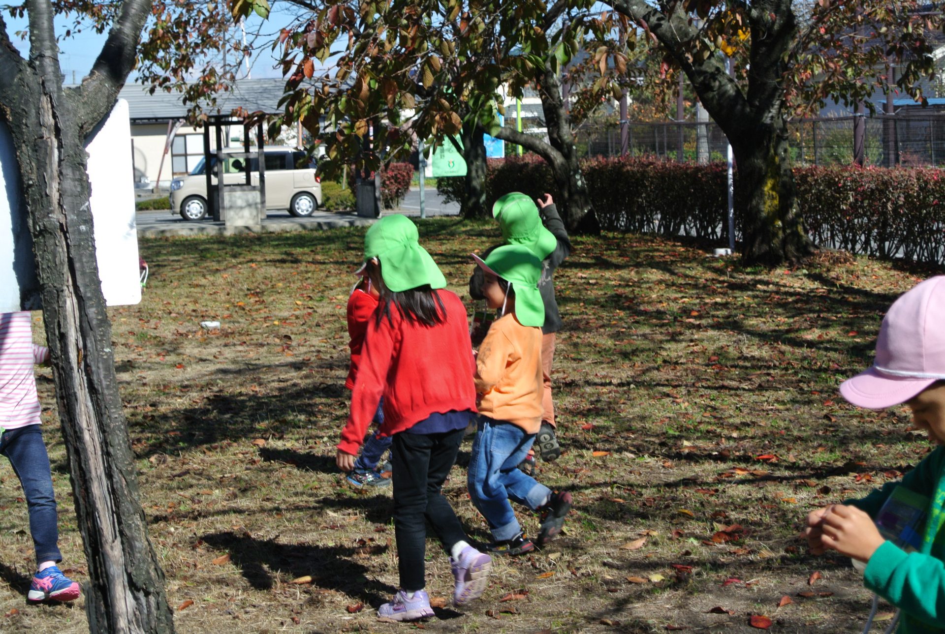 風が吹くたびに大きな木から葉がひらひらと落ちてくる様子に『ほら、風が吹いて葉っぱが落ちてくるよ』と風を感じている子どももいました。秋口の寒さや、風の動きを身をもって感じることができました。