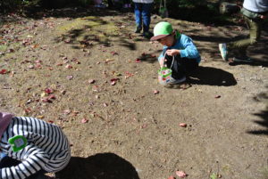 早速、紅葉した葉っぱやどんぐりを探し始める子どもたちです。