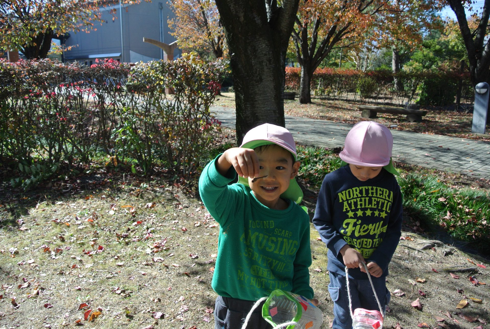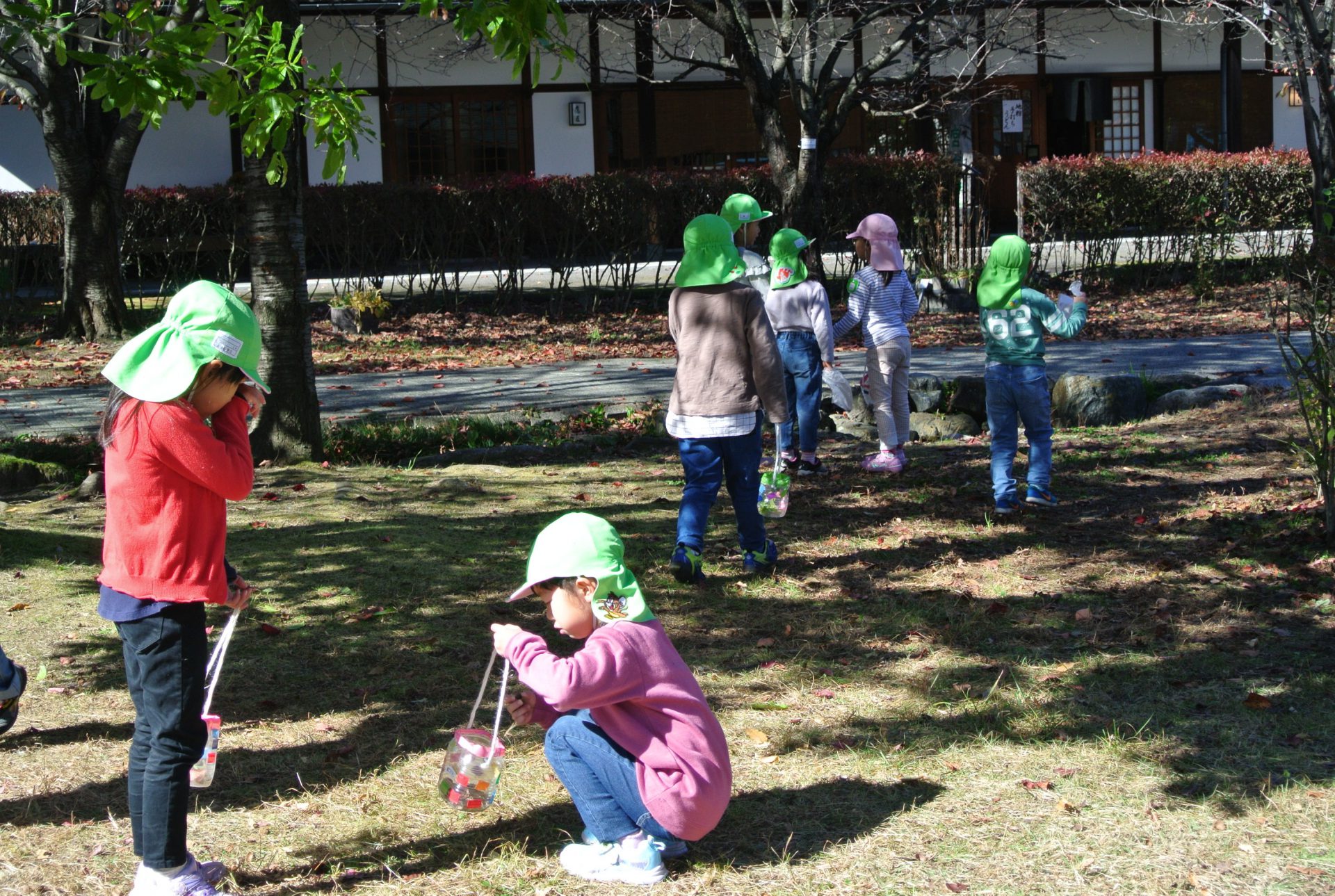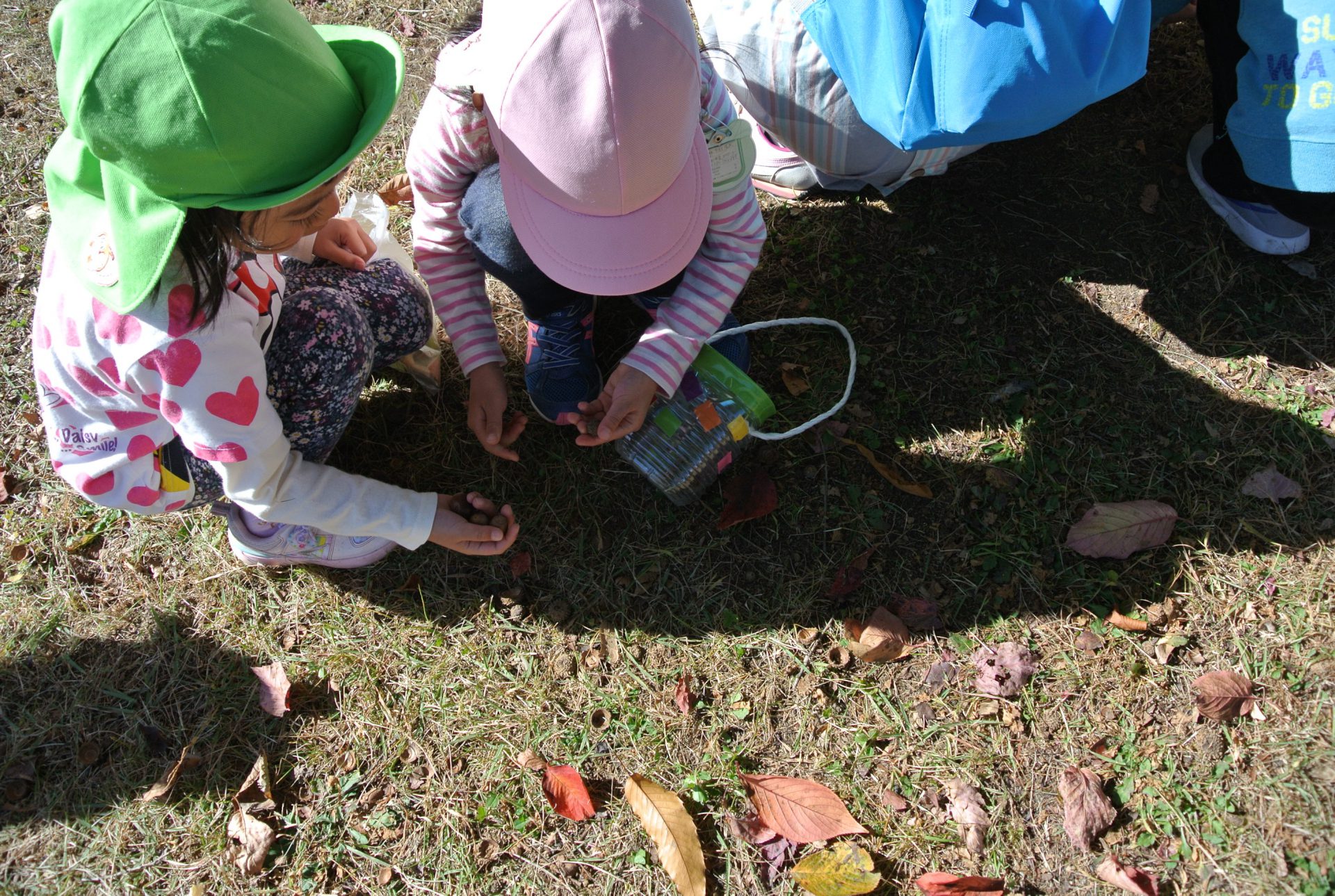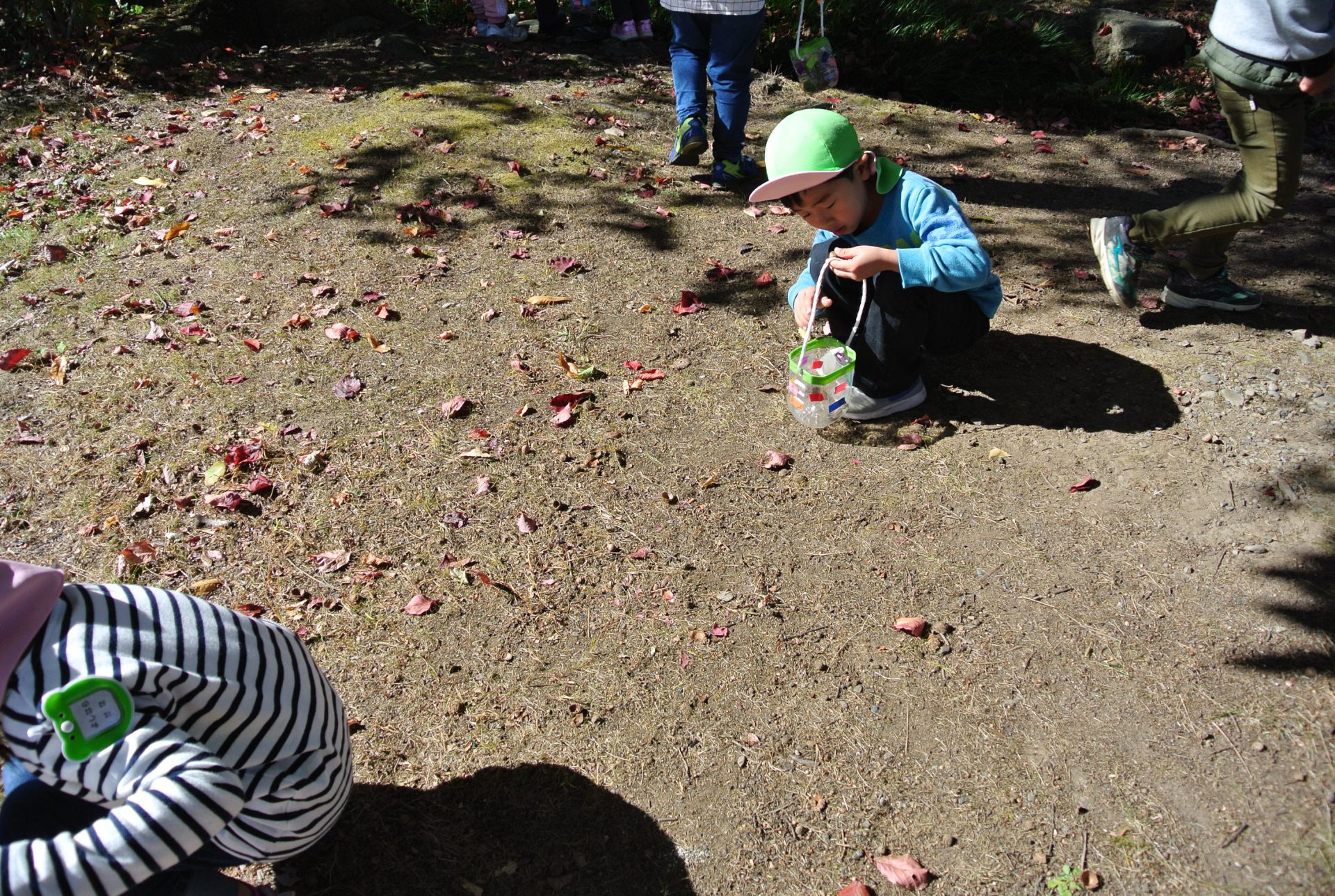 『あっ、お花が咲いている』と寒さに向かうこの季節に、ひっそりと咲いている花を見つける子どももいました。思いもよらず見たことのない虫に出会ったり、色づいた落ち葉を集めたり大小さまざまなどんぐりを拾って比べたり、友だちと会話しながら秋探しを楽しむことができました。毎年の経験から『穴の開いたドングリは拾わない!』とどんぐり虫が出てくるだろうことを予想する子どももいました。