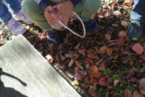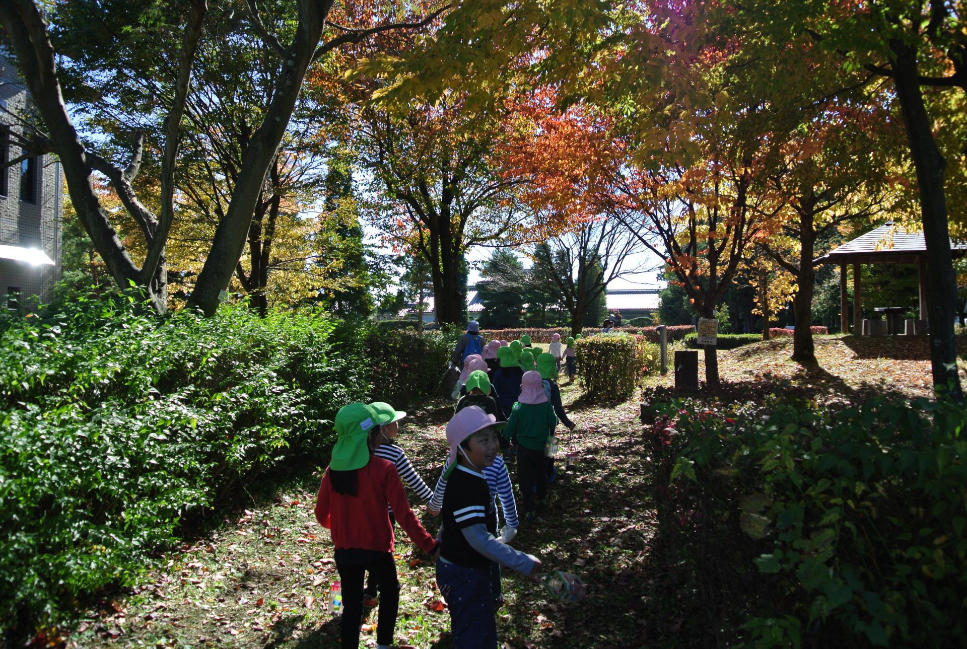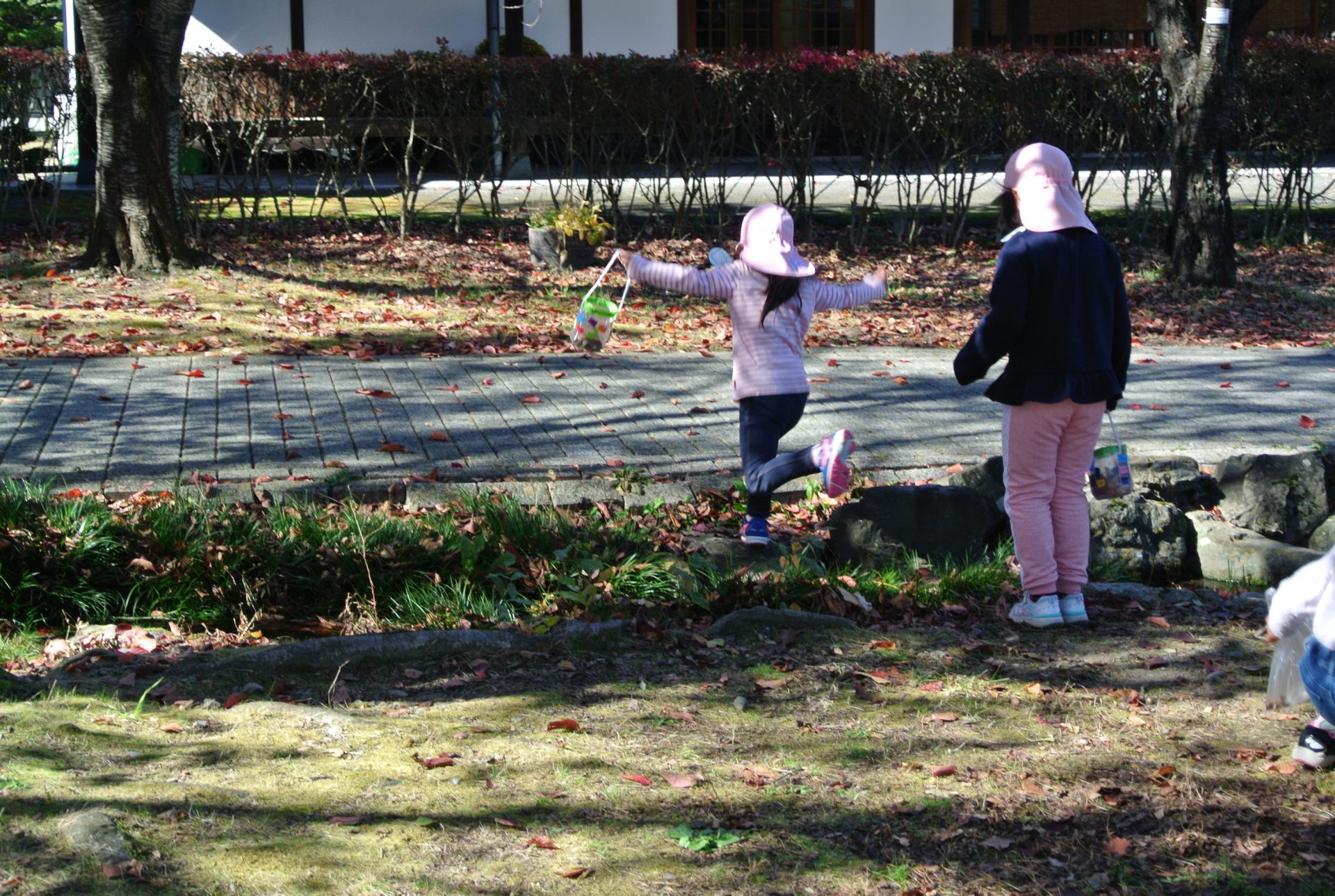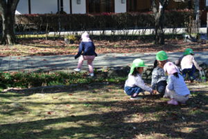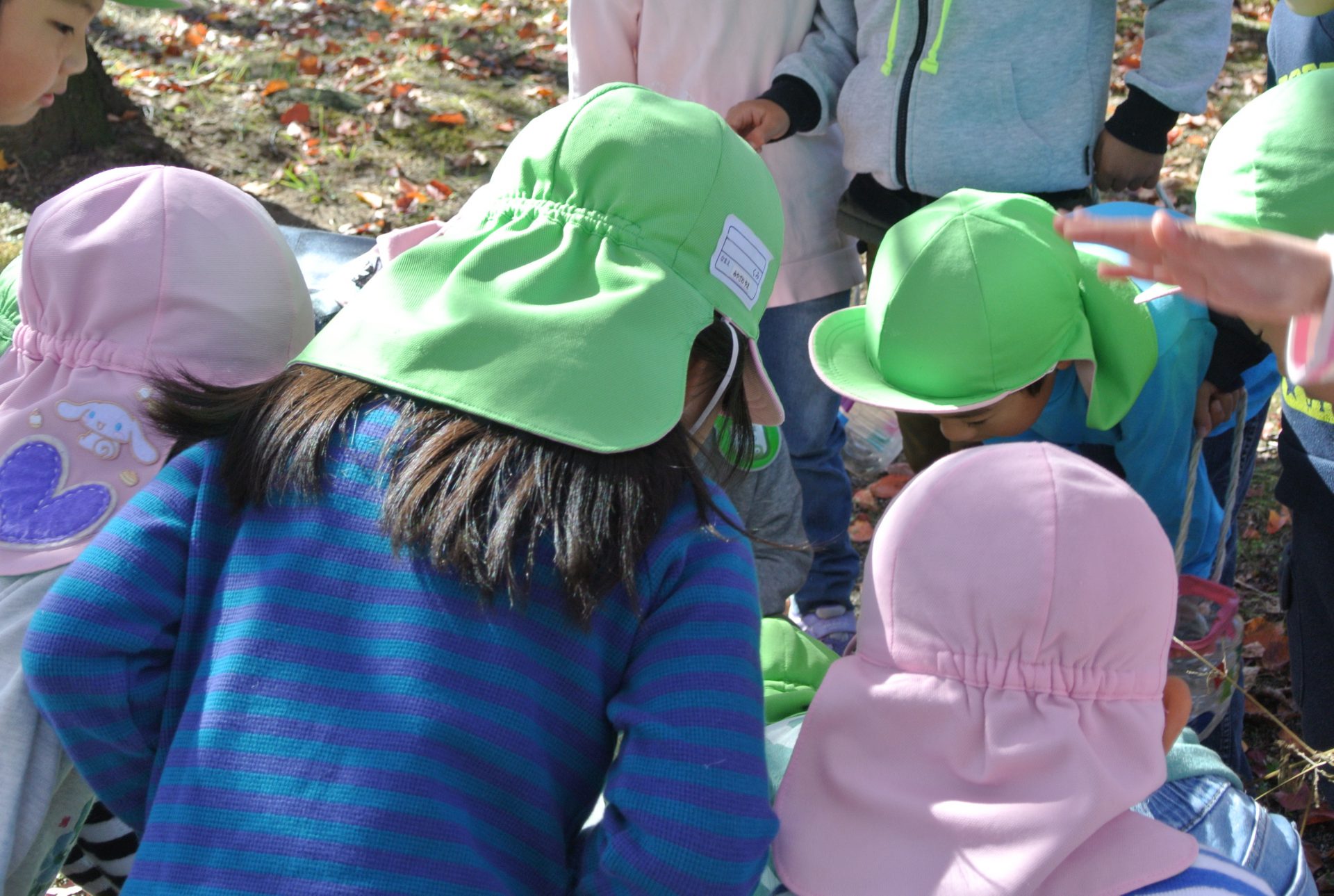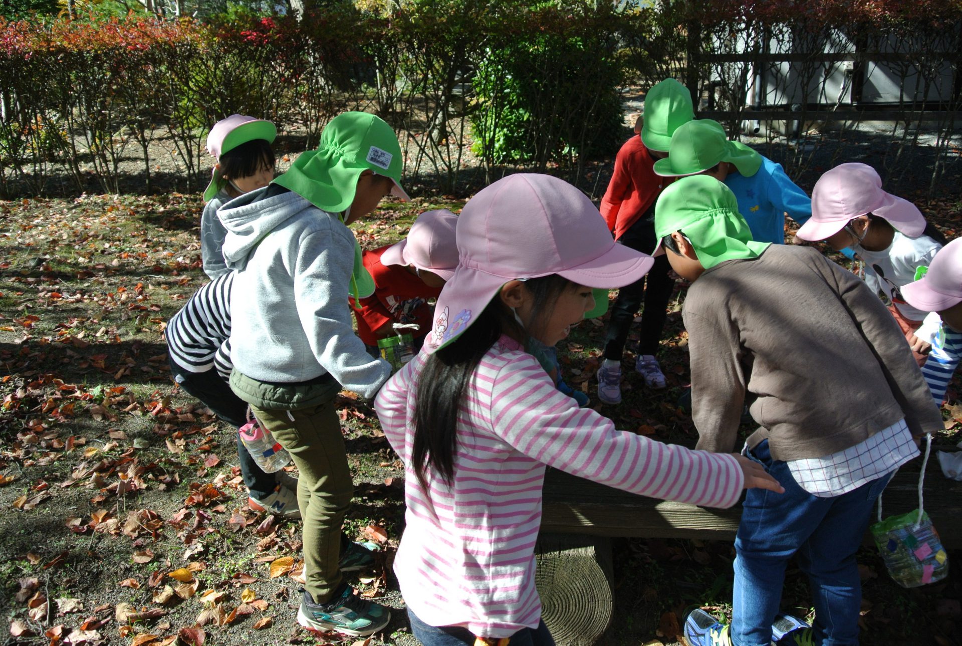 『あっ、お花が咲いている』と寒さに向かうこの季節に、ひっそりと咲いている花を見つける子どももいました。思いもよらず見たことのない虫に出会ったり、色づいた落ち葉を集めたり大小さまざまなどんぐりを拾って比べたり、友だちと会話しながら秋探しを楽しむことができました。毎年の経験から『穴の開いたドングリは拾わない!』とどんぐり虫が出てくるだろうことを予想する子どももいました。