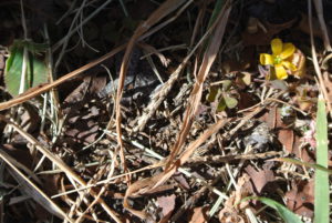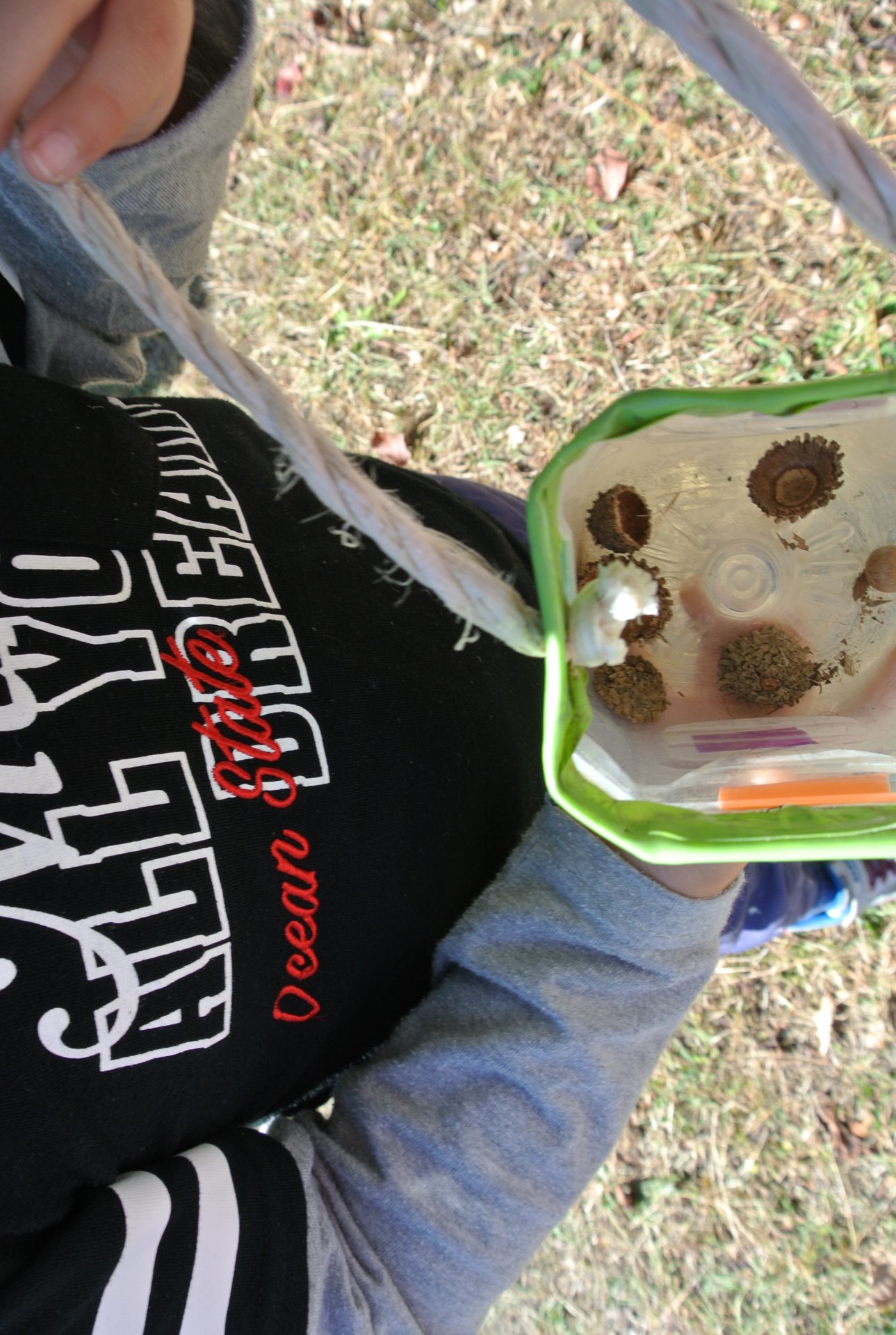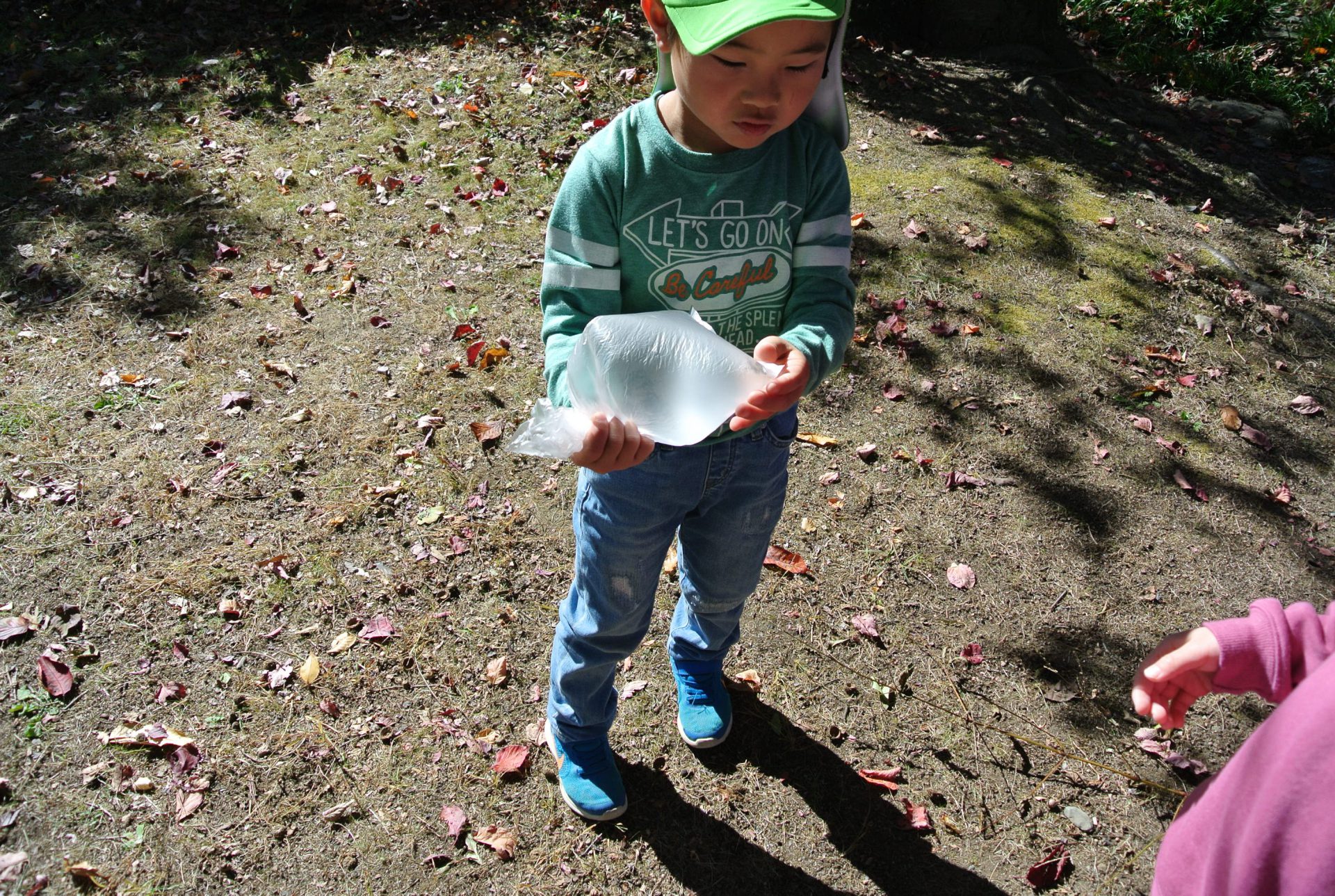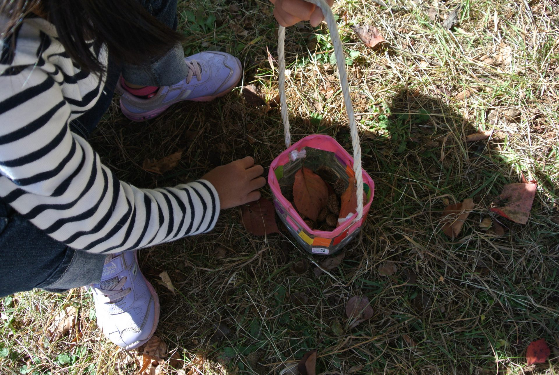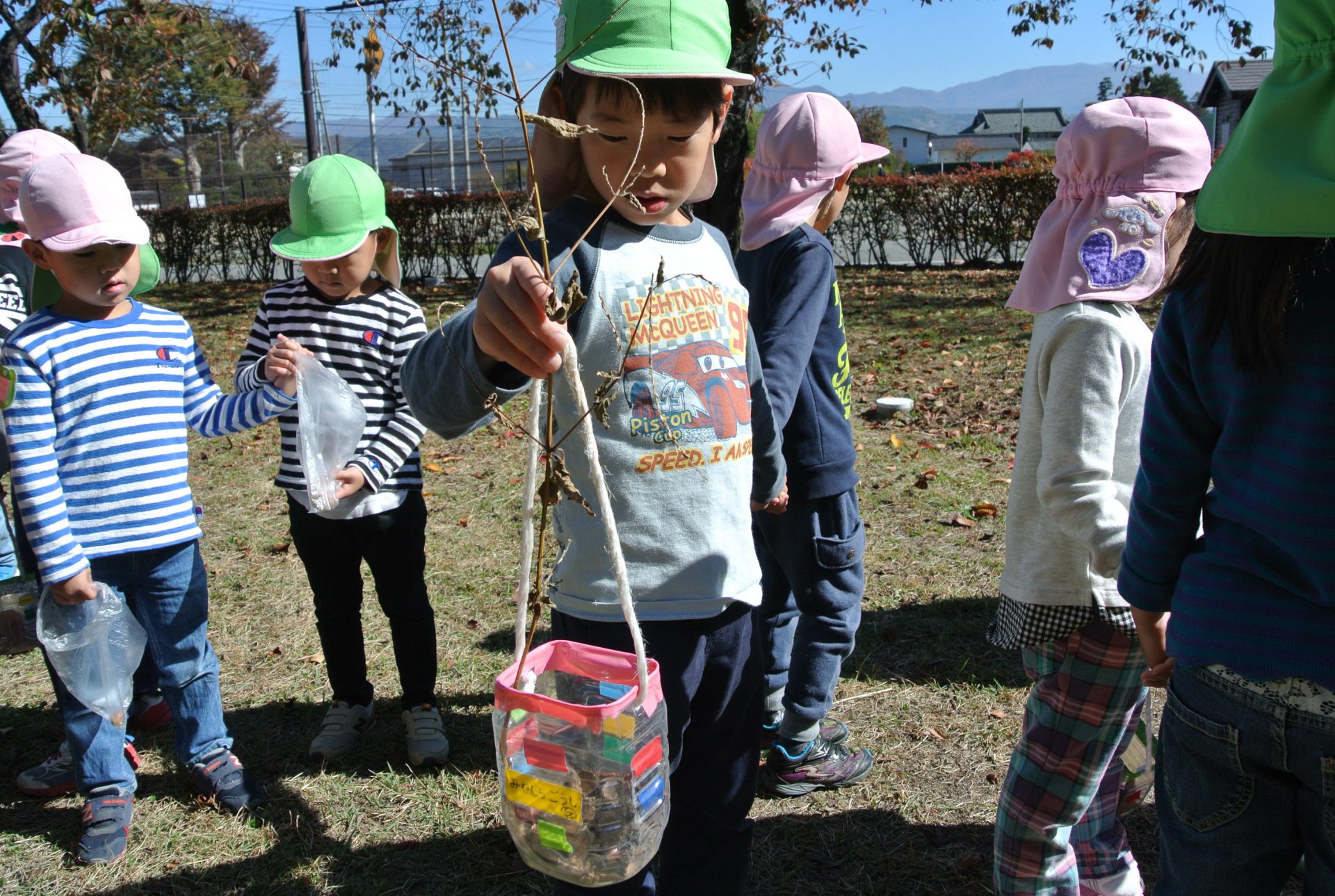 『あっ、お花が咲いている』と寒さに向かうこの季節に、ひっそりと咲いている花を見つける子どももいました。思いもよらず見たことのない虫に出会ったり、色づいた落ち葉を集めたり大小さまざまなどんぐりを拾って比べたり、友だちと会話しながら秋探しを楽しむことができました。毎年の経験から『穴の開いたドングリは拾わない!』とどんぐり虫が出てくるだろうことを予想する子どももいました。