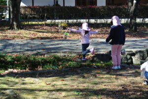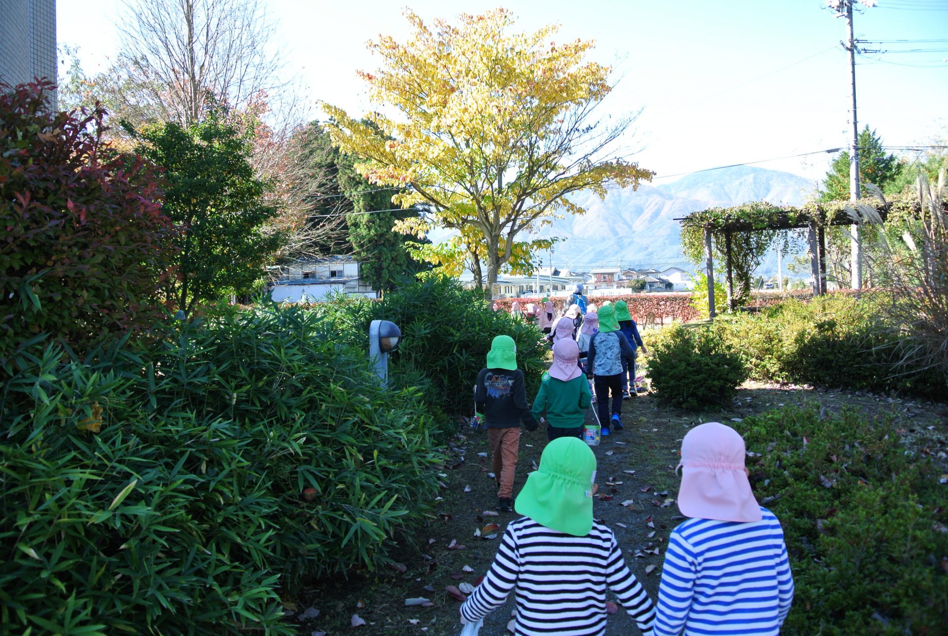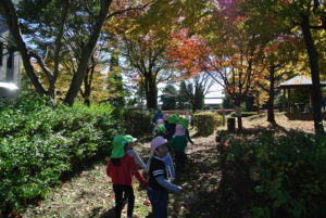 園から数分のところにある義民館では四季折々の自然を感じることができます。園の近くにこのような場所があることをうれしく思います。秋探しの散策をしたり、小川を飛び越えたり子どもたちが自ら自然に関わっていこうとする姿たくさん見られました。子どもたちが見つけた『秋』は、お店やさんごっこの品物づくりや、クリスマスリースづくりに繋げていこうと思います。