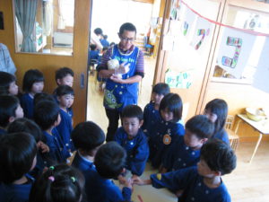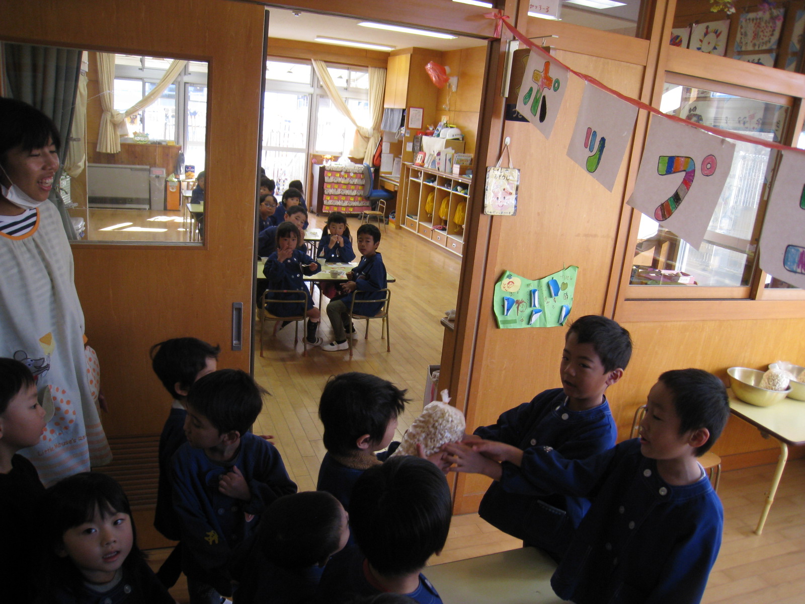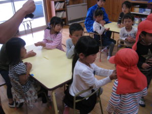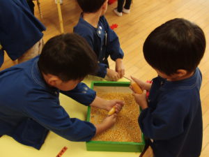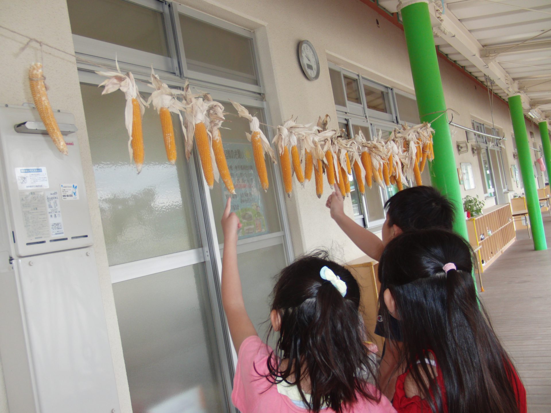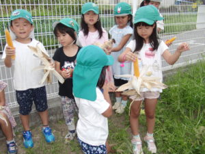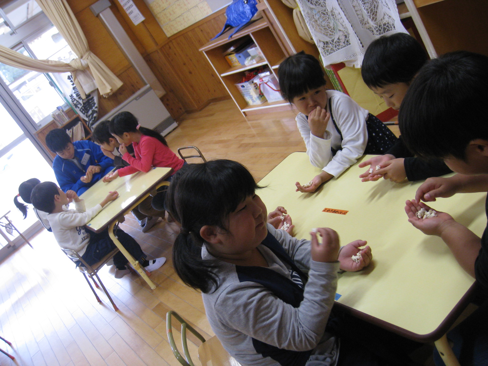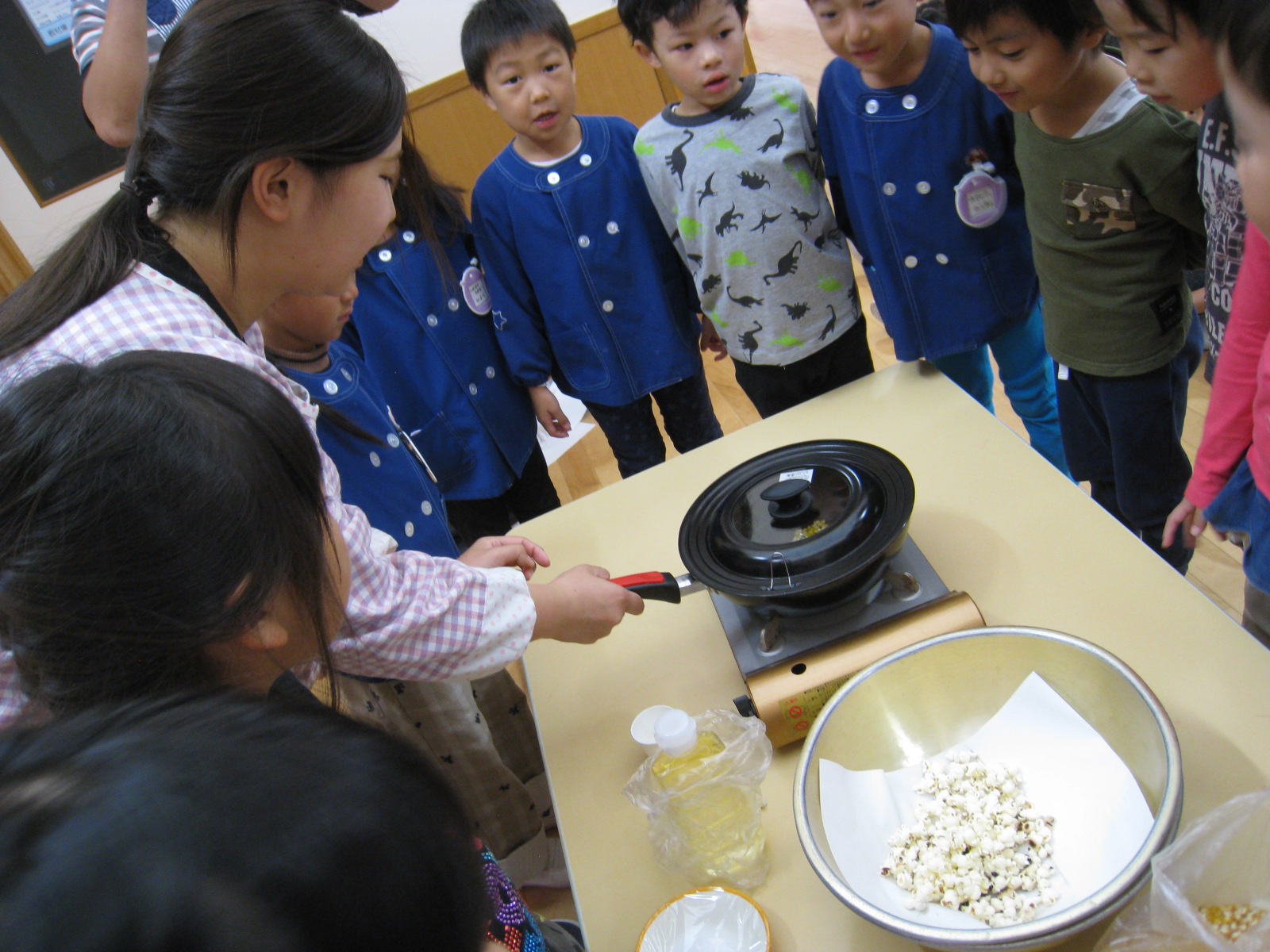 テラスで乾燥した実をもいでポップコーンを作りました。フライパンの中でパチパチ跳ねる音、香ばしい匂い、ワクワク感も高まりました。美味しくできたポップコーンを小さいクラスにもおすそ分け。楽しい異年齢交流にもつながりました。