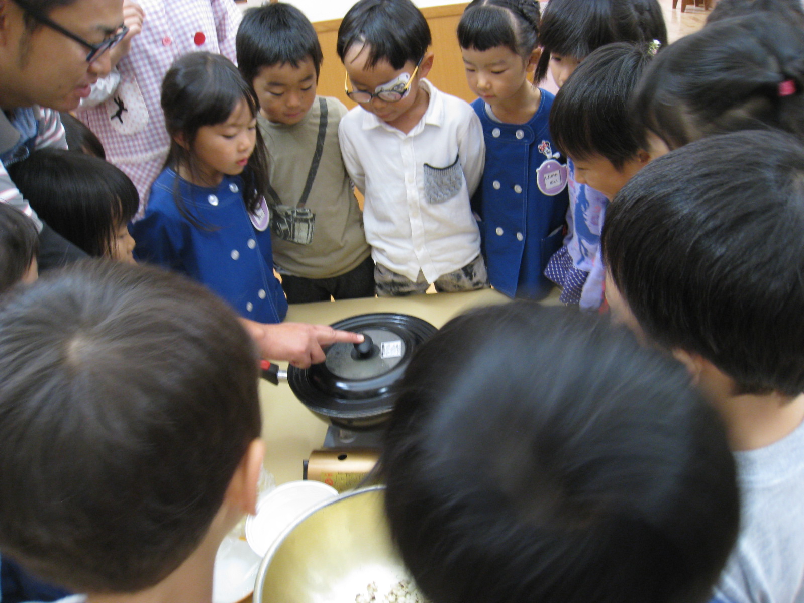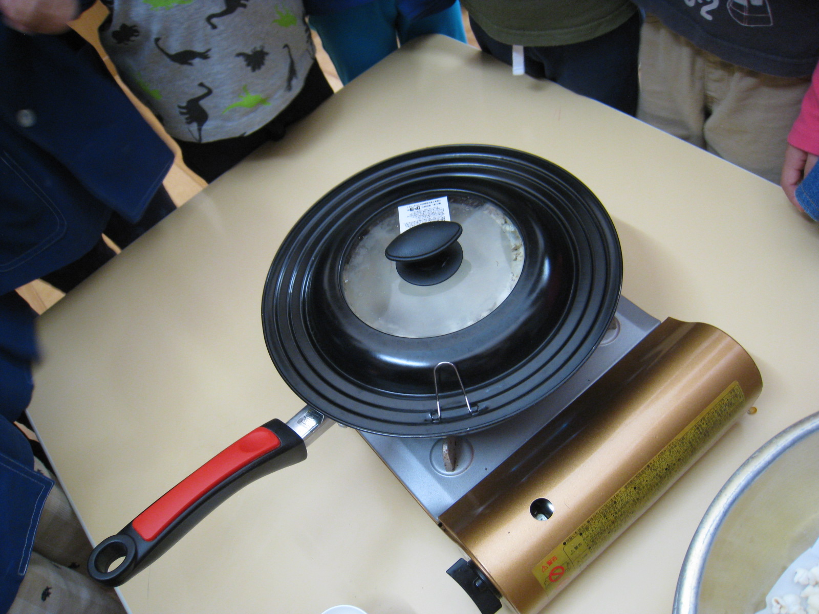 順番にフライパンを覗いてみます。「まただな まだかな~・・・」「あ!はねた!」「あ!ポンポン音がしたよ!」「いいにおいしてきた~♬」