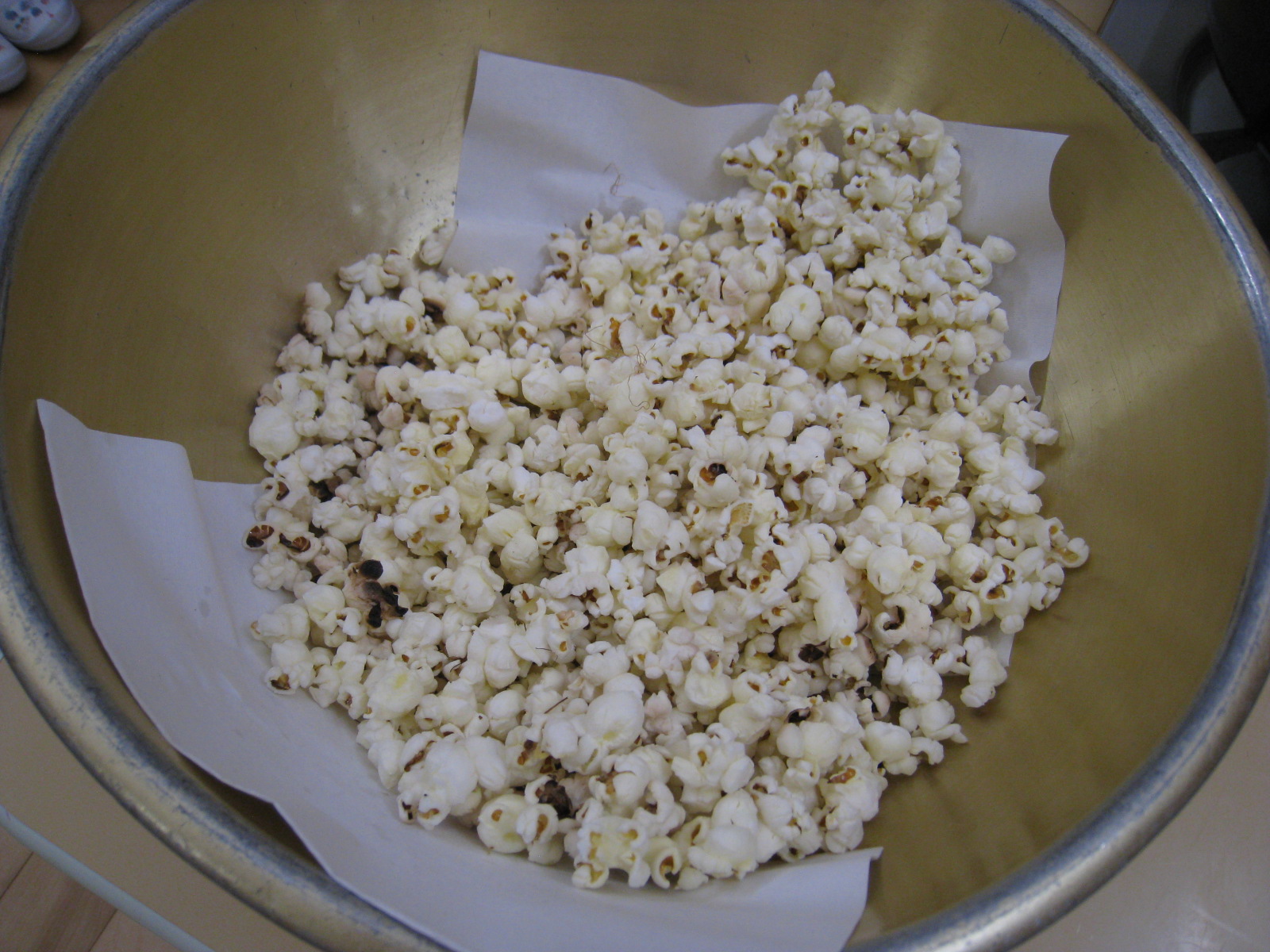 連続で弾けだすと大喜び!フタを開けると、おいしそうなポップコーンが出来ました。