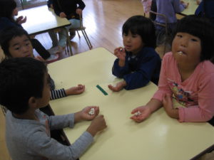 一粒ひとつぶ大事に食べる子ども達。「もっとたくさんたべたいね」「つぎはいつやるの!?」