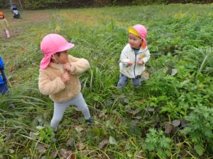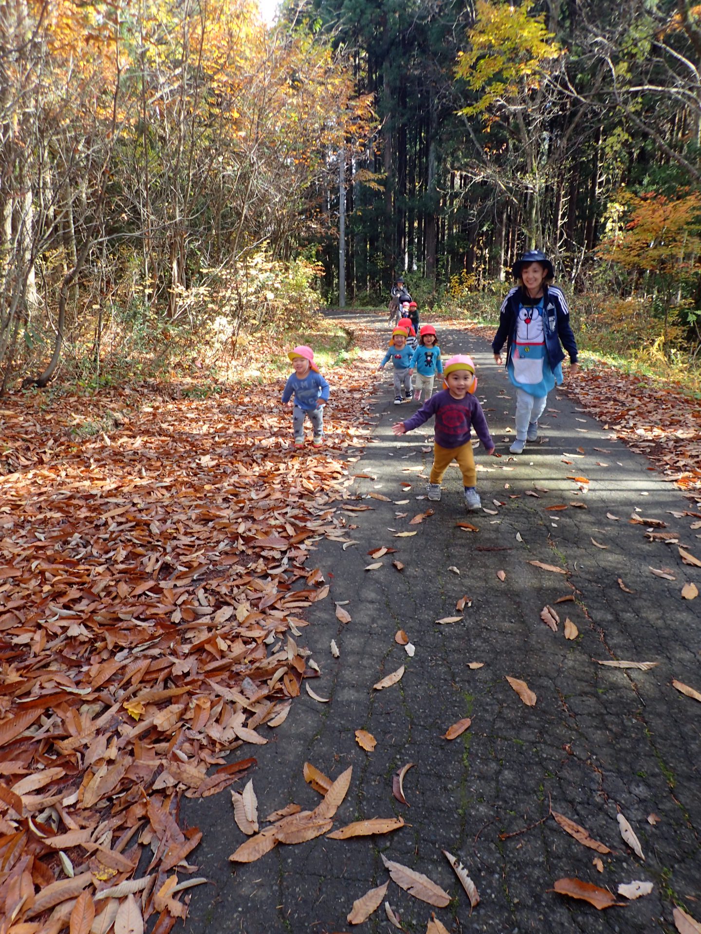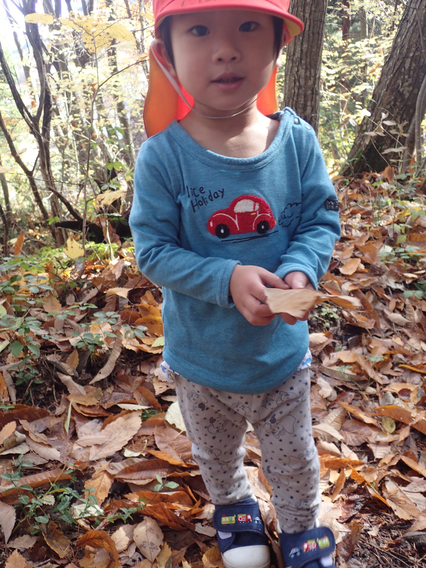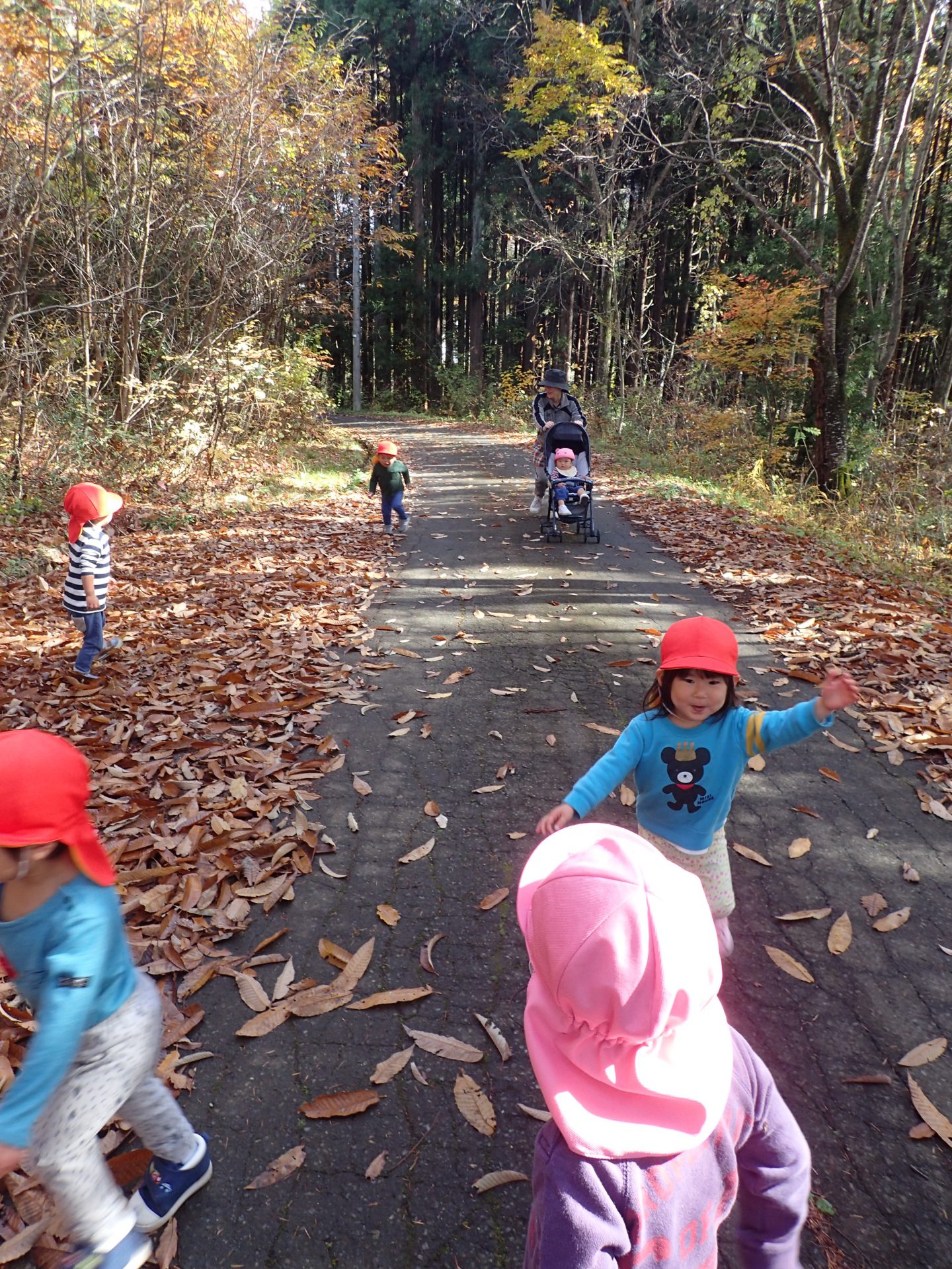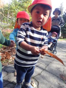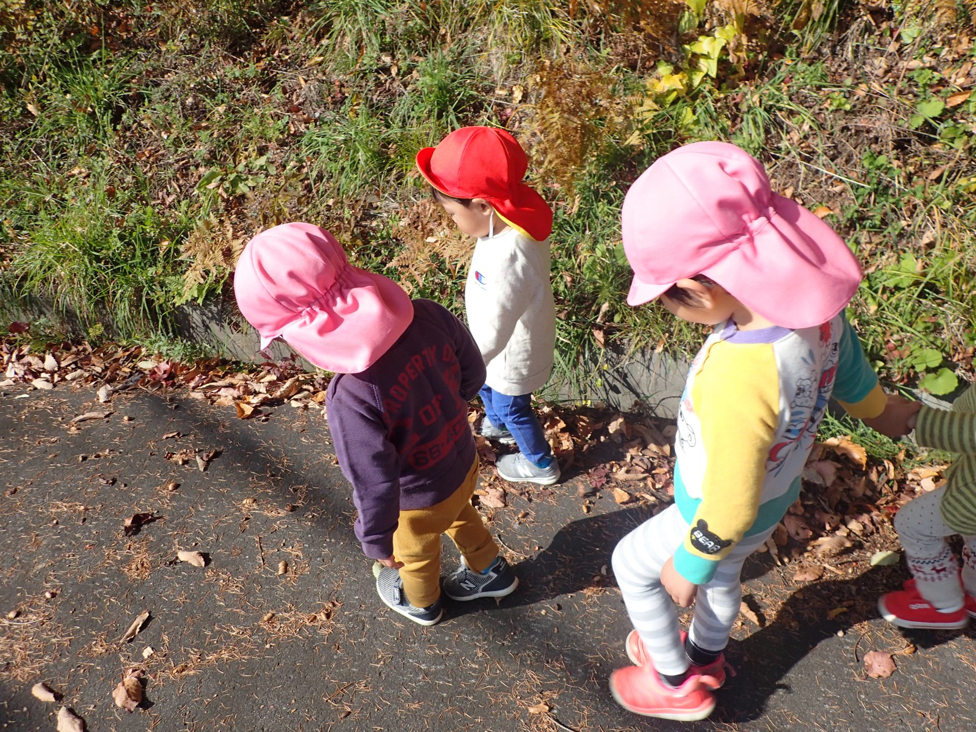 たくさんのお土産を手に目的地へ出発!!お友だちと手をつないで歩くのも上手になり、周りや足元に目がいくようになり・・・秋は色々な物が落ちていて目線はもう下。