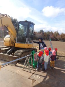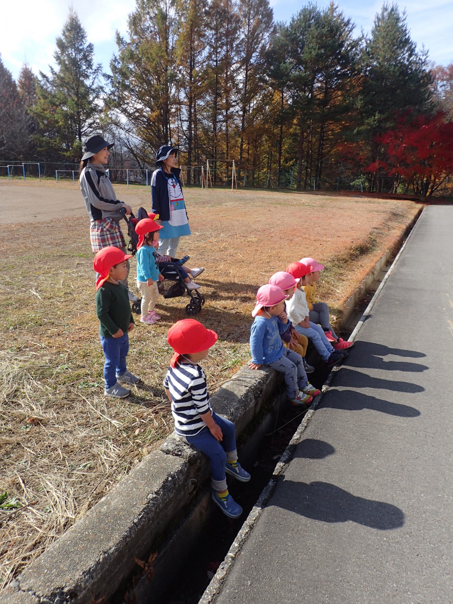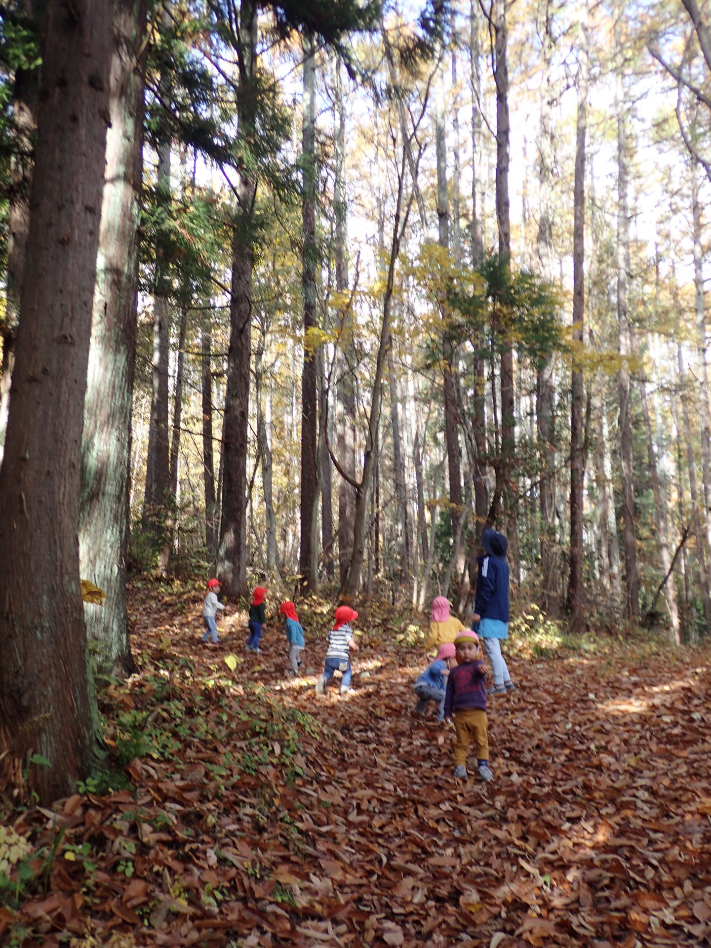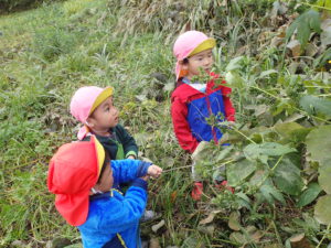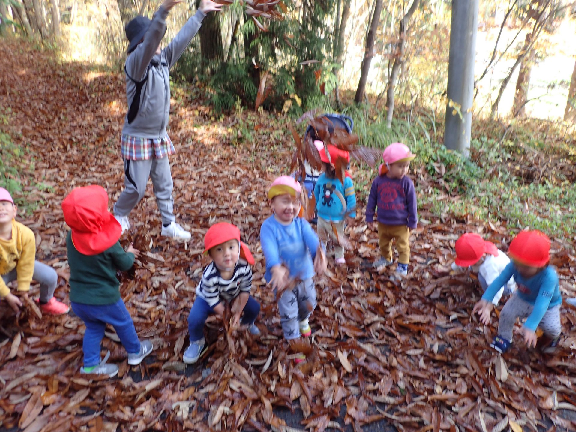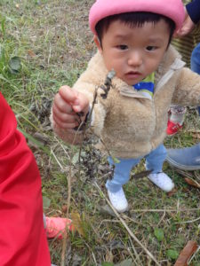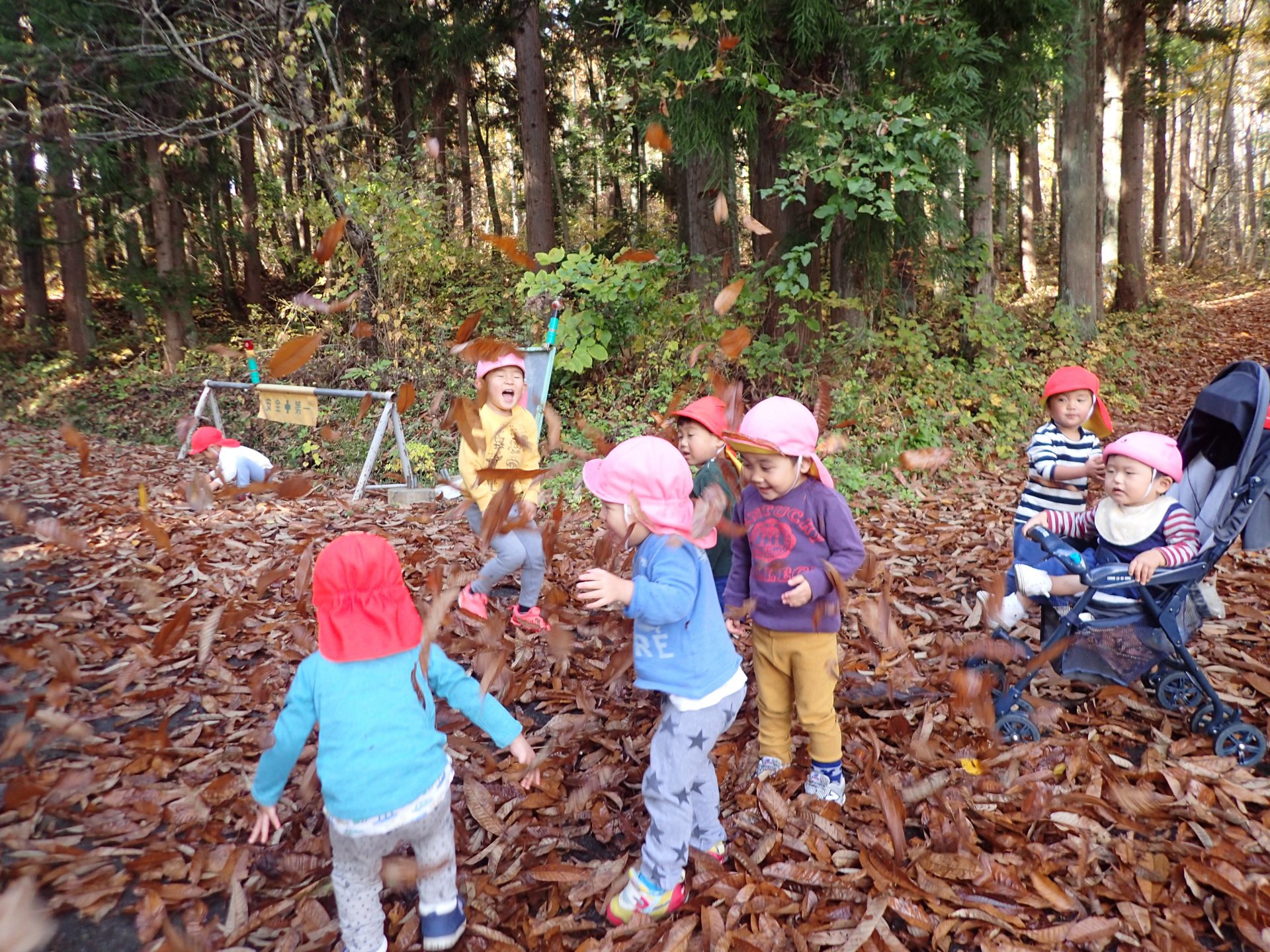 たくさんのお土産を手に目的地へ出発!!お友だちと手をつないで歩くのも上手になり、周りや足元に目がいくようになり・・・秋は色々な物が落ちていて目線はもう下。