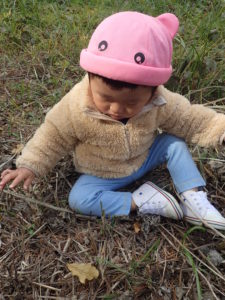 0歳児の子も歩いて探しています。疲れると休憩。歩くことを楽しんでいますよ。