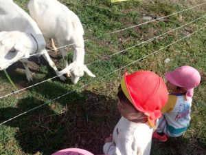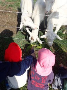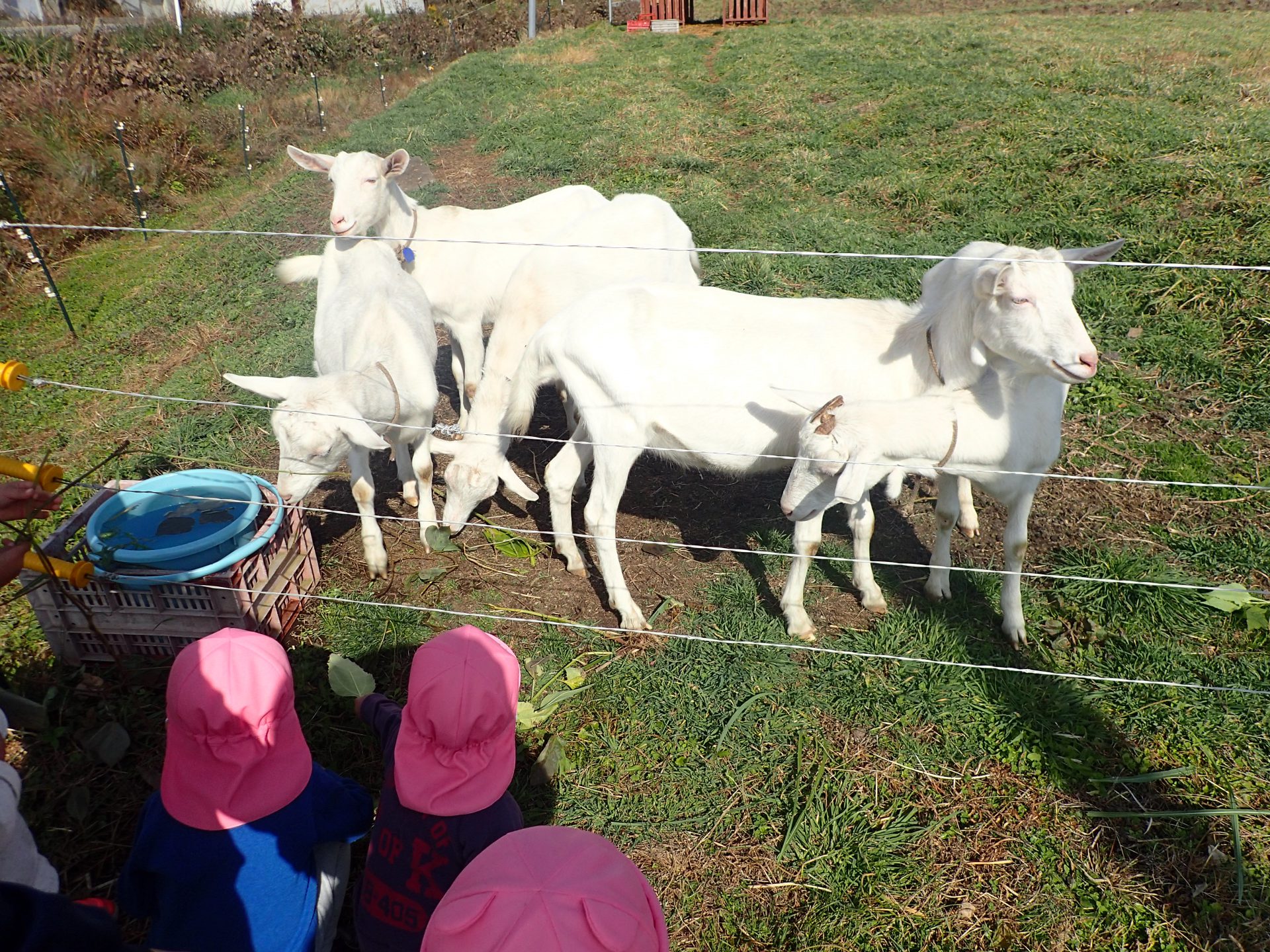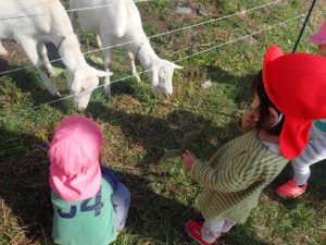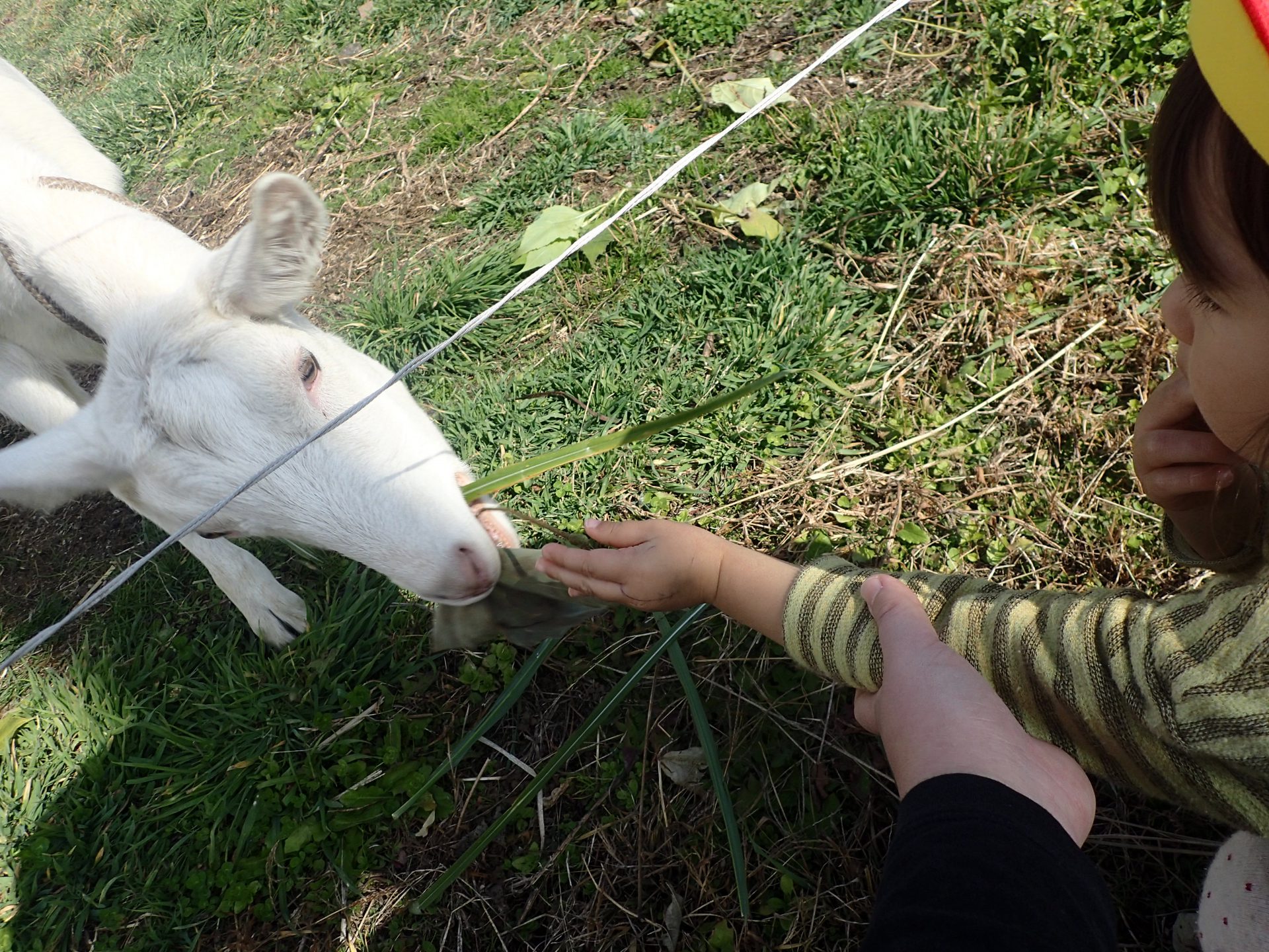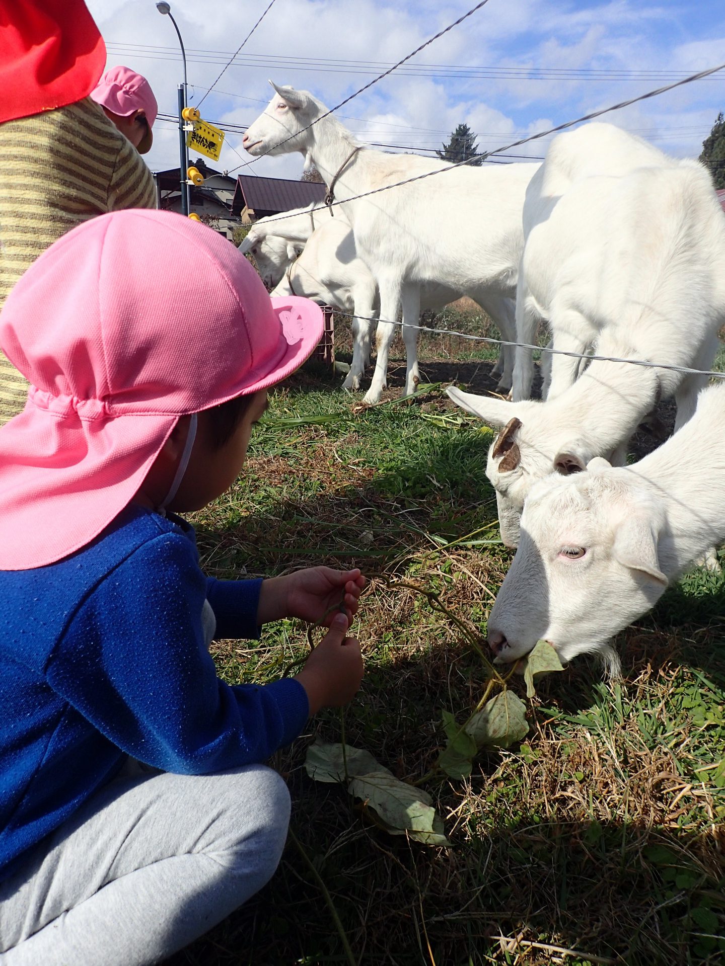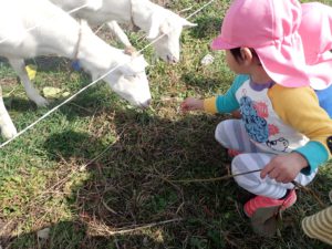 保育士や友だちと一緒に身近な生き物や植物を実際に見たり、触れたりすることで、親しみや興味を持つようになってきました。やぎさんとの様々な触れ合いを重ねて、大きさ、におい、動き、鳴き声などの様々な感覚を直感的に体験しています。好きな物、何て呼んだら来てくれるか、どう草をあげたらいいかなどが分かってきて、子どもたちがそれに合わせた関わり方をするうようになってきているなと感じています。これからも色々な動植物の美しさや力強さ、はかなさ、可愛らしさなどに驚きや感動を味わい、心動かされる経験がたくさんできるように活動していきたいと思います。