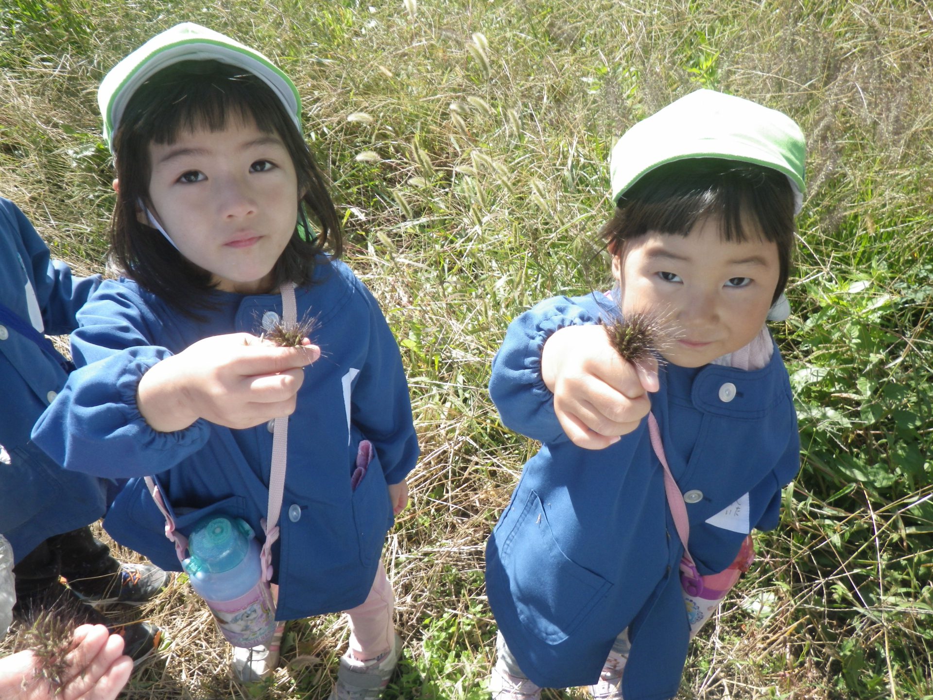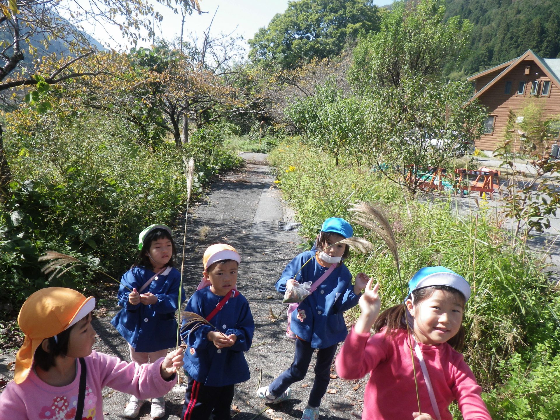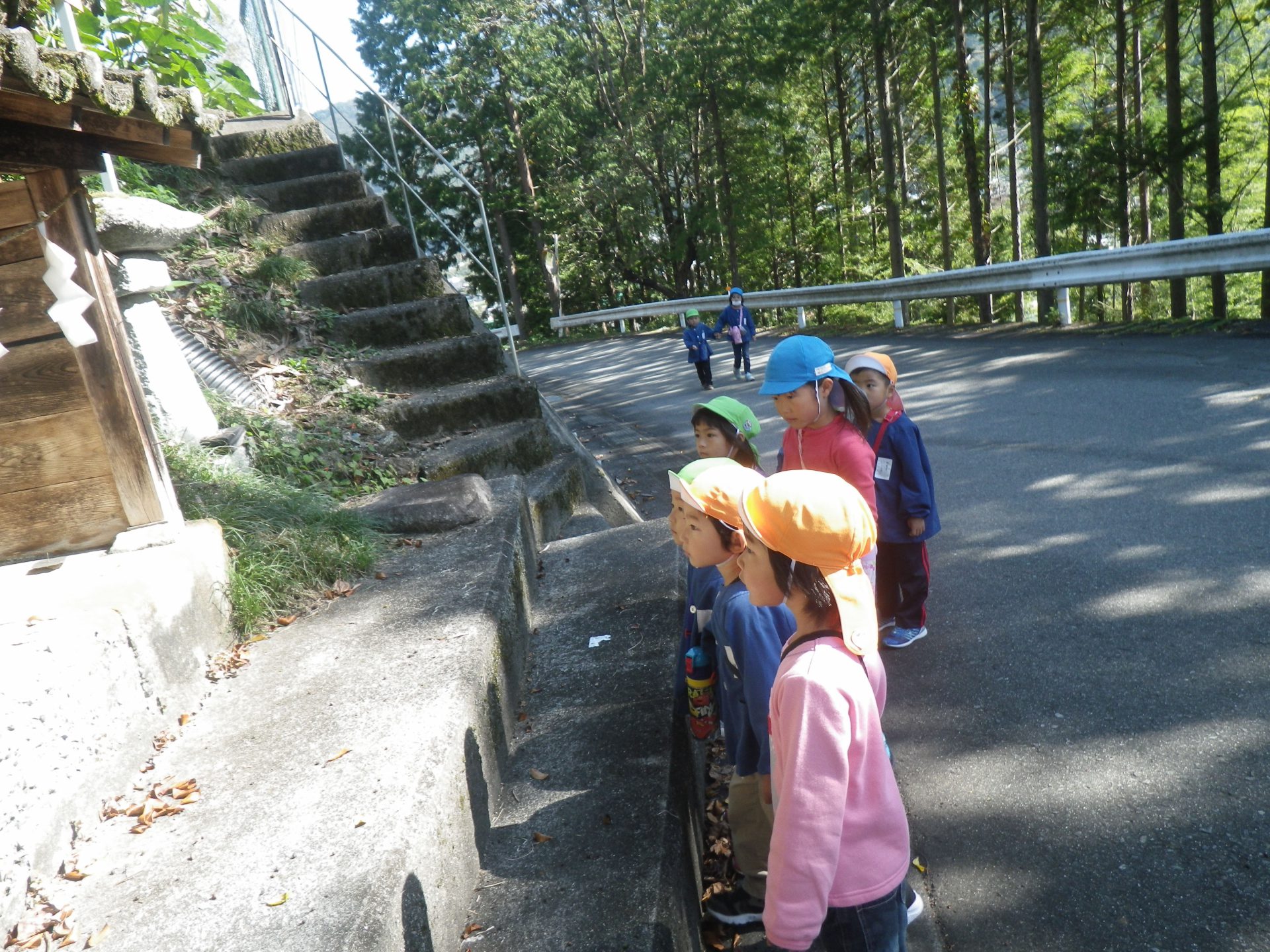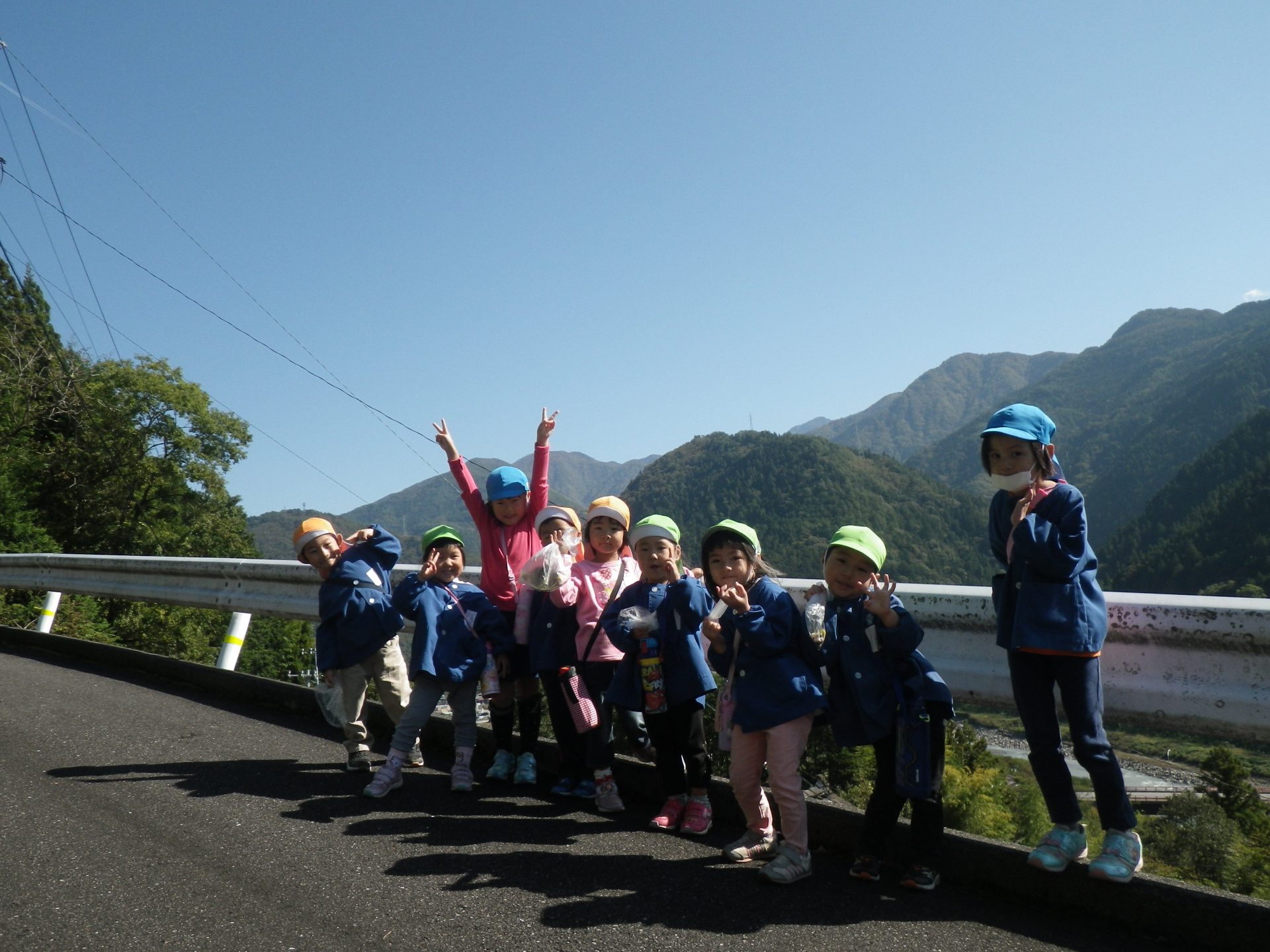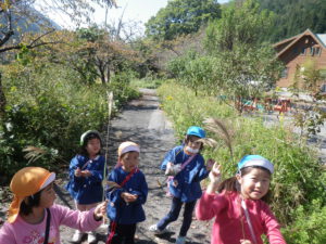 秋晴れのいい天気、以上児9人でお散歩に出かけました。
