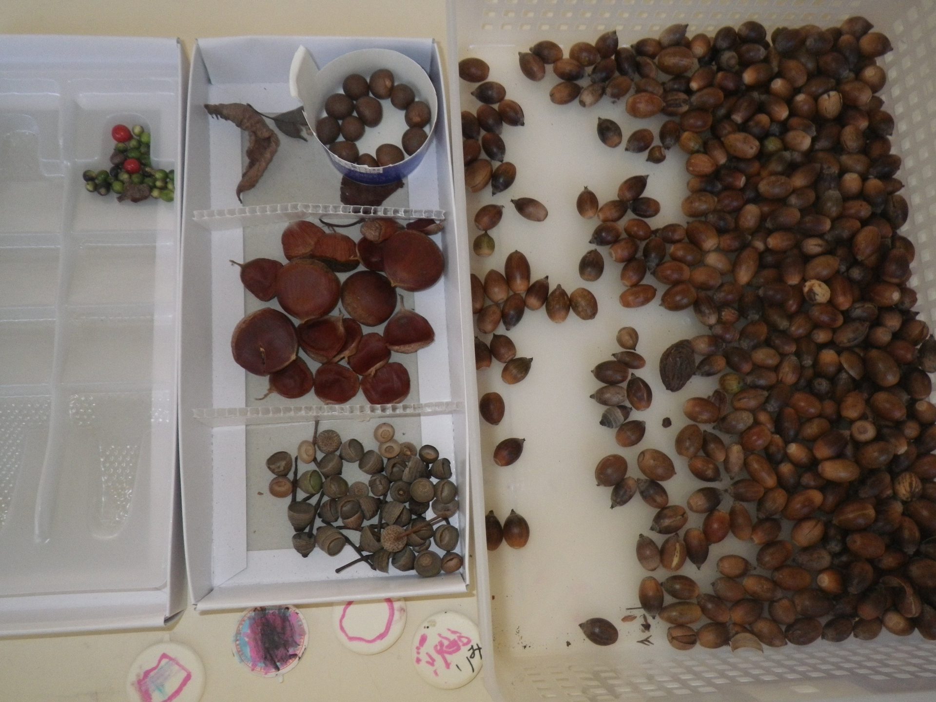 帰ってから、拾ってきたどんぐりや木の実をきれいに分けて、箱に入れました。