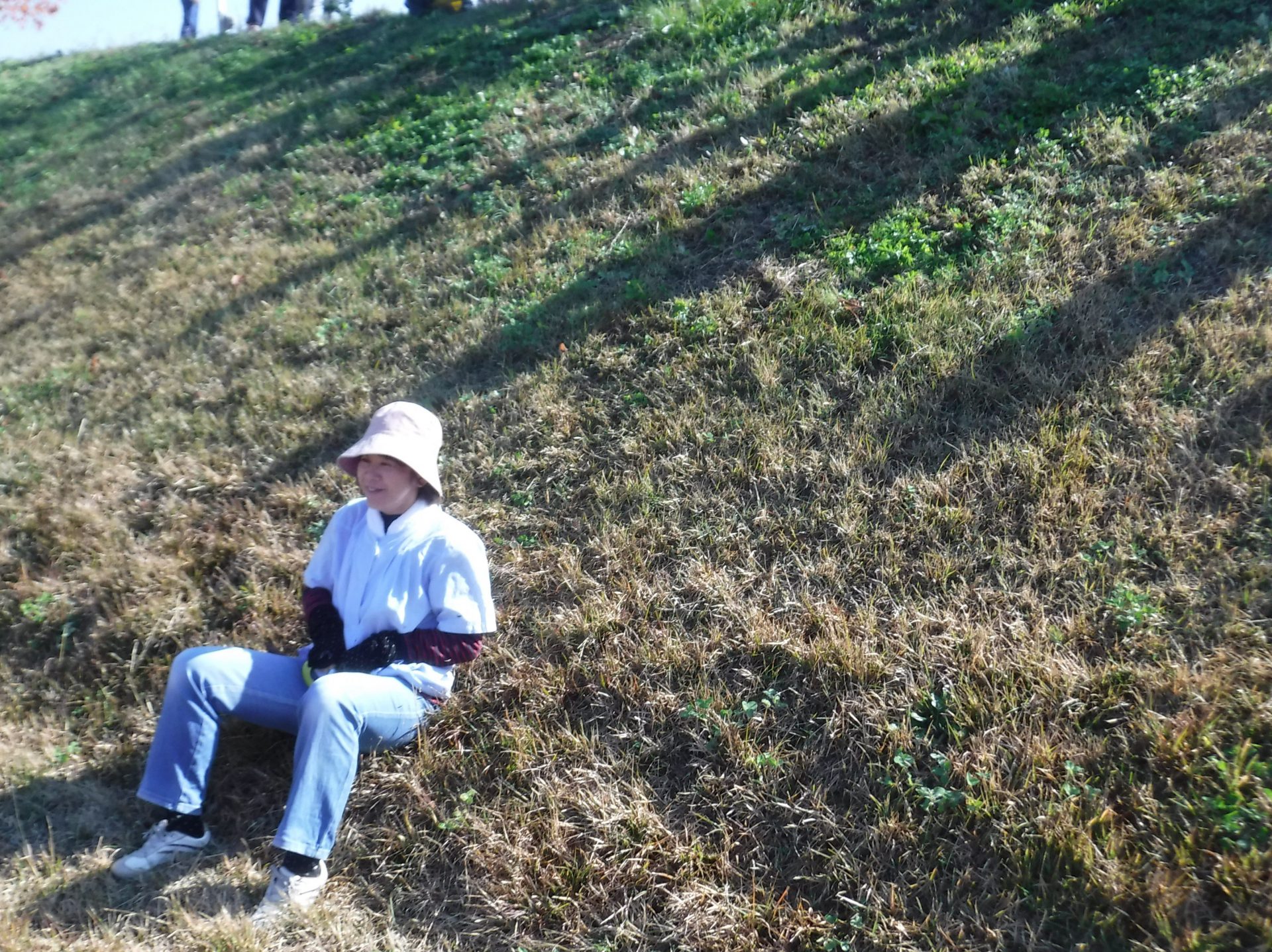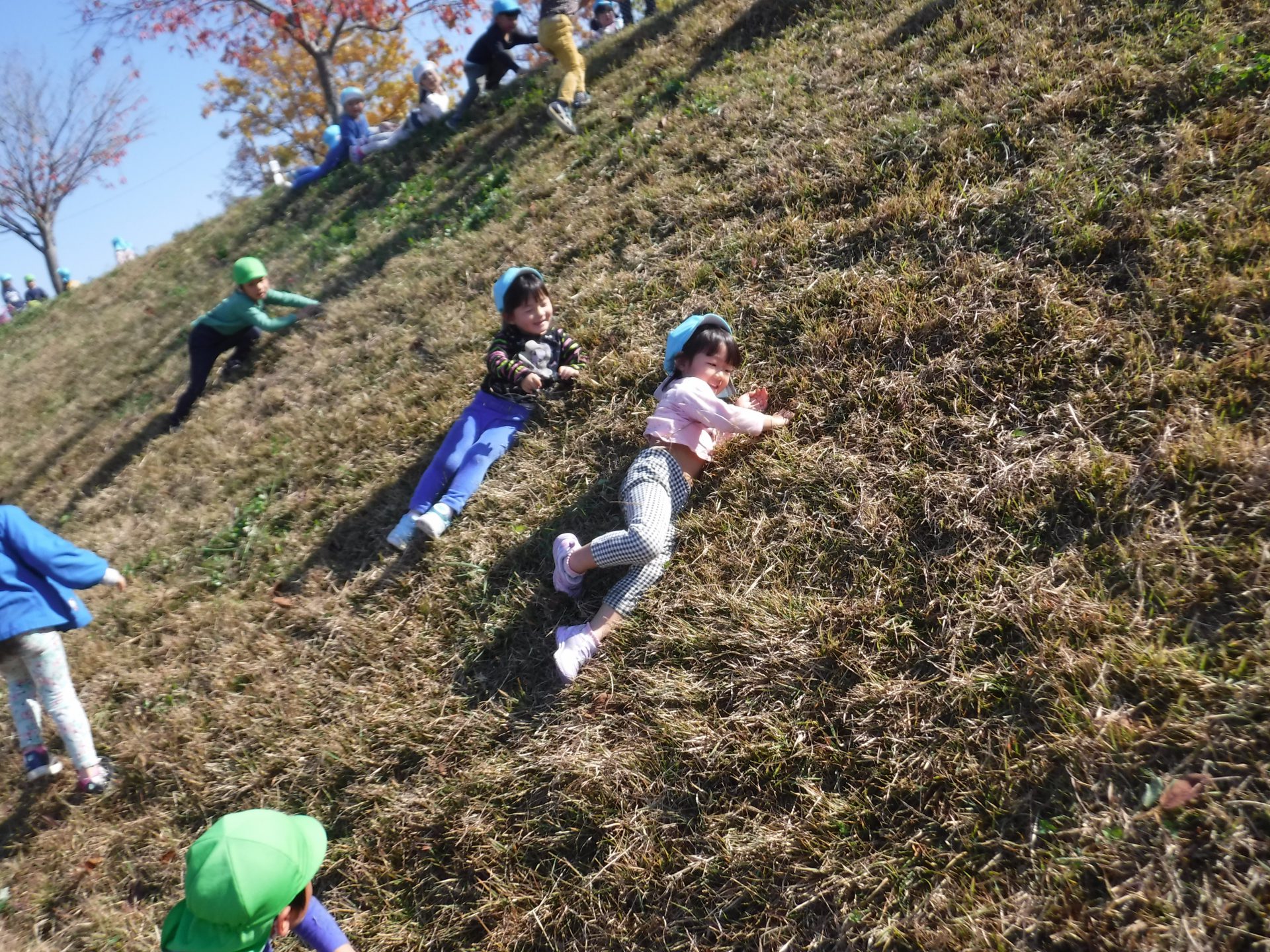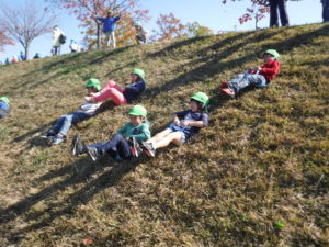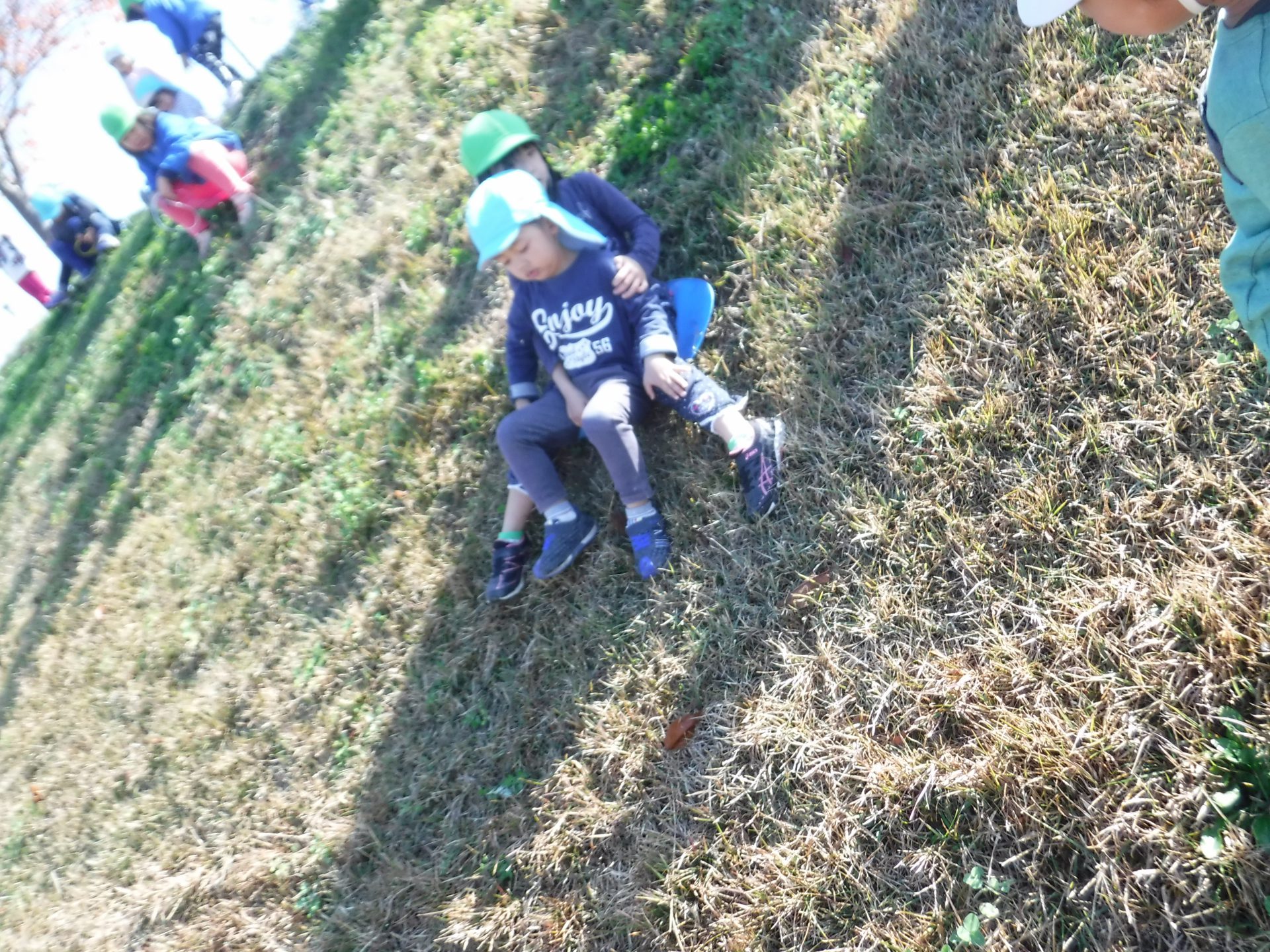 土手滑りは初体験の年少さん、どうやって遊ぶのかな...?