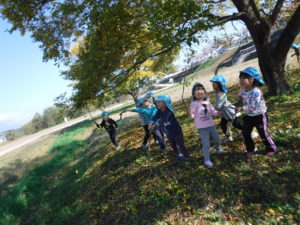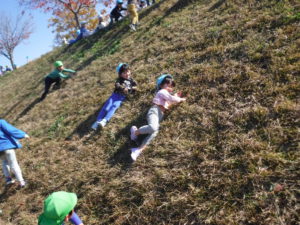 ・年少児にとっては初めての場所・遊びだったが、年長児に教えてもらったり大きい人が遊ぶ姿をよく見て真似をしたりして土手滑りを楽しんでいました。大きい人から小さい人へ遊びの伝承をすることで、異年齢の友だちとの関わりも深まっていくと感じました。