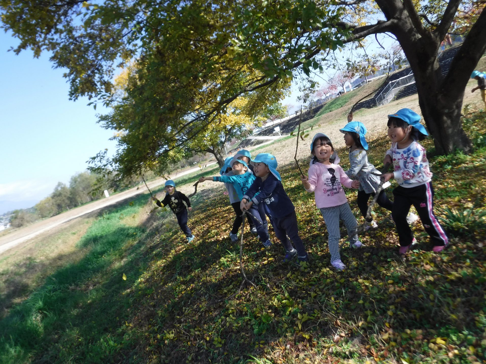 大きな木の下に木の枝が落ちているのを発見した年少さん。