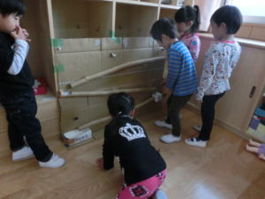 ・どんぐり転がしを作る過程で「トイレットペーパーをこっちにつなげよう」「ここがいいよ」と自分たちで考える姿があった。