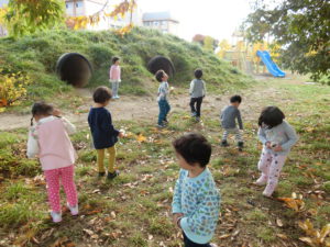 みんなでマラカスを作ろうということになり、「どんぐり探しに行こ!」と園庭に駆け出しました。