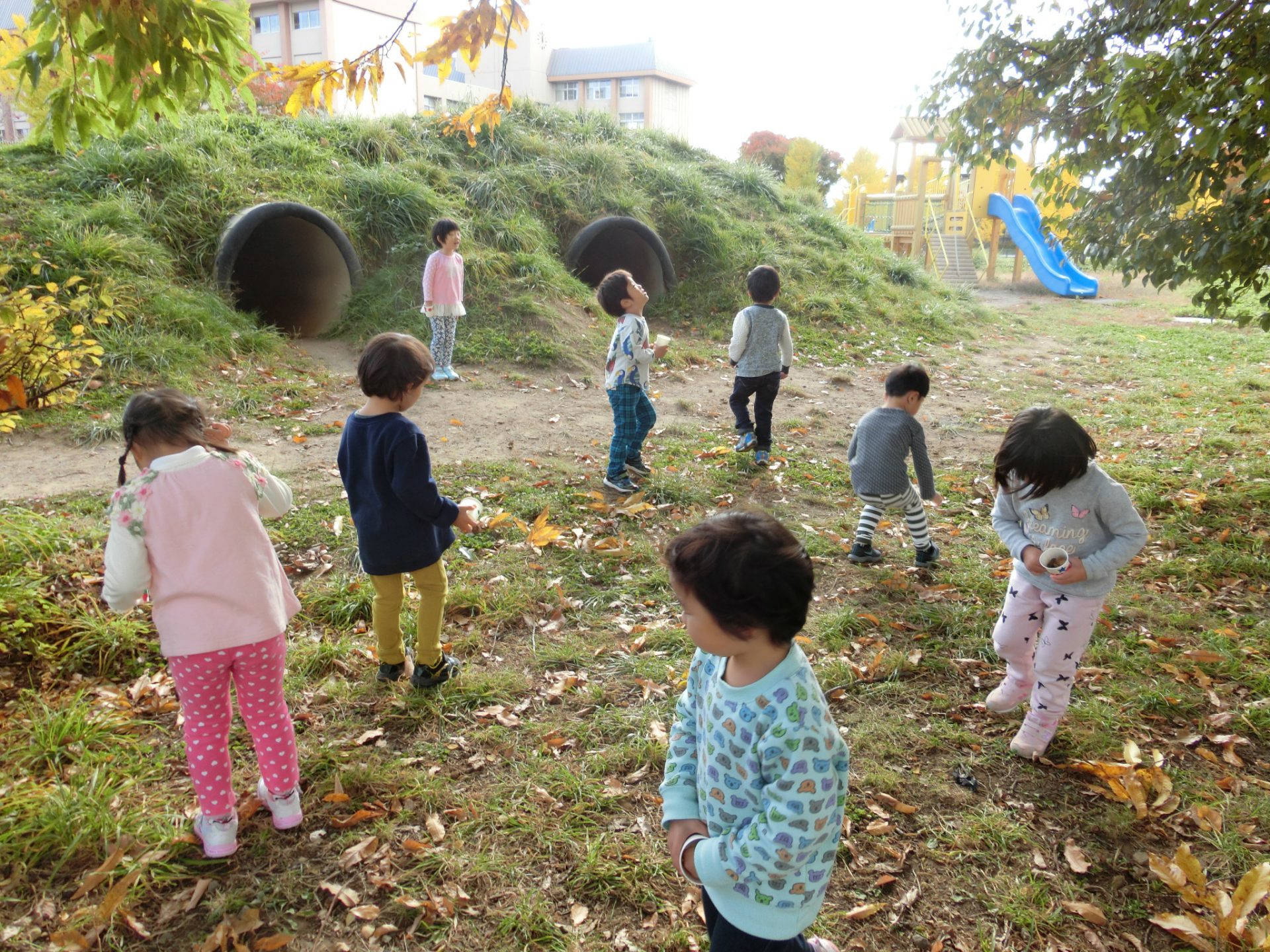 ・どんぐり転がしをしながら歌を歌ったり、どんぐりが転がる音から楽器作りに繋がり子ども達からの発見を大切にしていきたいと思いました。