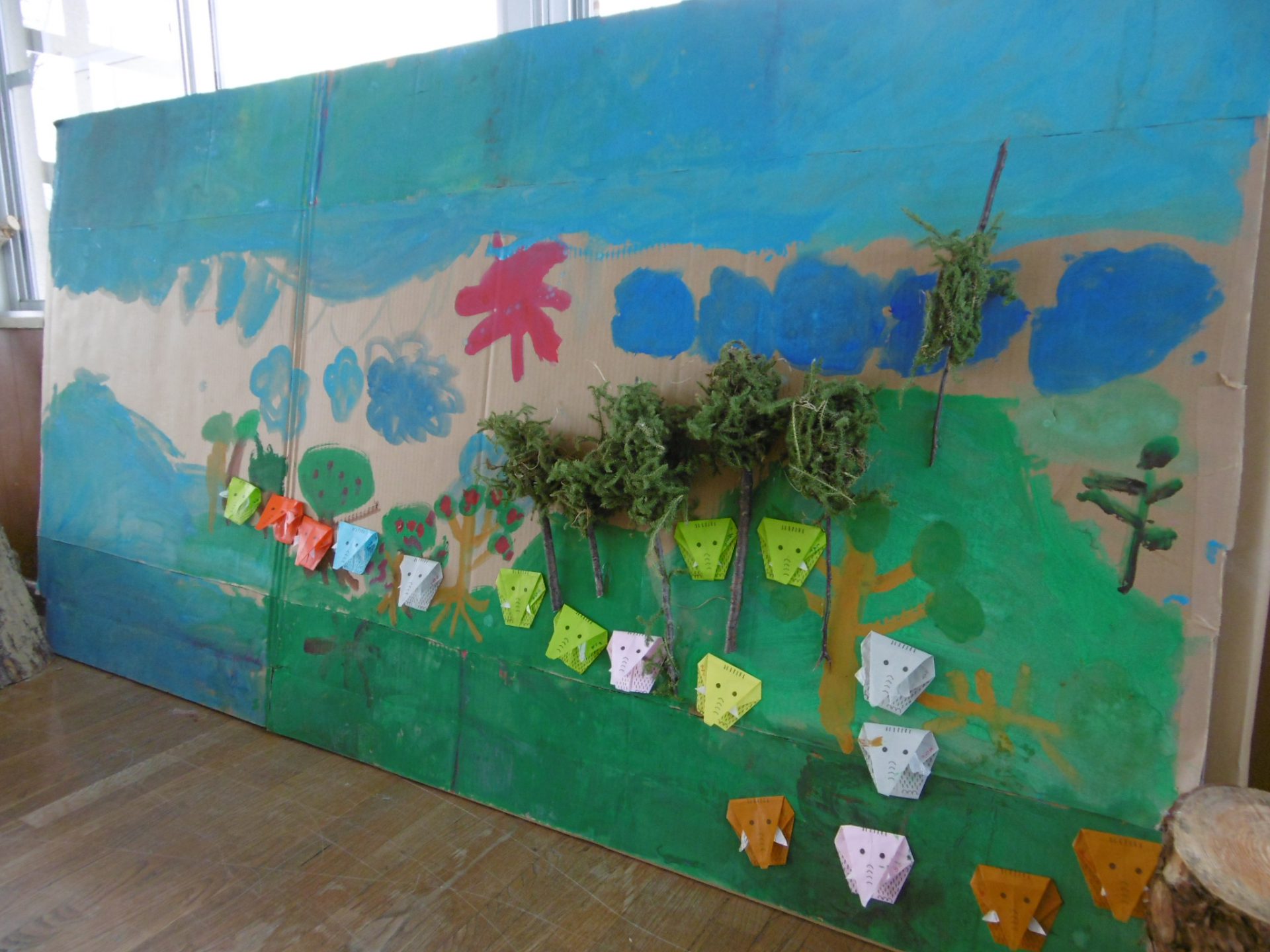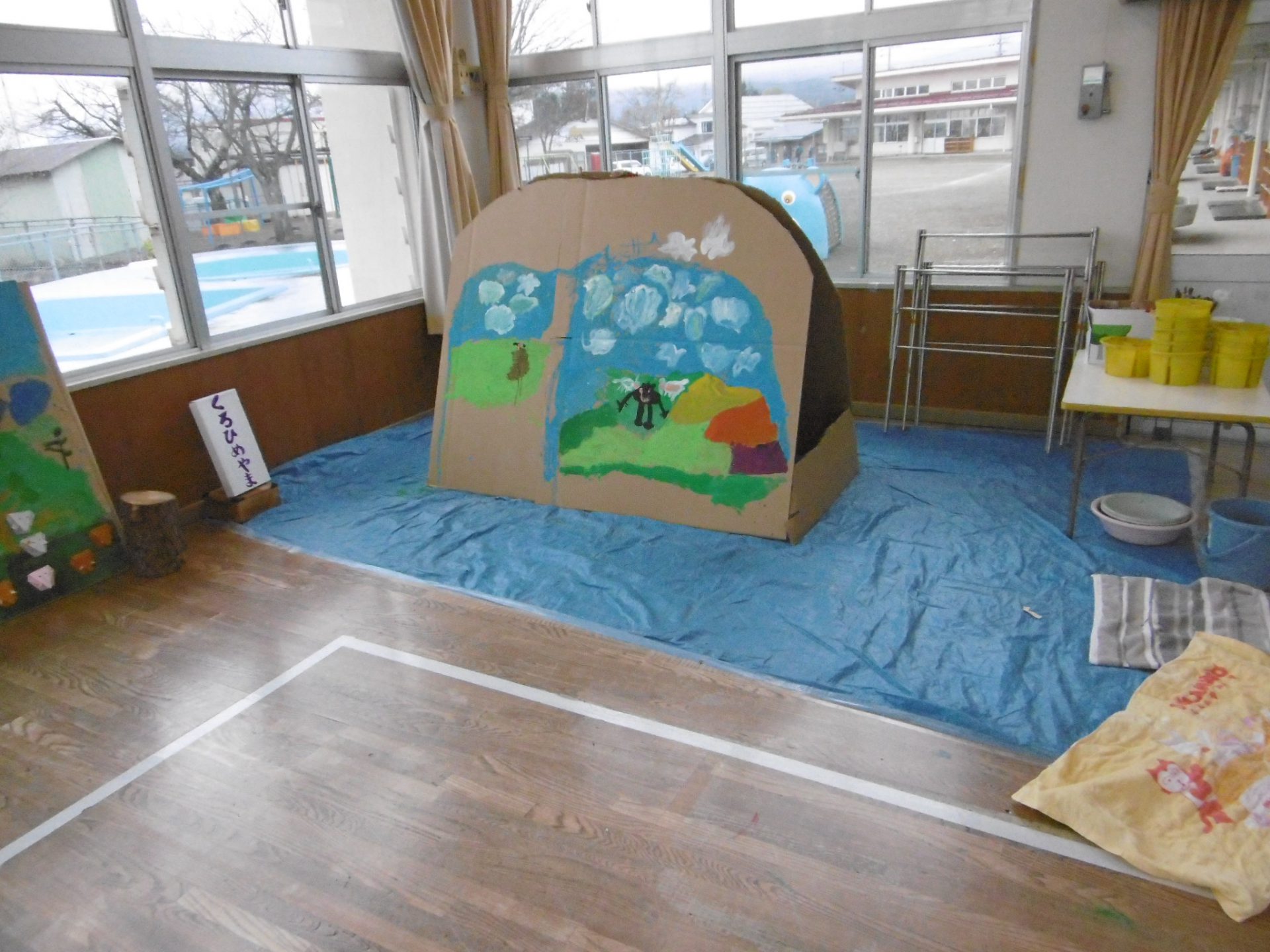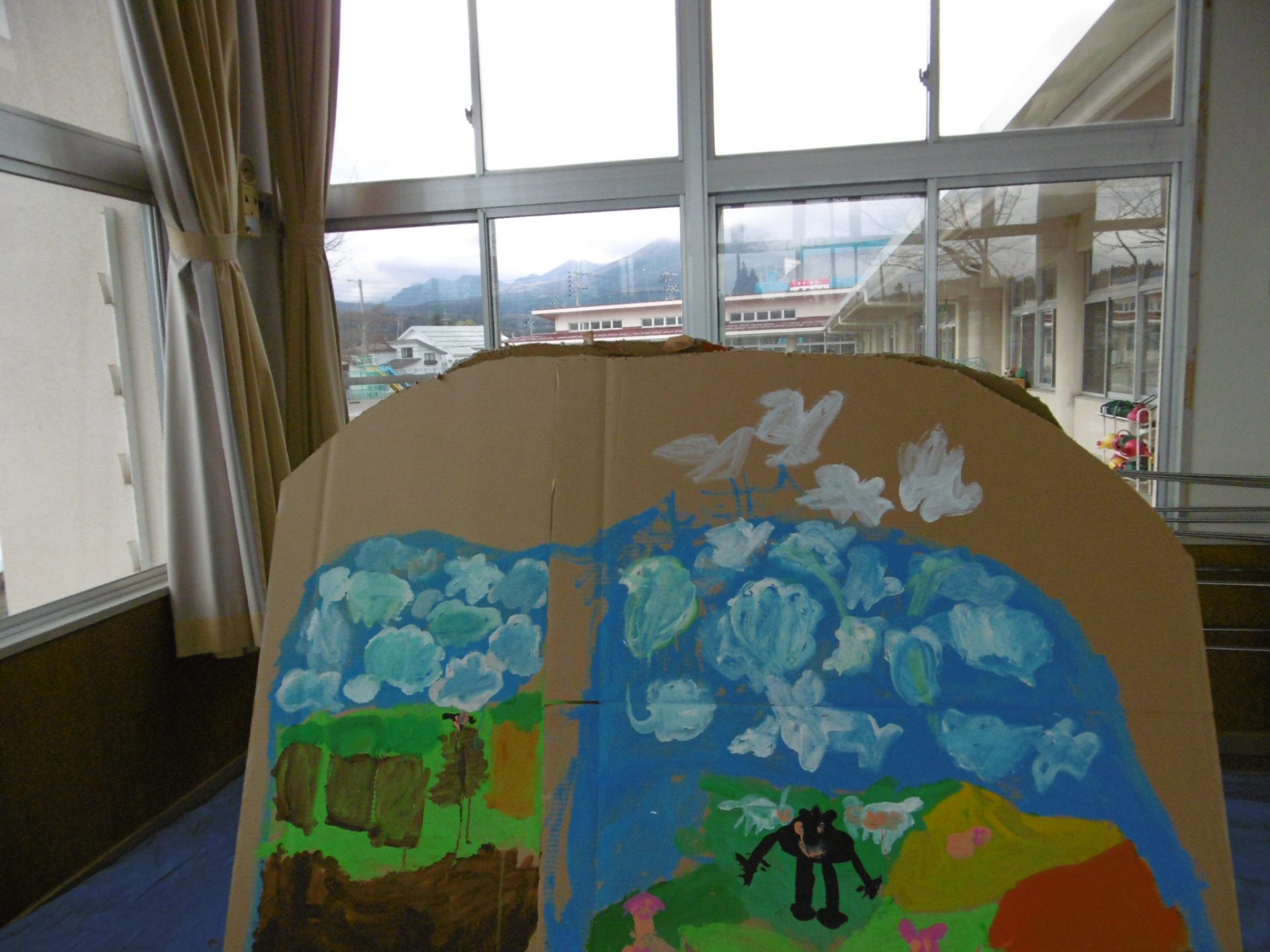 ダンボールを山の形にし、窓から見える黒姫山を見ながら描いています。作品の中心部に見えるのはクマとオオカミだそうです。