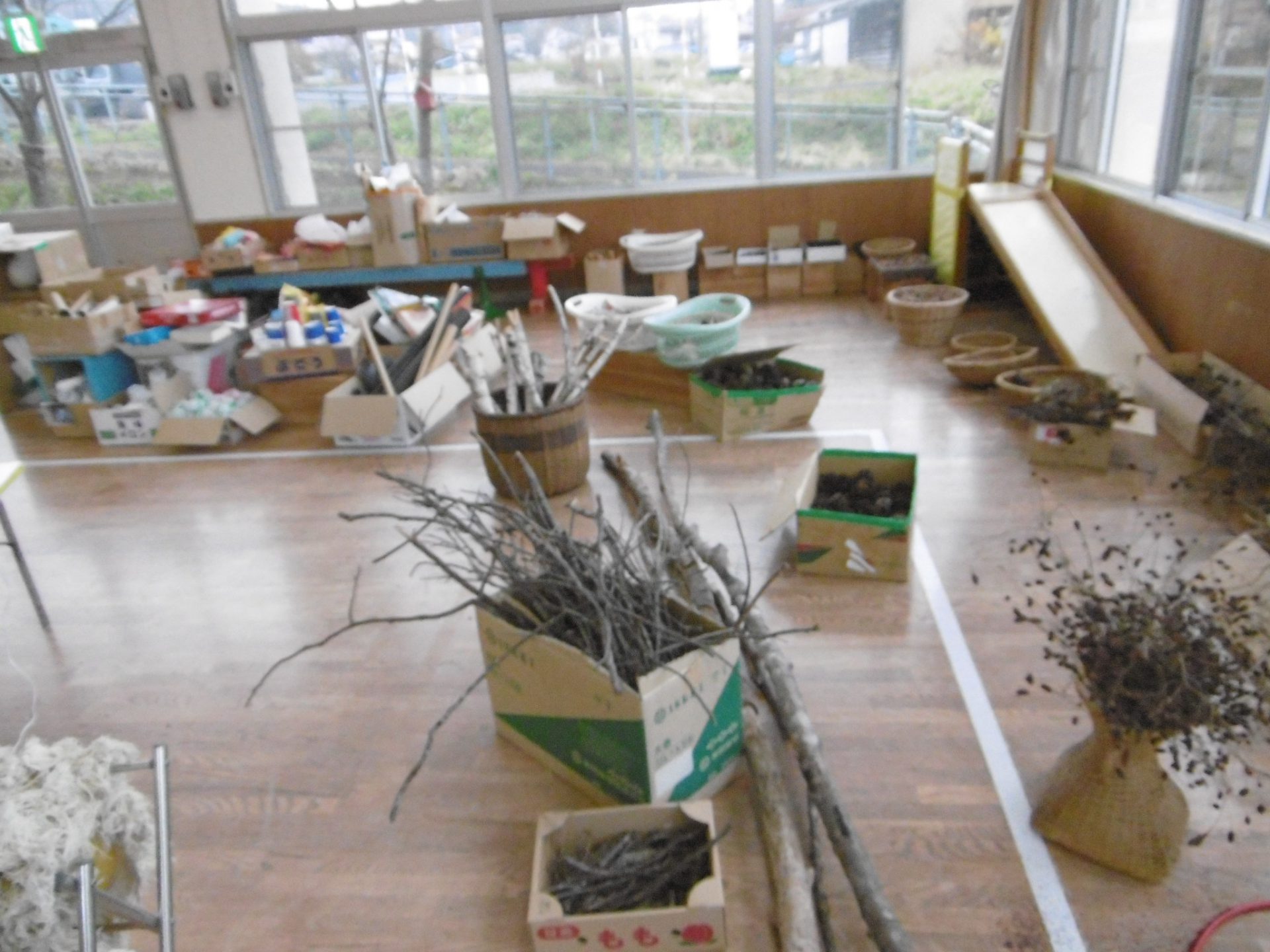 頂いた廃材、自然物、他にも色々な材料、道具が置かれています。
