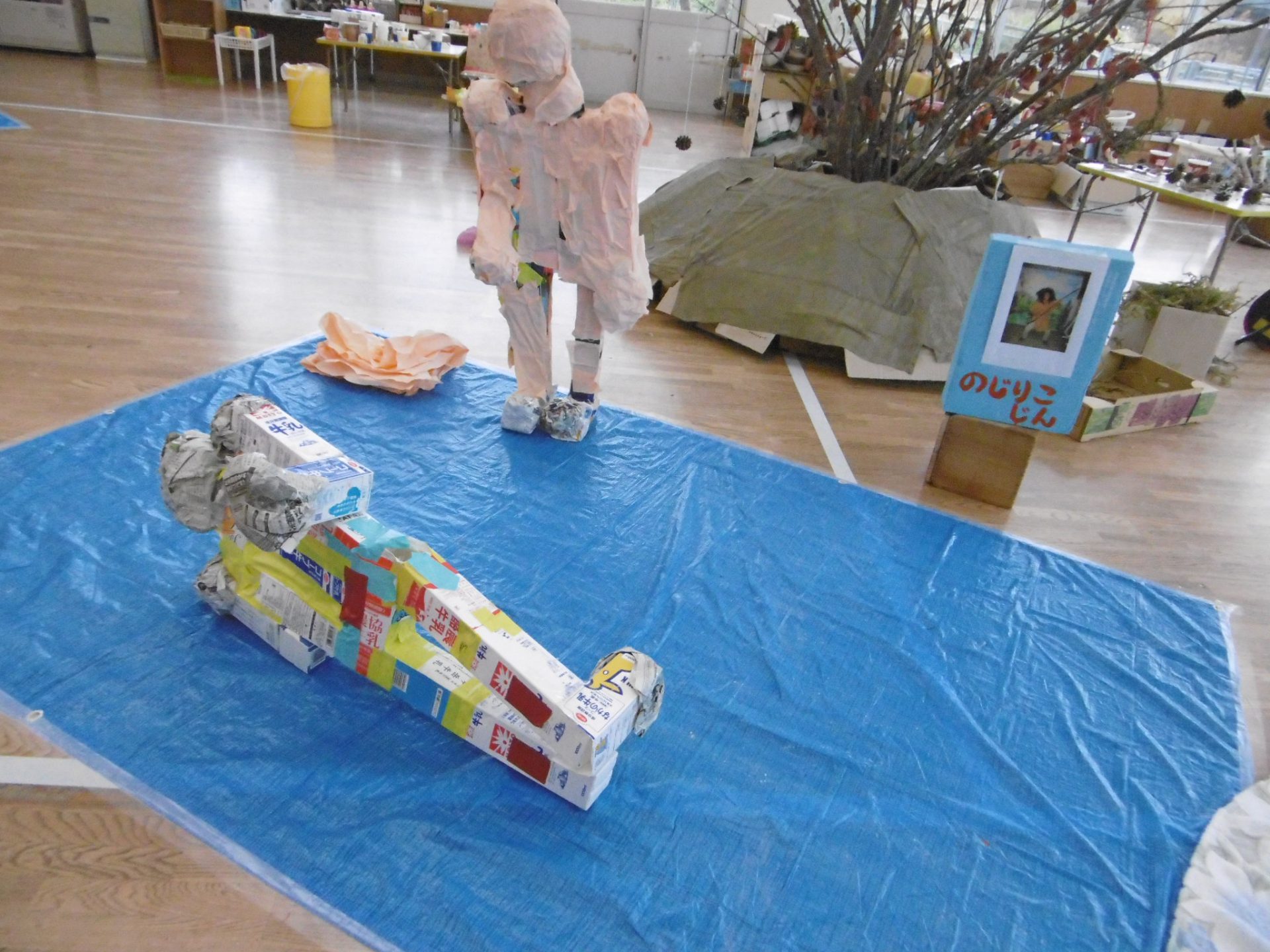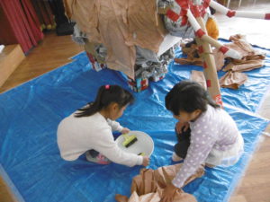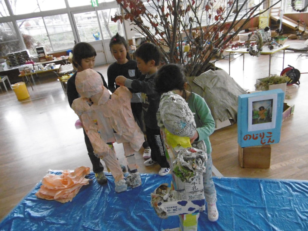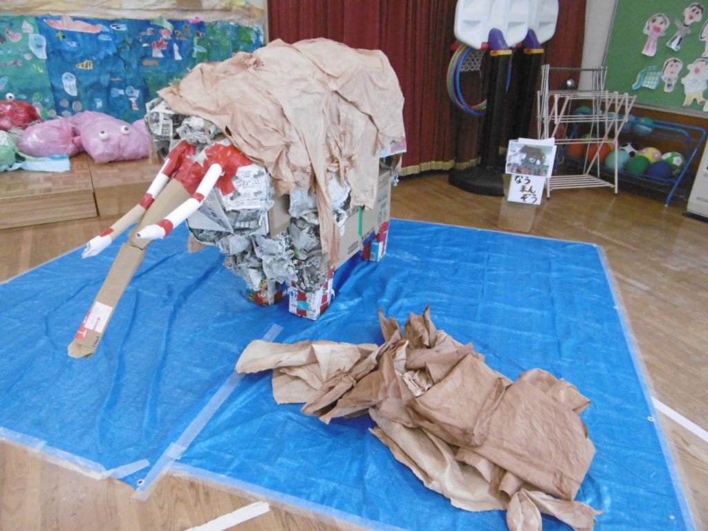 このグループでは牛乳パックを使って体を作りました。『人間の体には角がないから角のところを新聞紙で丸めていこうよ』と、自分達の体を見ながら意見を出し合い作っています。二体作っているのですが、それぞれ格好が違うので、出来上がりが楽しみです♪