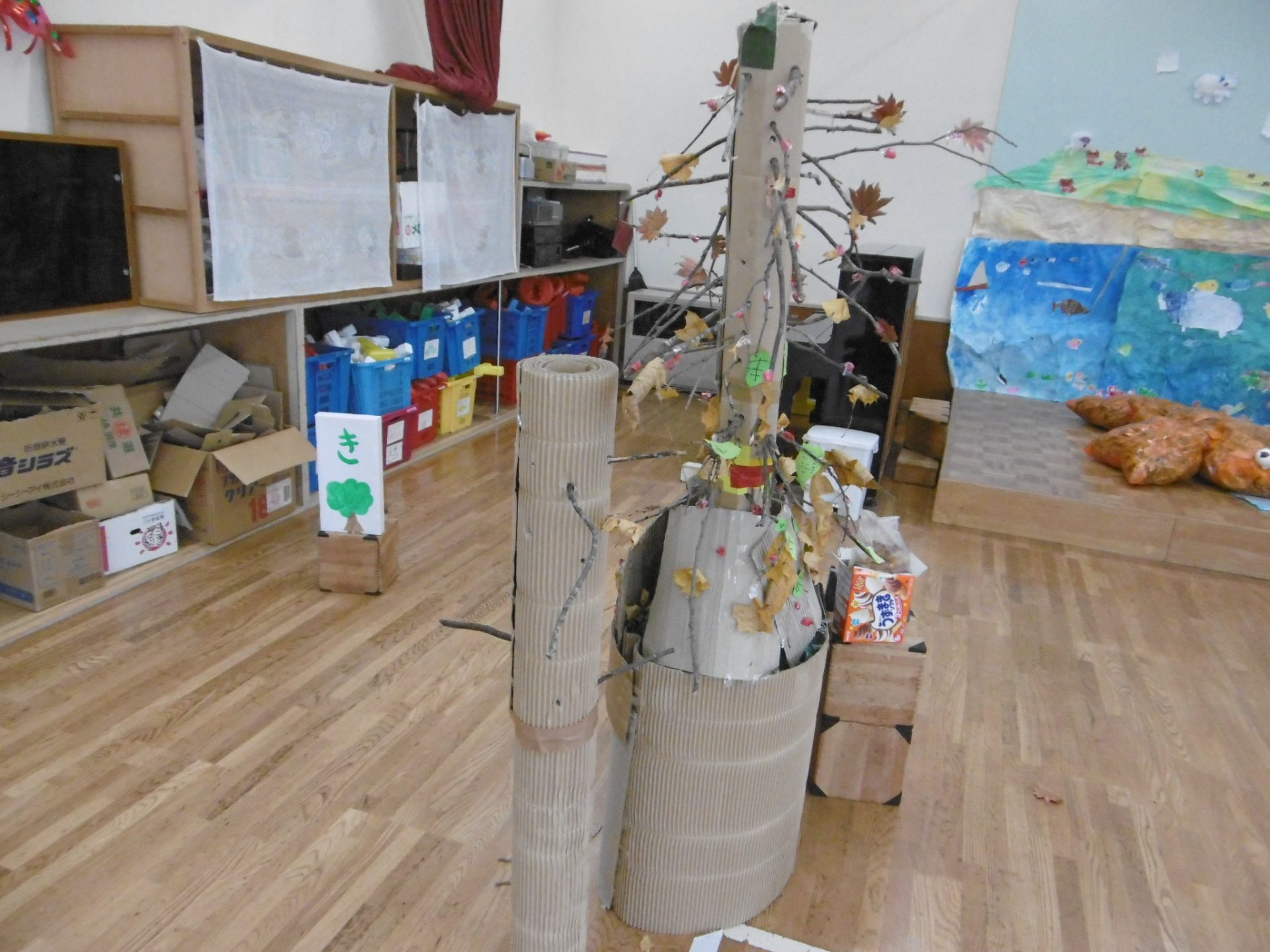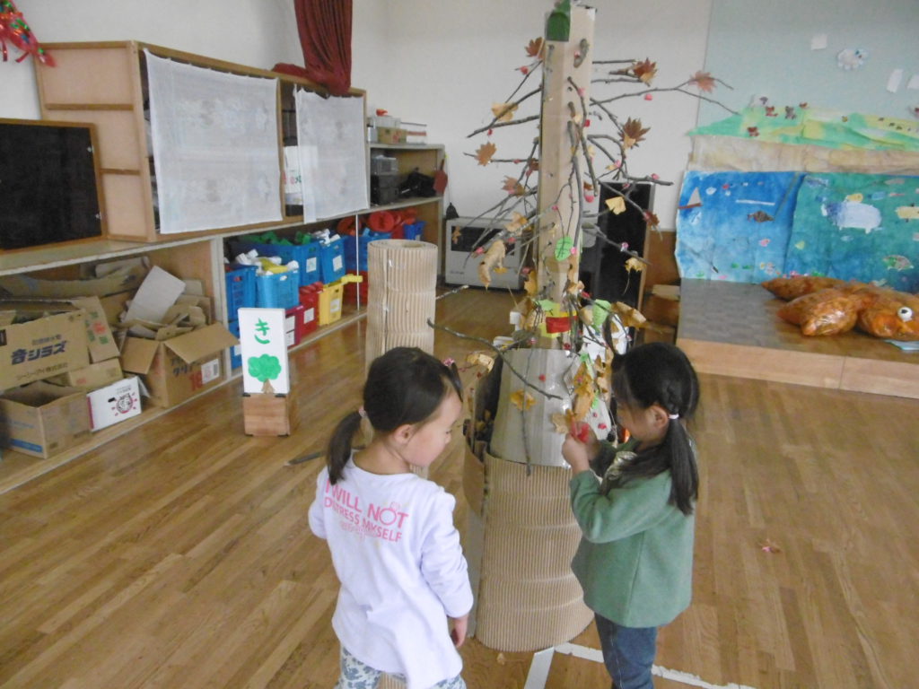 『木を作りたい』の言葉にビックリしました。木をどうやって作っていくんだろう?と見ていると、方段ボールを丸め、そこに千枚通しを使って穴を空け、枝を差し込んでいました。すごい発想力!葉っぱは散歩でとってきたもので、友達と役割分担を決めて黙々と作っています。