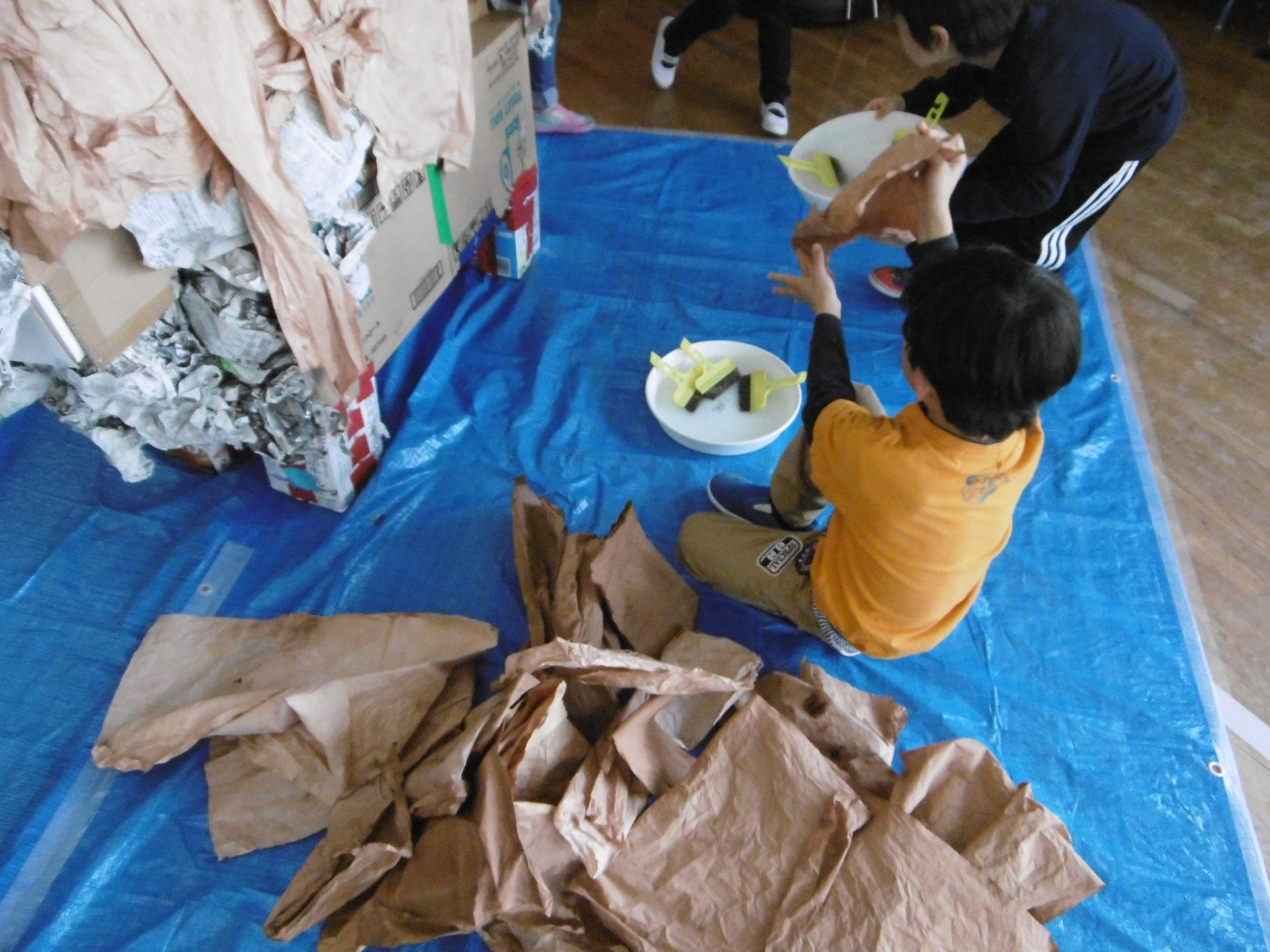体の色は茶色に染めた障子紙を貼っています。糊付けも協力してやっています。
