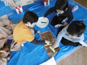 上の写真は、大きなダンボールにみんなで絵の具を塗り、ナウマンゾウが住んでいたであろう世界を表現してみました。