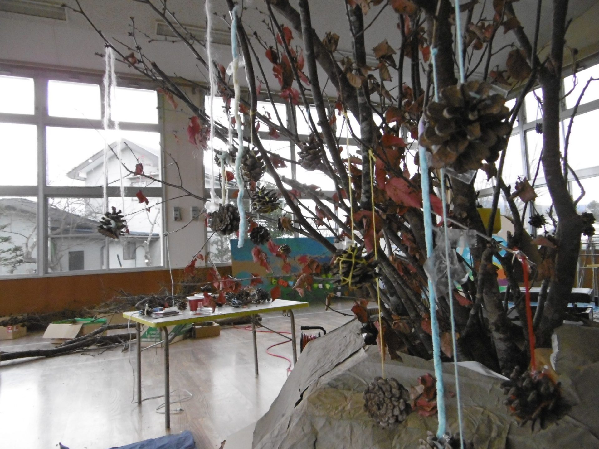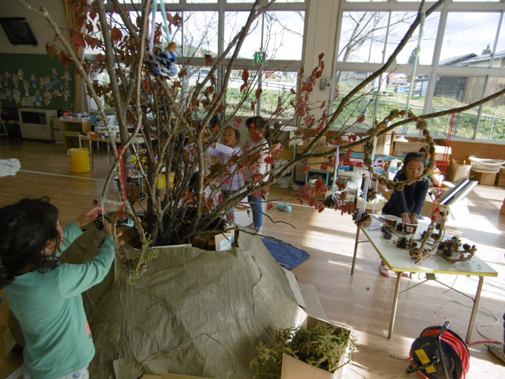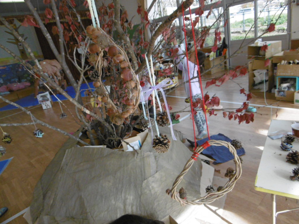 リースや松ぼっくりが枝につけられています。『リースとか可愛いね』と、友達の作品を見て感想を伝え合っていました。