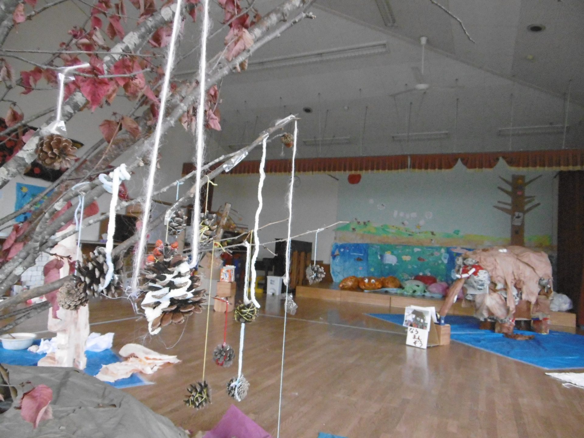 年長児交流会で頂いたナウマンゾウの折り紙を折った時に『これ、みんなで飾りたいね』という子どもの声をきっかけにみんなで作ることに♪