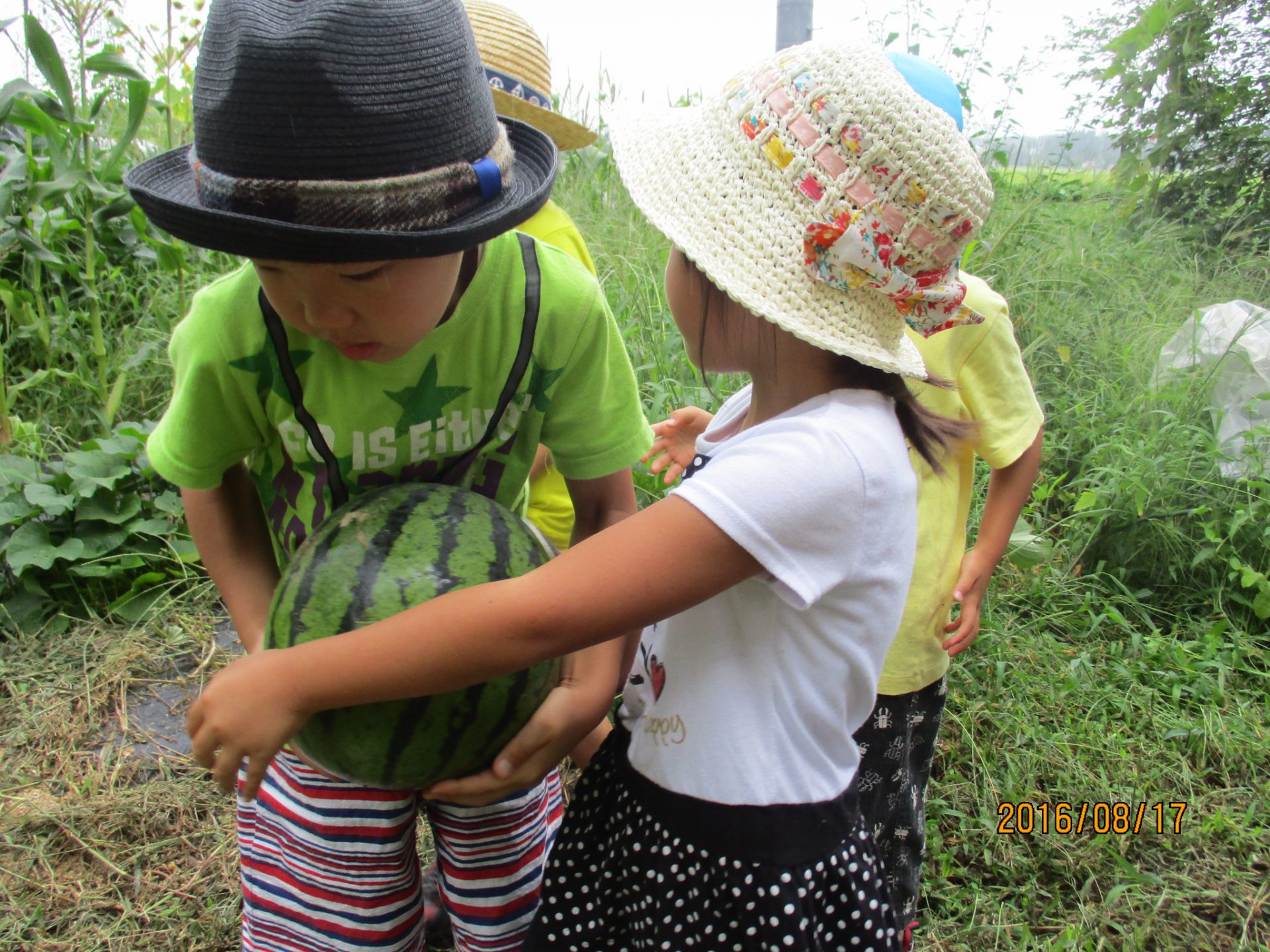 お盆休み明け、元気いっぱいに登園してきた子ども達とすいかを収穫しました。