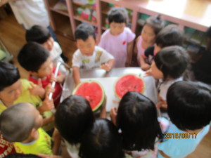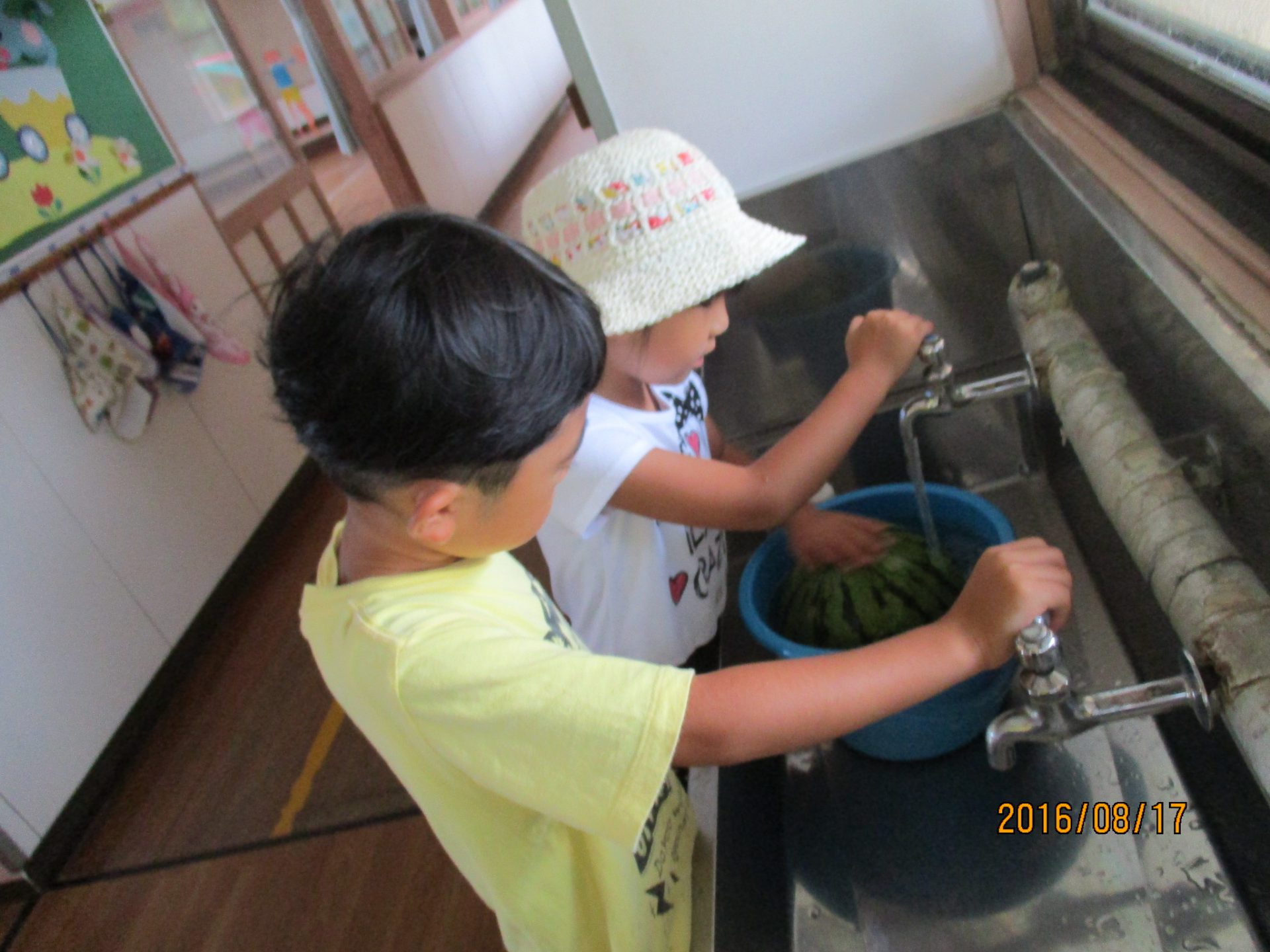 「早く食べたいな。」「冷たい方がおいしいからね。」と4歳児は5歳児に諭されながらも、すいかが冷えるのを待ちきれない様子でした。