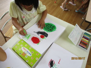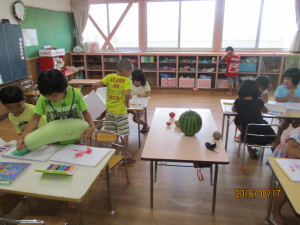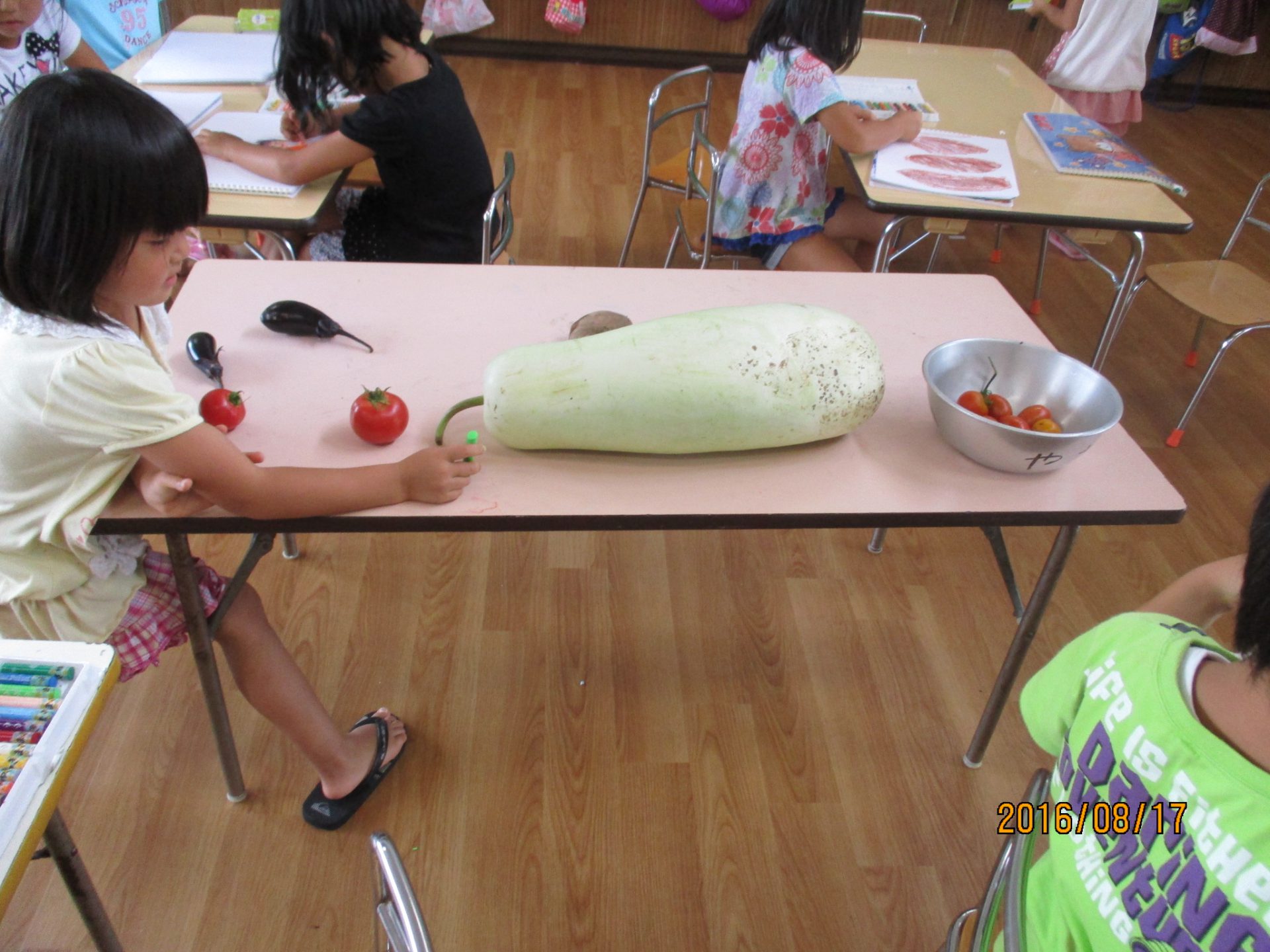 雨が降り、今日はお部屋でお絵描きをしました。自由画帳を持ってきた子どもたちが描いたのは、もちろんすいか。そんな様子を見て、保育士が本物のすいかを持ってくると「トマトも描きたい!」「ゆうがおも!」と今まで収穫した野菜も次々と机の上に並び、みんなで好きな野菜の絵を描きました。