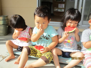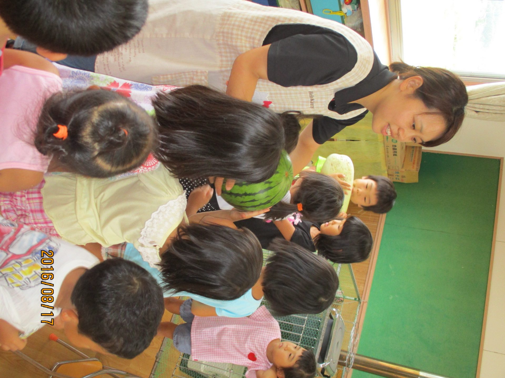 1~2歳児のお友だちも来て、お兄さんお姉さんにいろいろ教えてもらいました。自分の顔より大きいすいかにびっくりです。