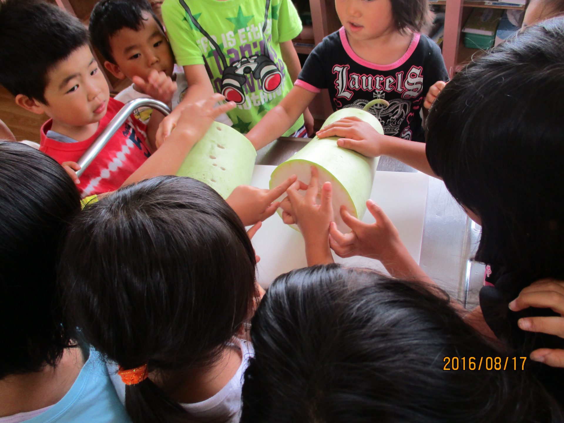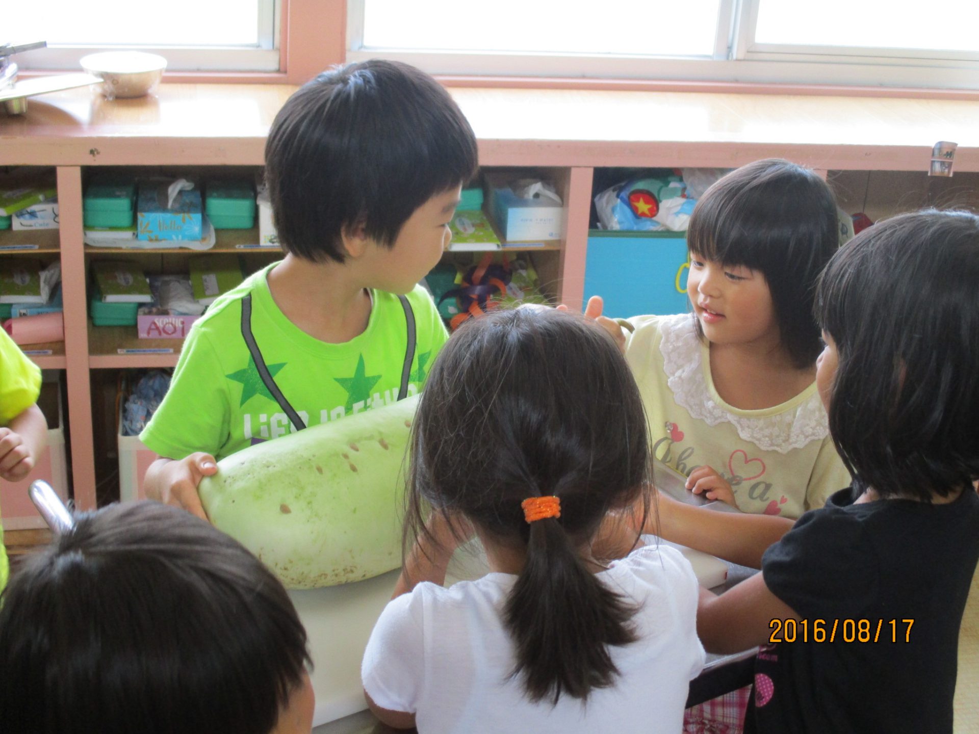 ゆうがおとすいかを一緒に切る中で、思ったことや感じたことを伝え合い、それぞれの野菜の特徴を見つける事が出来きました。ゆうがおは明日の給食に出るので子ども達の反応が楽しみです。