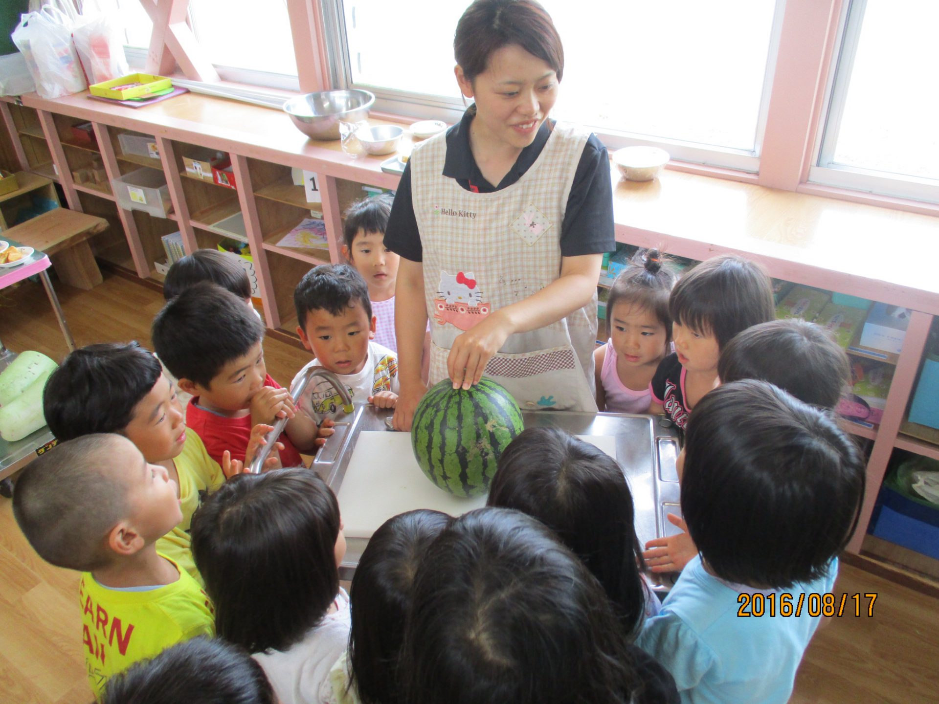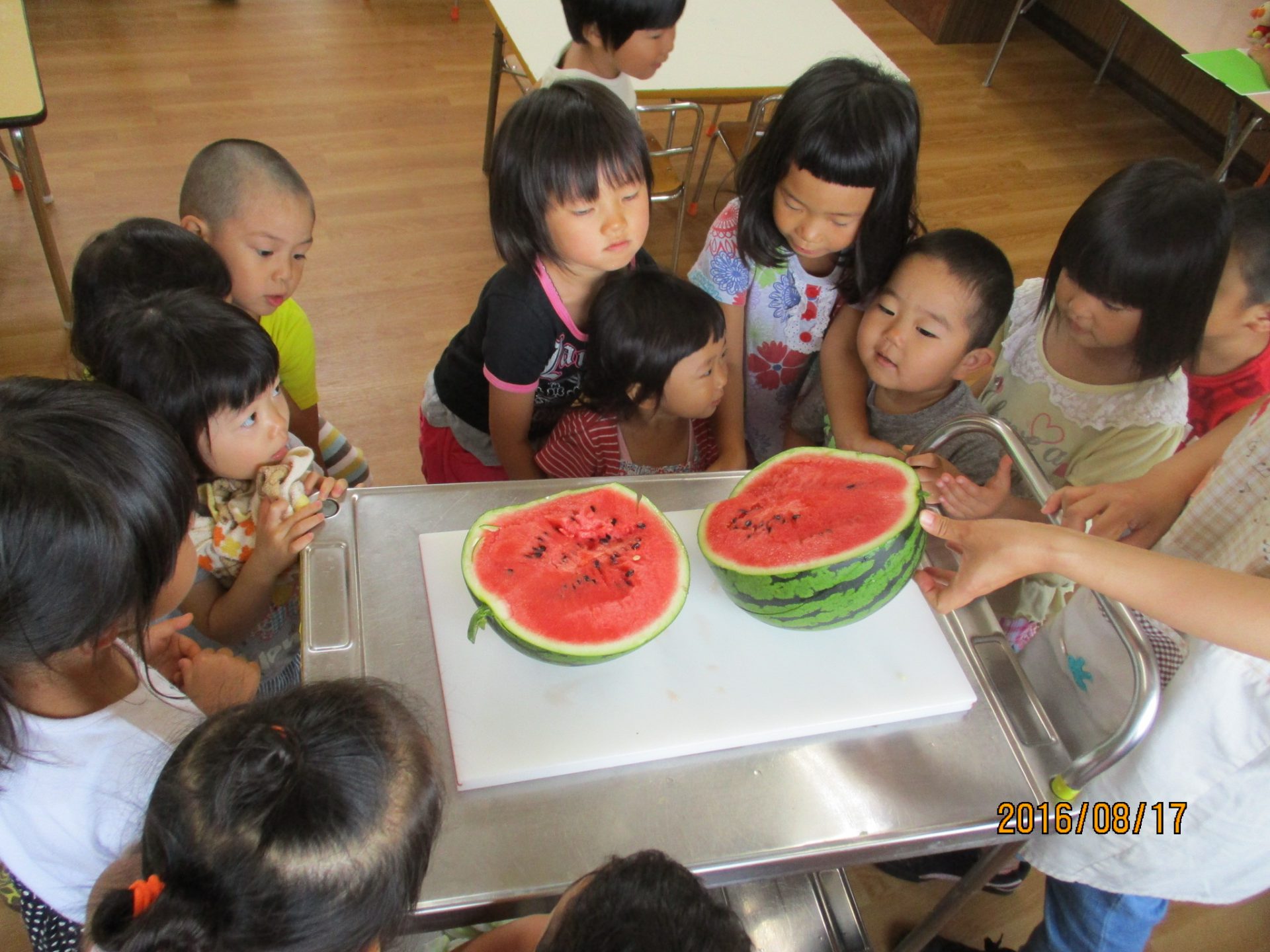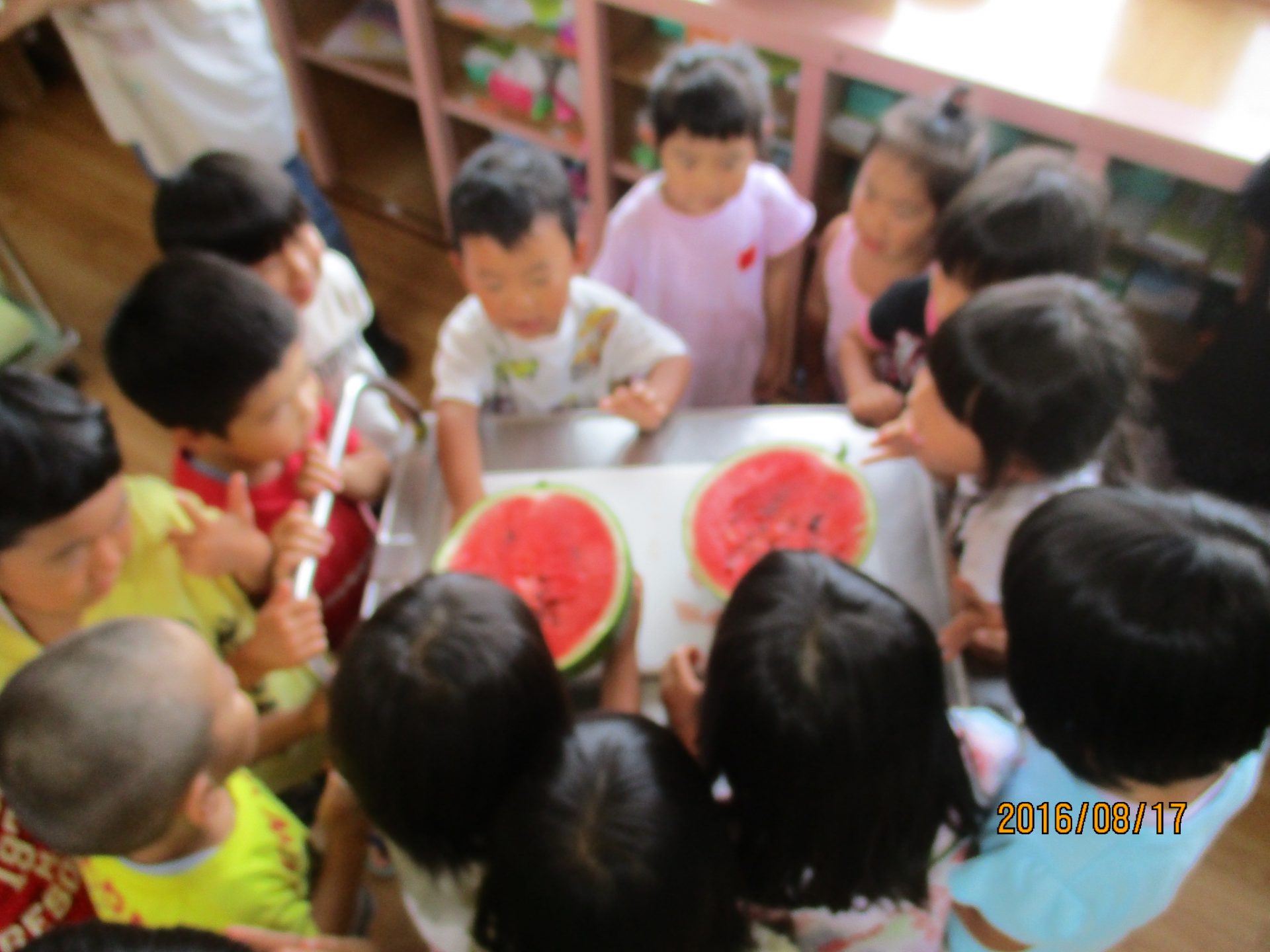 保育士「すいかの中は何色かな?」子「赤!」「黄色かも!」