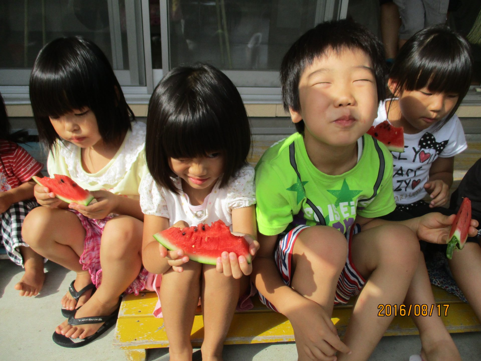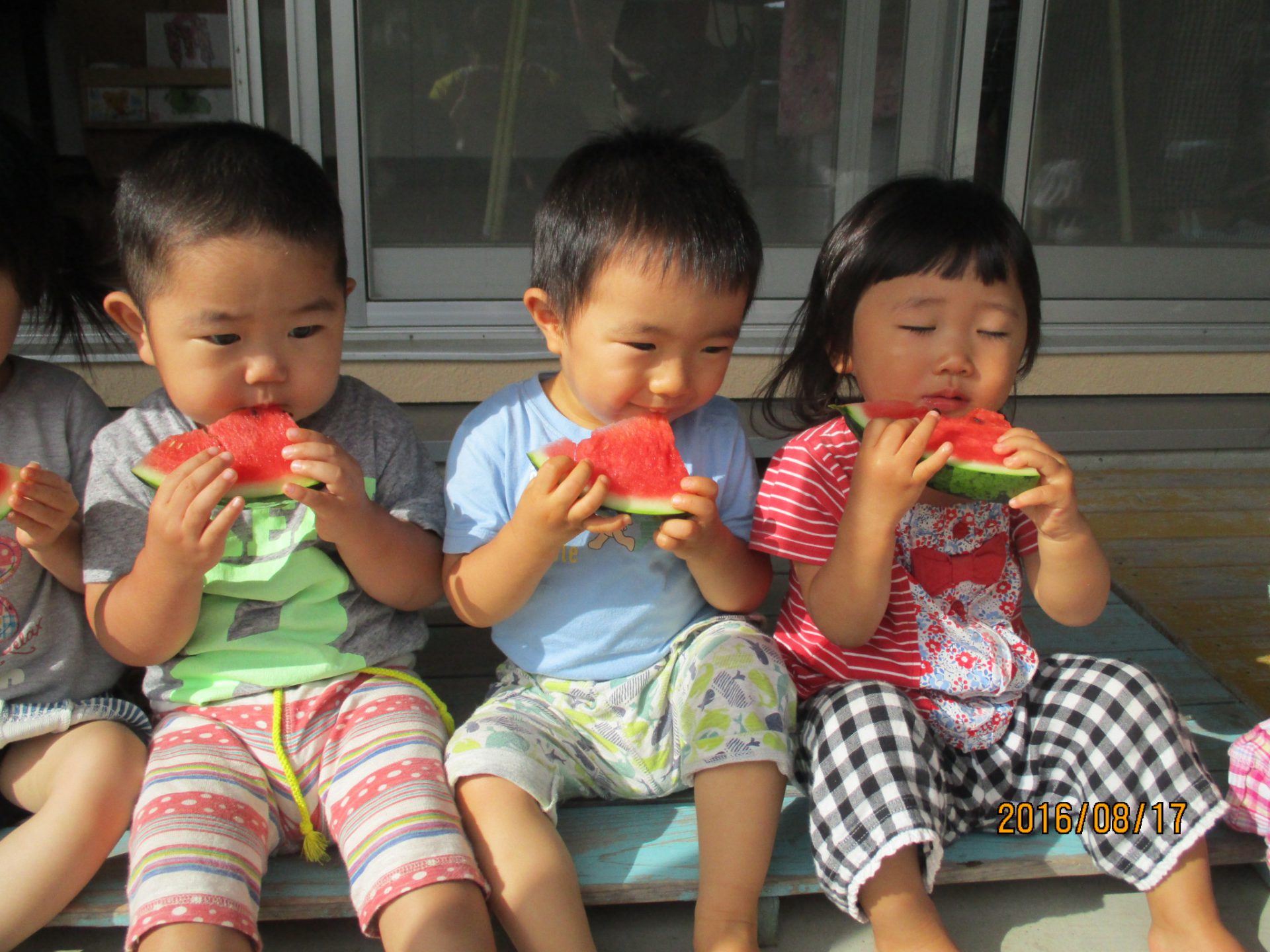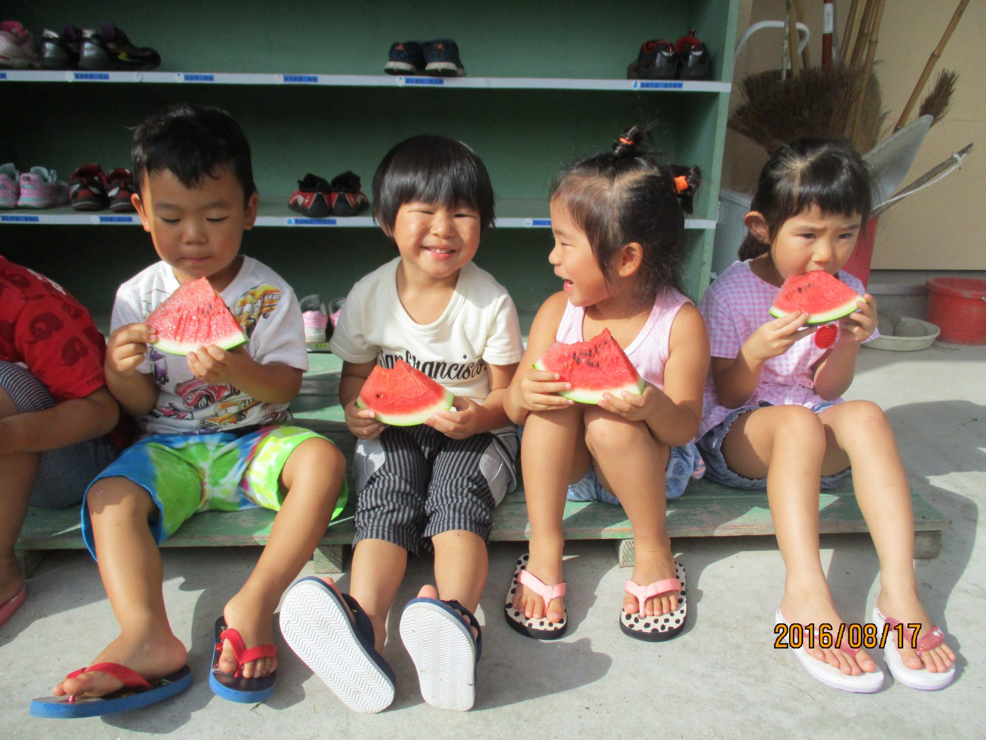 保育士「すいかの中は何色かな?」子「赤!」「黄色かも!」