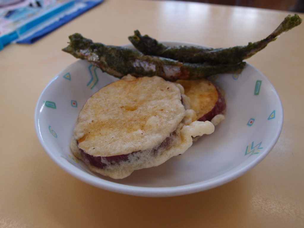 天ぷらはこの時期おいしいさつま芋と、青のりの入った衣で揚げたししゃもです。