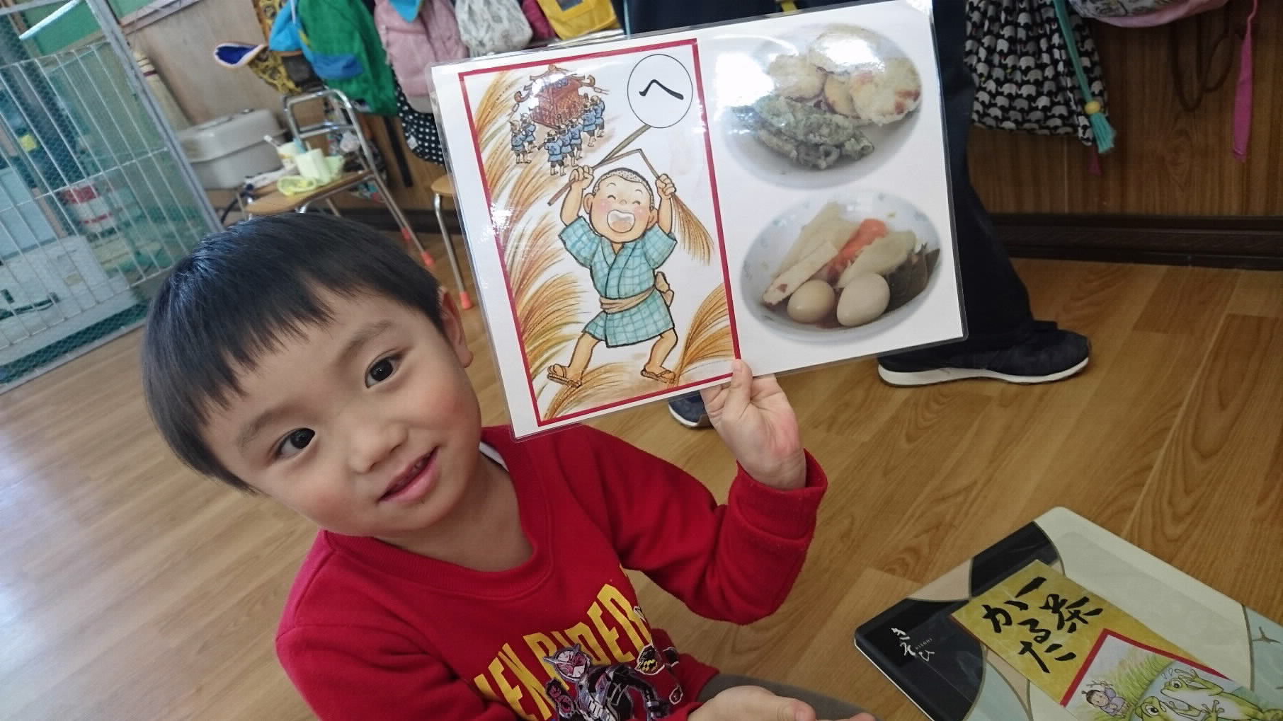保育園にも置いている一茶かるたの俳句にちなんだ給食を提供しています。