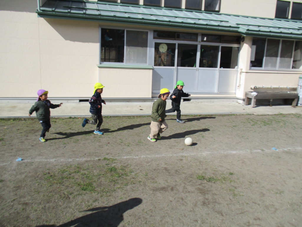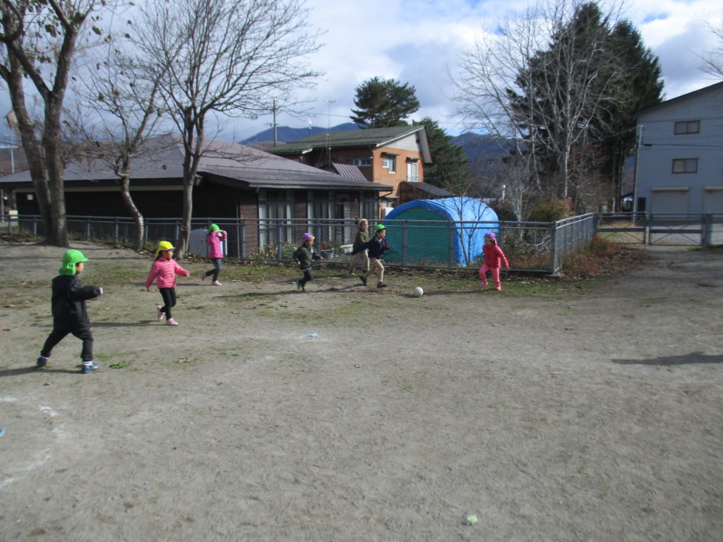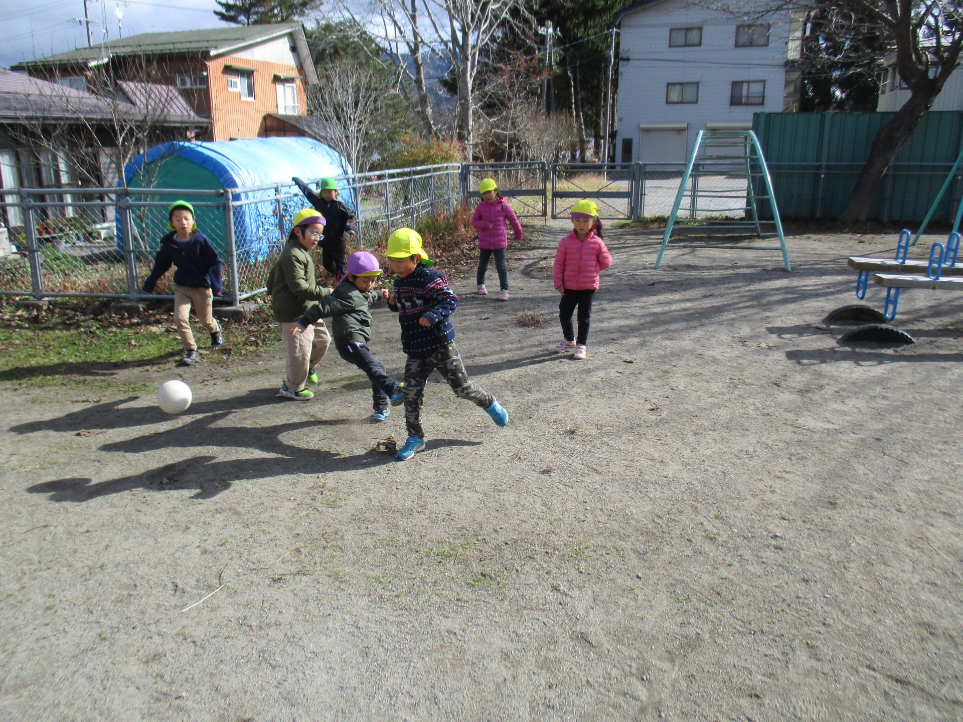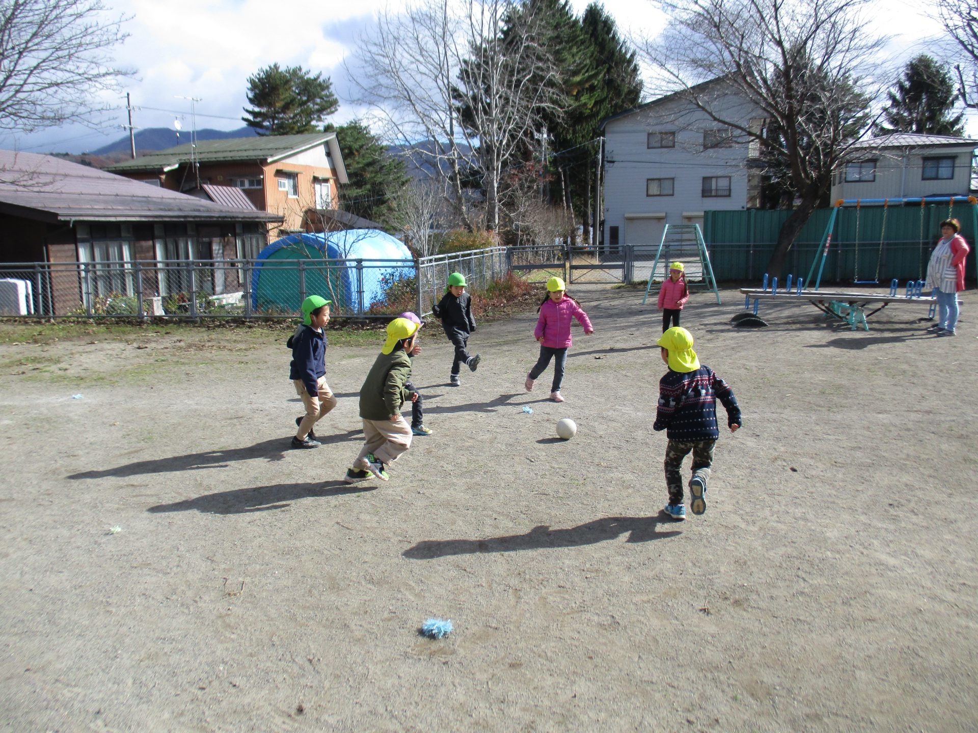 風もだんだんと冷たくなり、外に出ることをためらいがちですが、子ども達は元気いっぱいで、朝の支度を終わらせて外に出てサッカーを楽しんでいます。