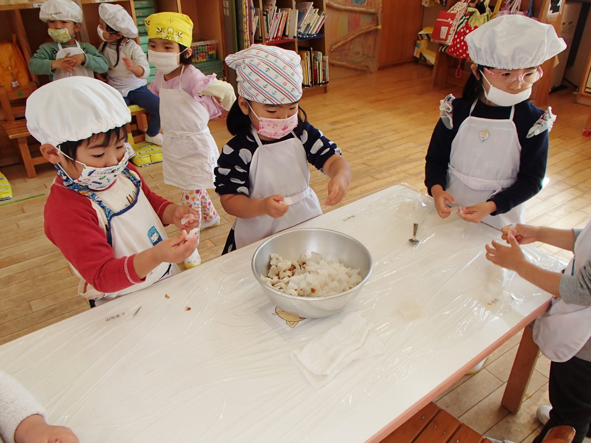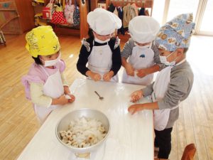 今年の畑活動の終わりとして収穫祭を計画し、2歳児も含め各学年でかかわれるクッキングをしました。