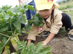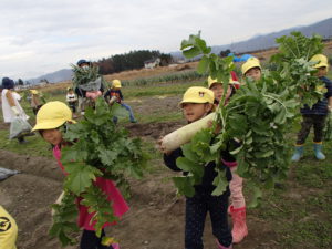 年少組の作業が終わった頃、丁度、年長組も大根を切るのが終わり、